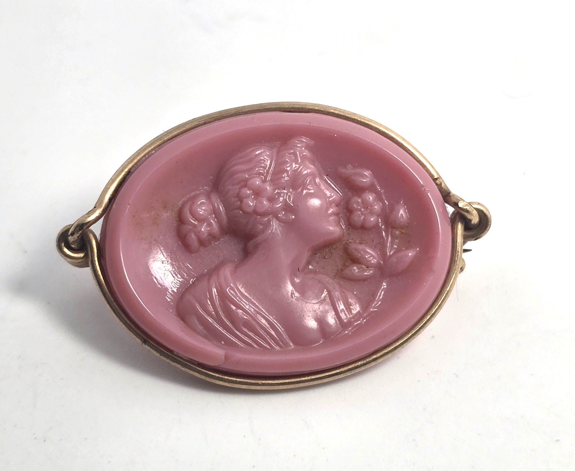 Pink molded glass cameo yellow gold filled wire wrapped Greek Rococo brooch. Good used condition with little signs of normal wear. Small amount of plating loss on the tip of the brooch. Beautiful detailed molded glass cameo.