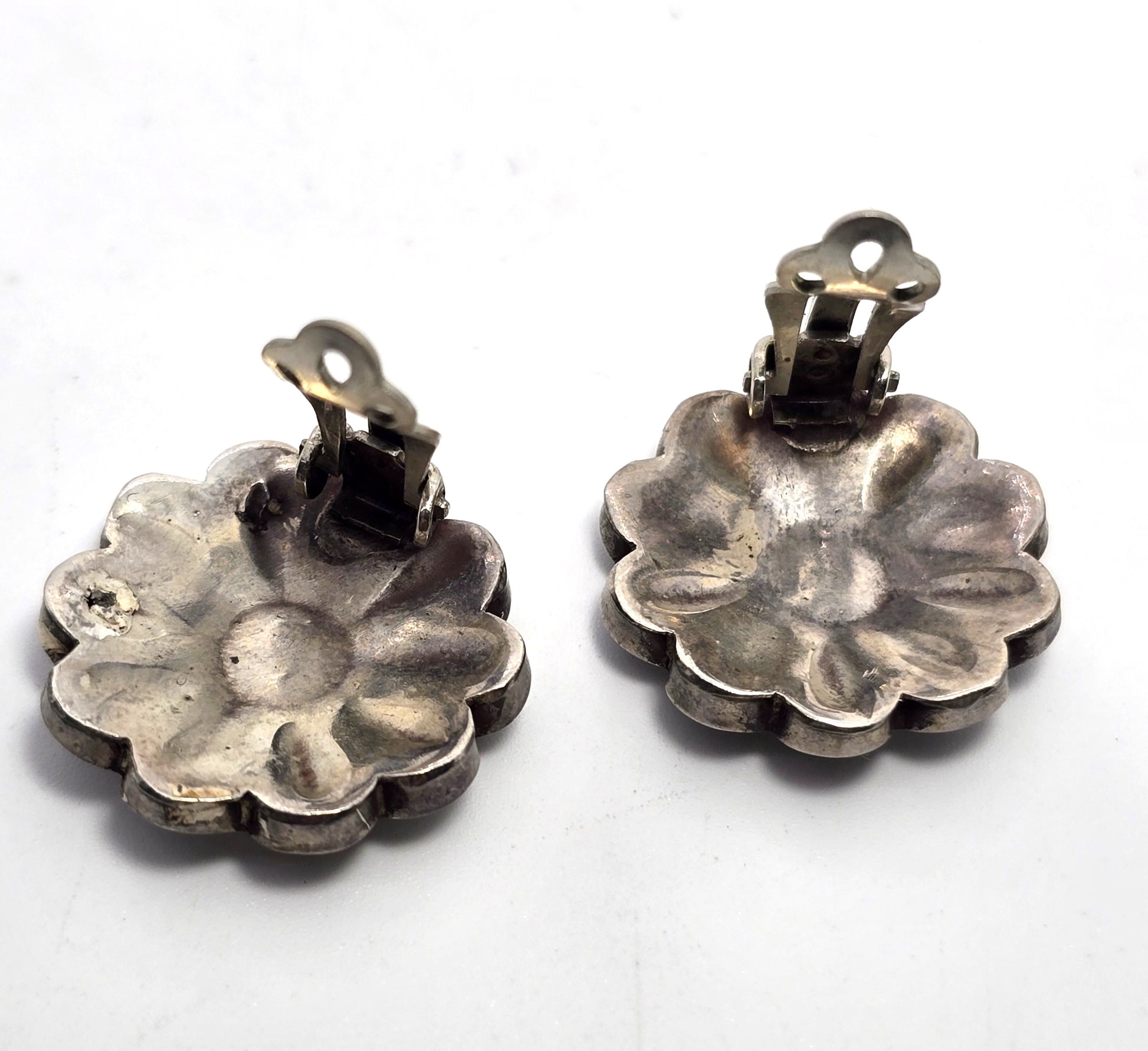 L.L. Dickson Larry and Lorinda Native American Zuni Sterling sun face earrings. These stunning vintage 1960's clip on earrings. Classic Zuni Sun face design. Both designers have passed and these collectable pieces are no longer being produced. They have been published in several reputable Native American collector journals. They have been separated from a signed matching set. This will allow more people to cherish the designers work.