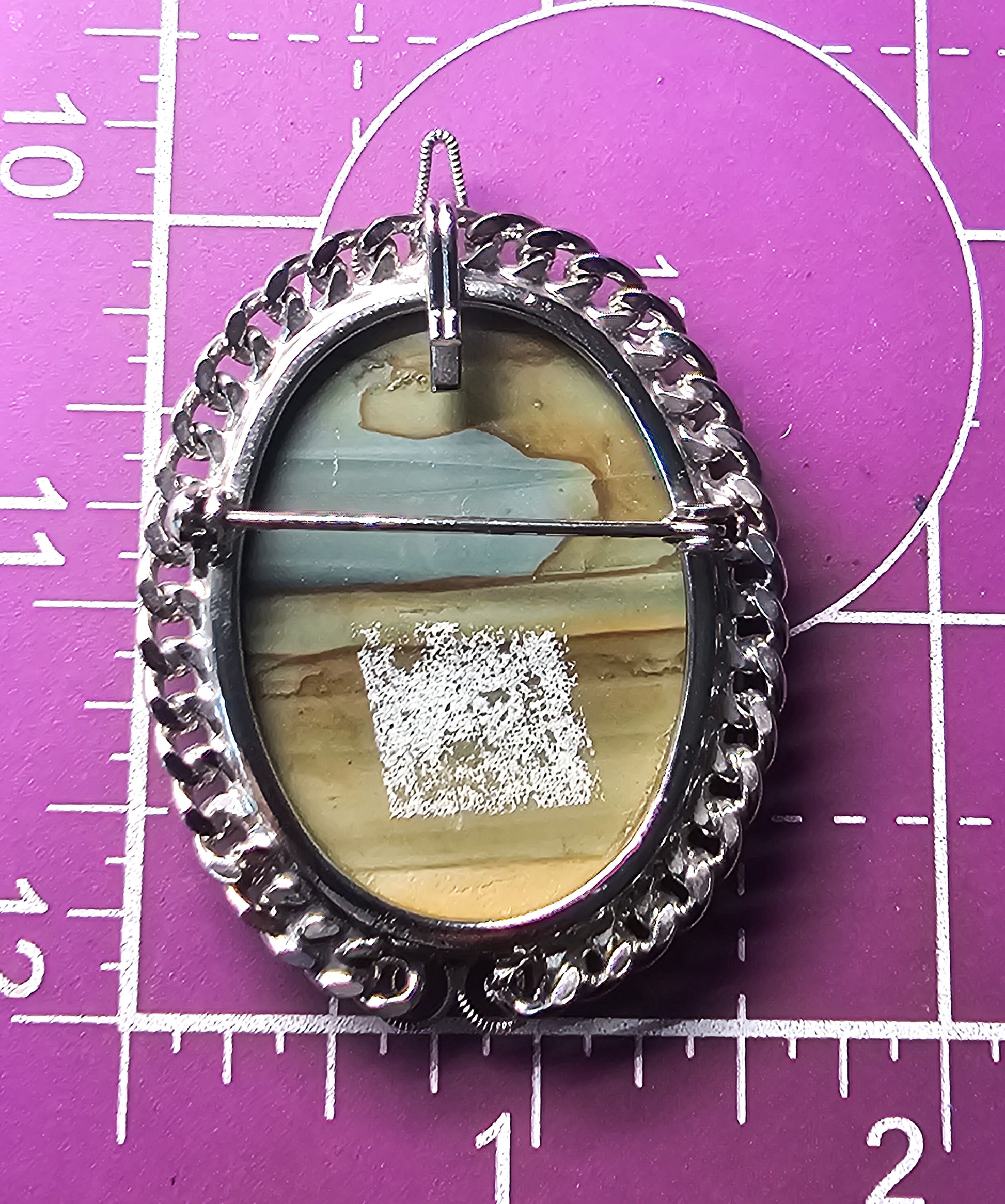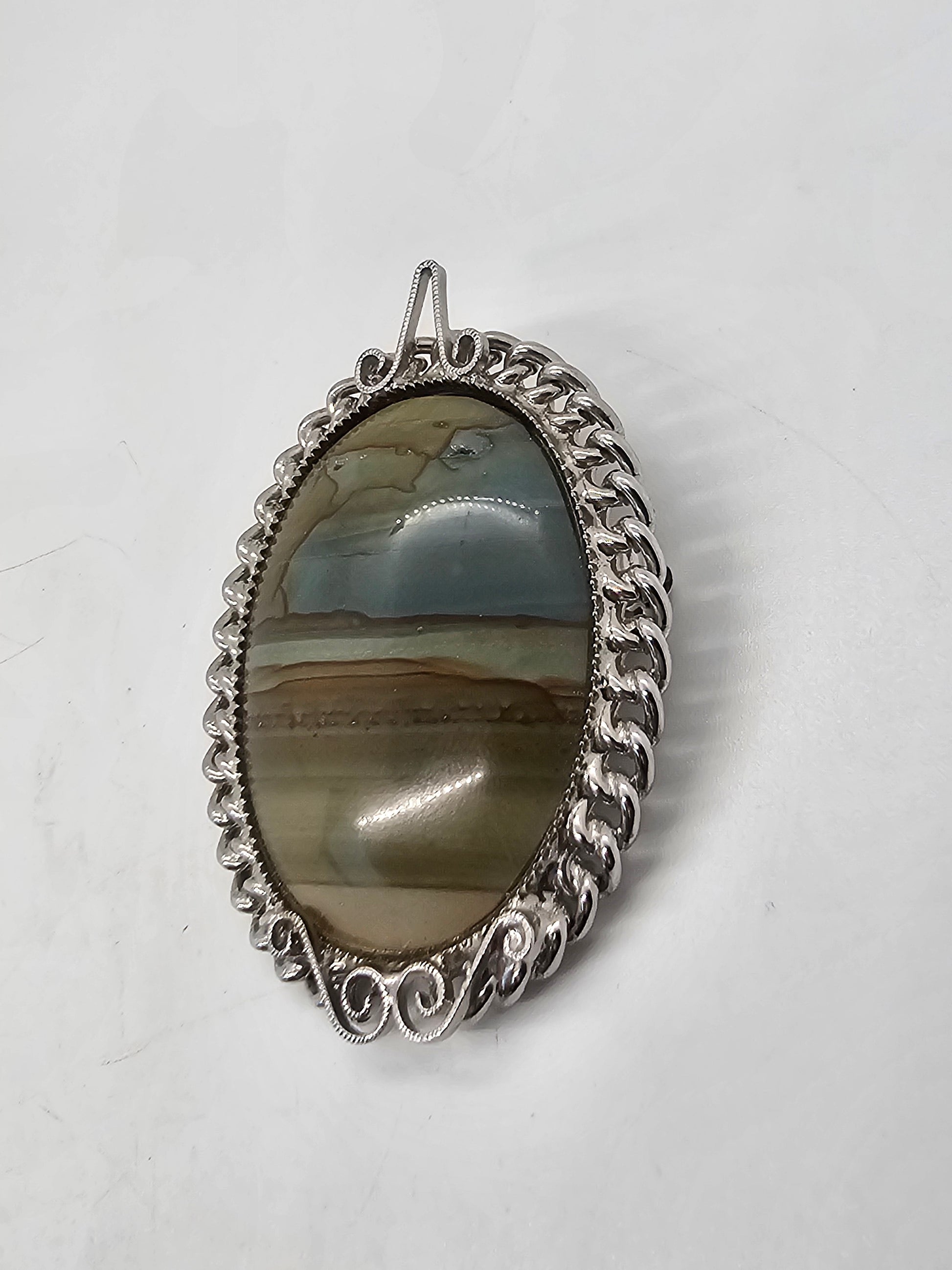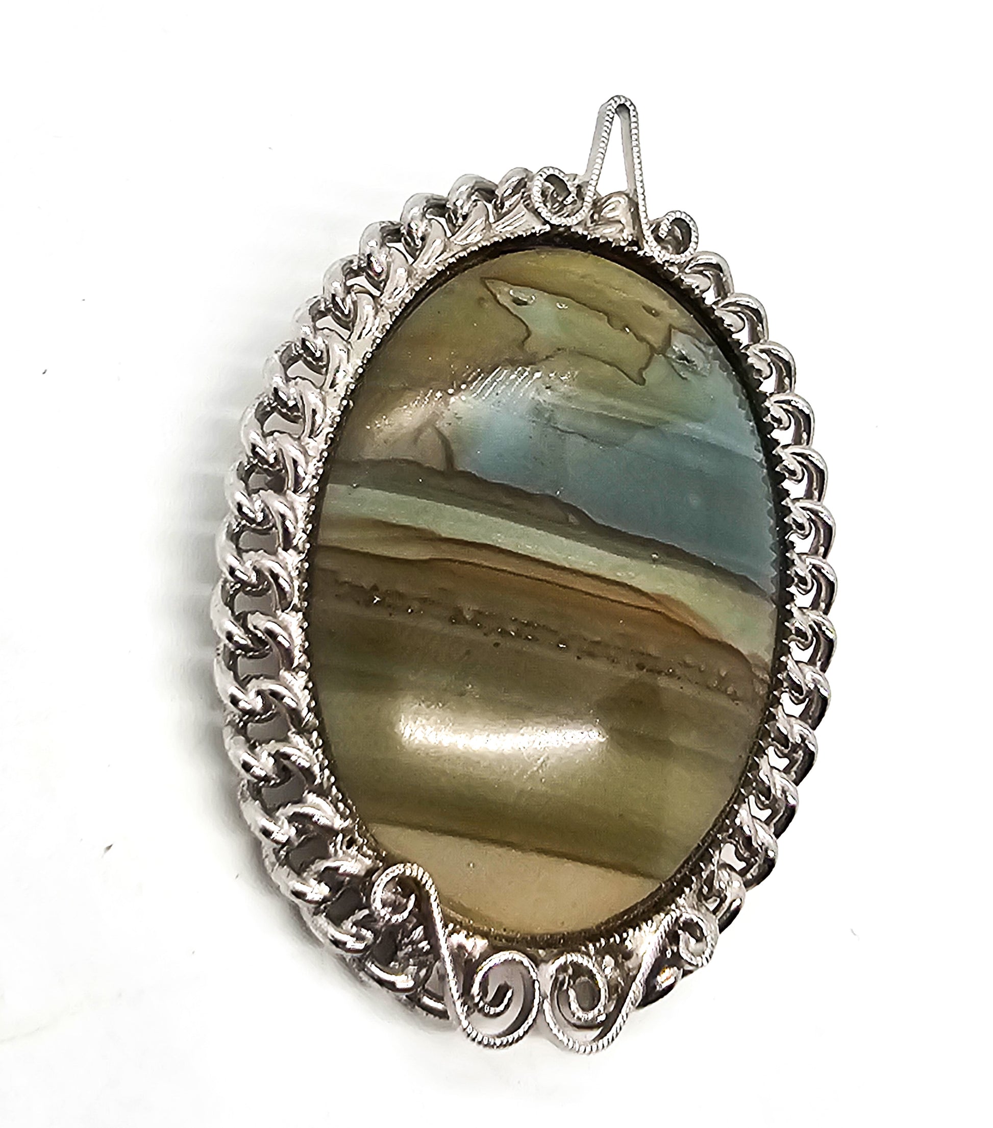 Landscape jasper vintage gemstone convertible silver chain pendant brooch. Good vintage condition with little signs of normal vintage wear. Silver toned metal designed into a stiff chain around the stone. Back has both brooch and pendant fastening.