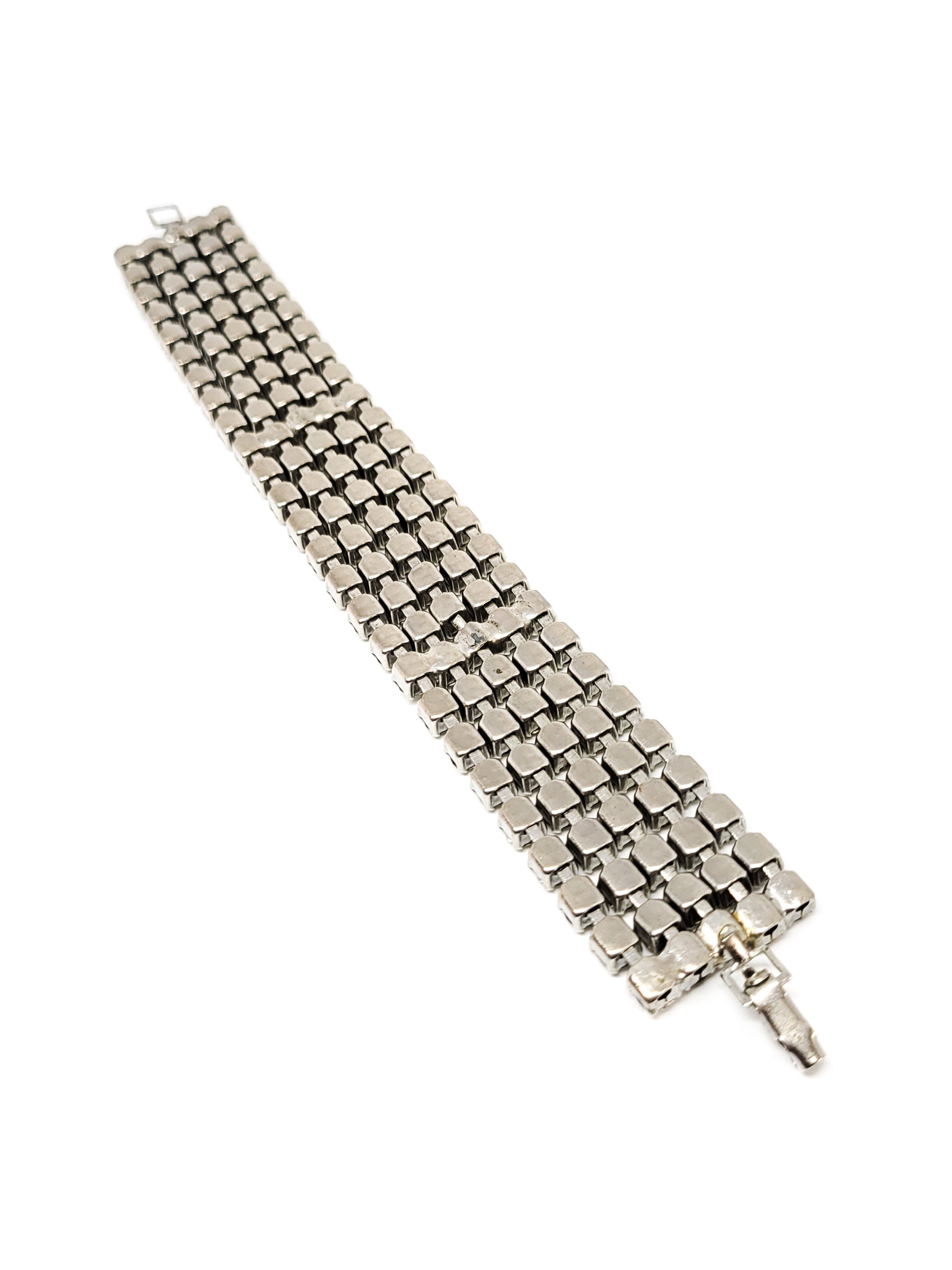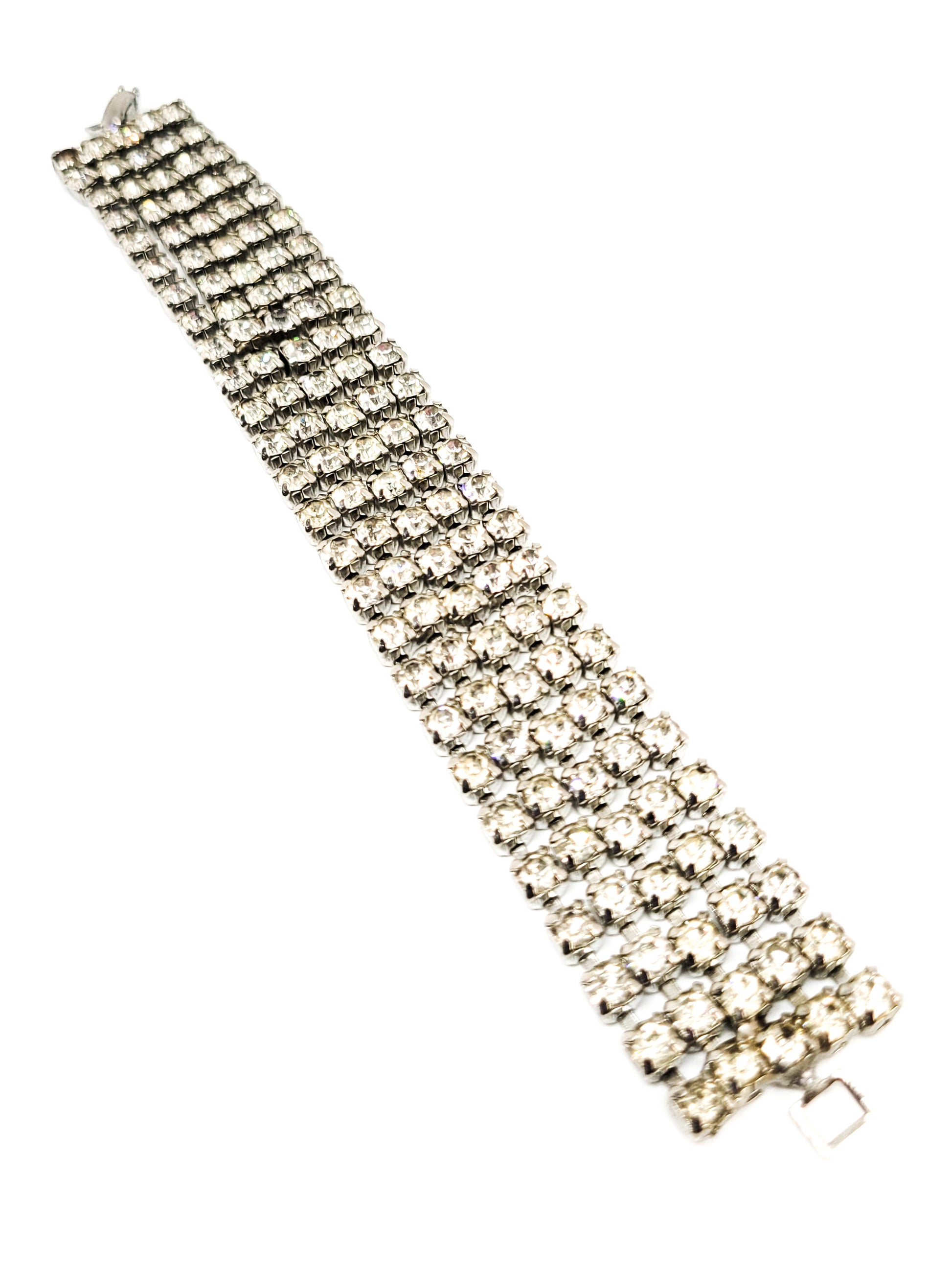 Large 4 row clear rhinestone vintage tennis cuff bracelet. This four tier bracelet features 4 bands of clear rhinestone chatons. Good vintage condition with small minor signs of normal vintage wear.
