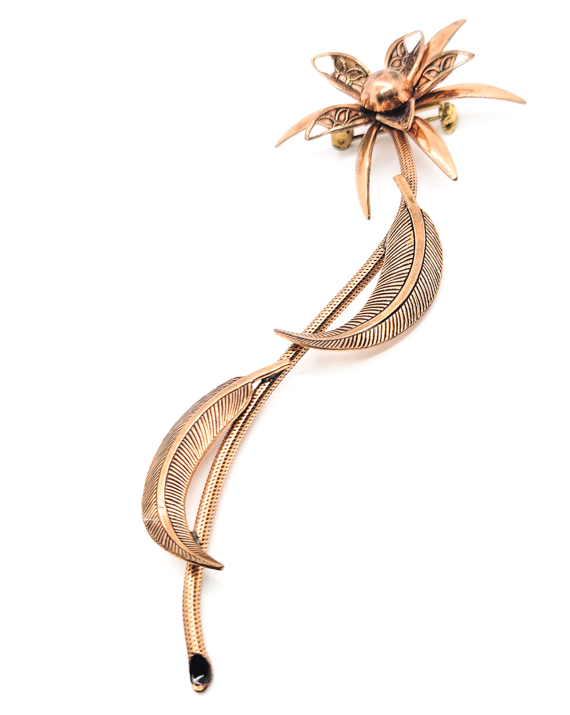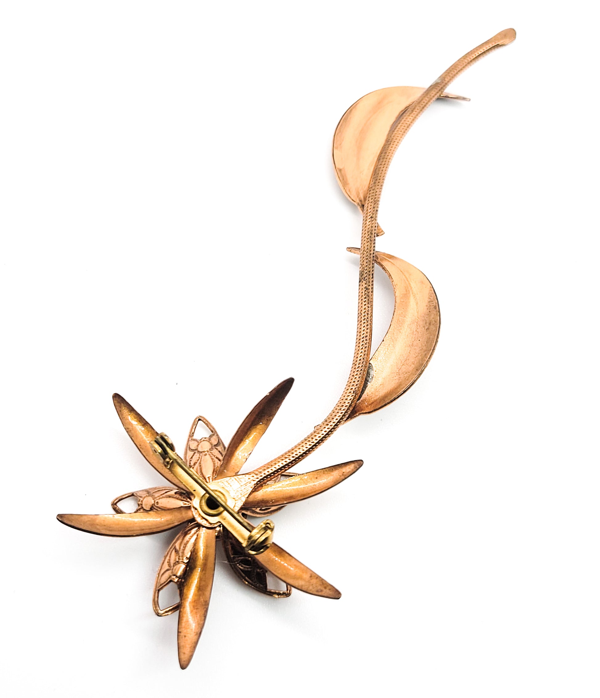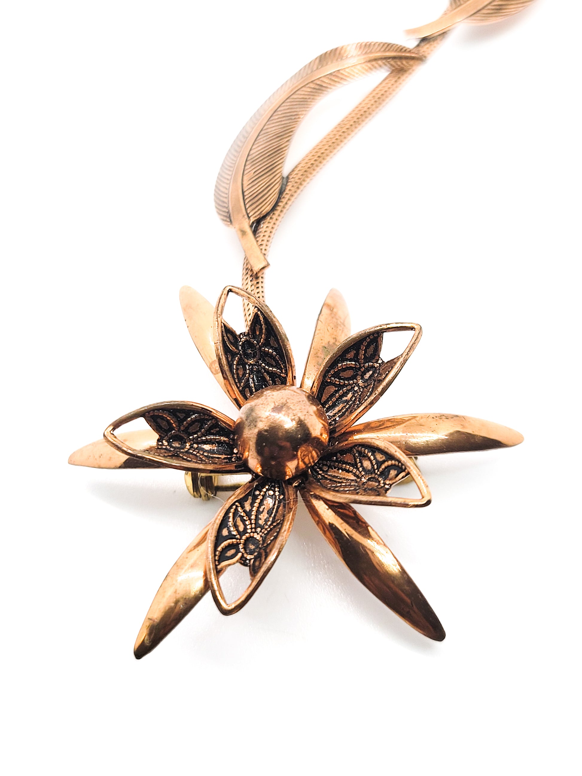 Large copper 3D flower brooch with stem and leaves vintage pin 4.5 inches