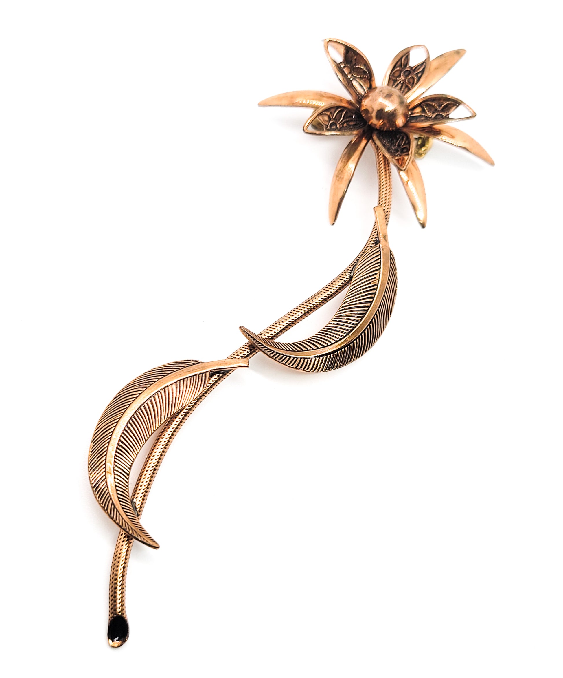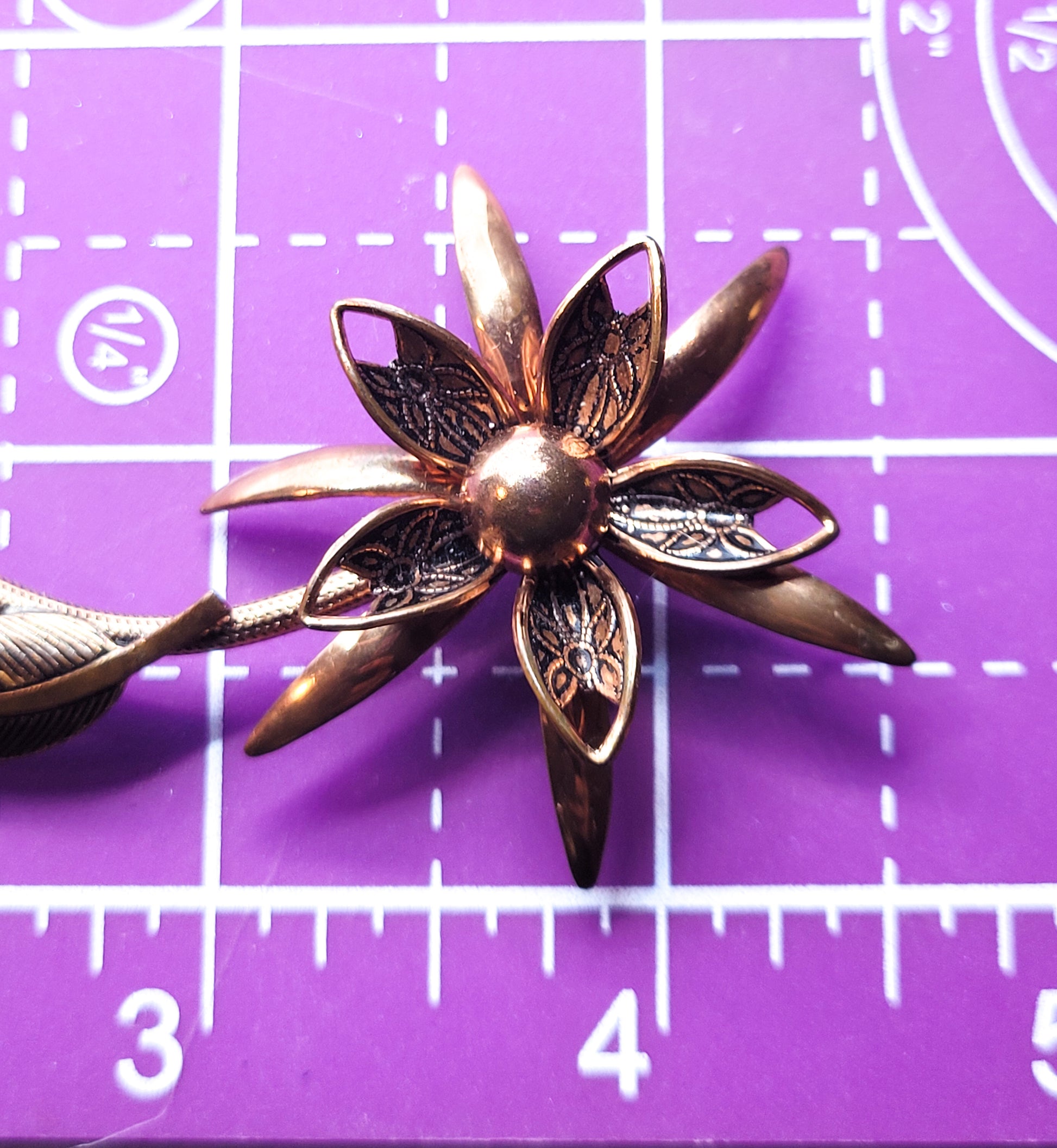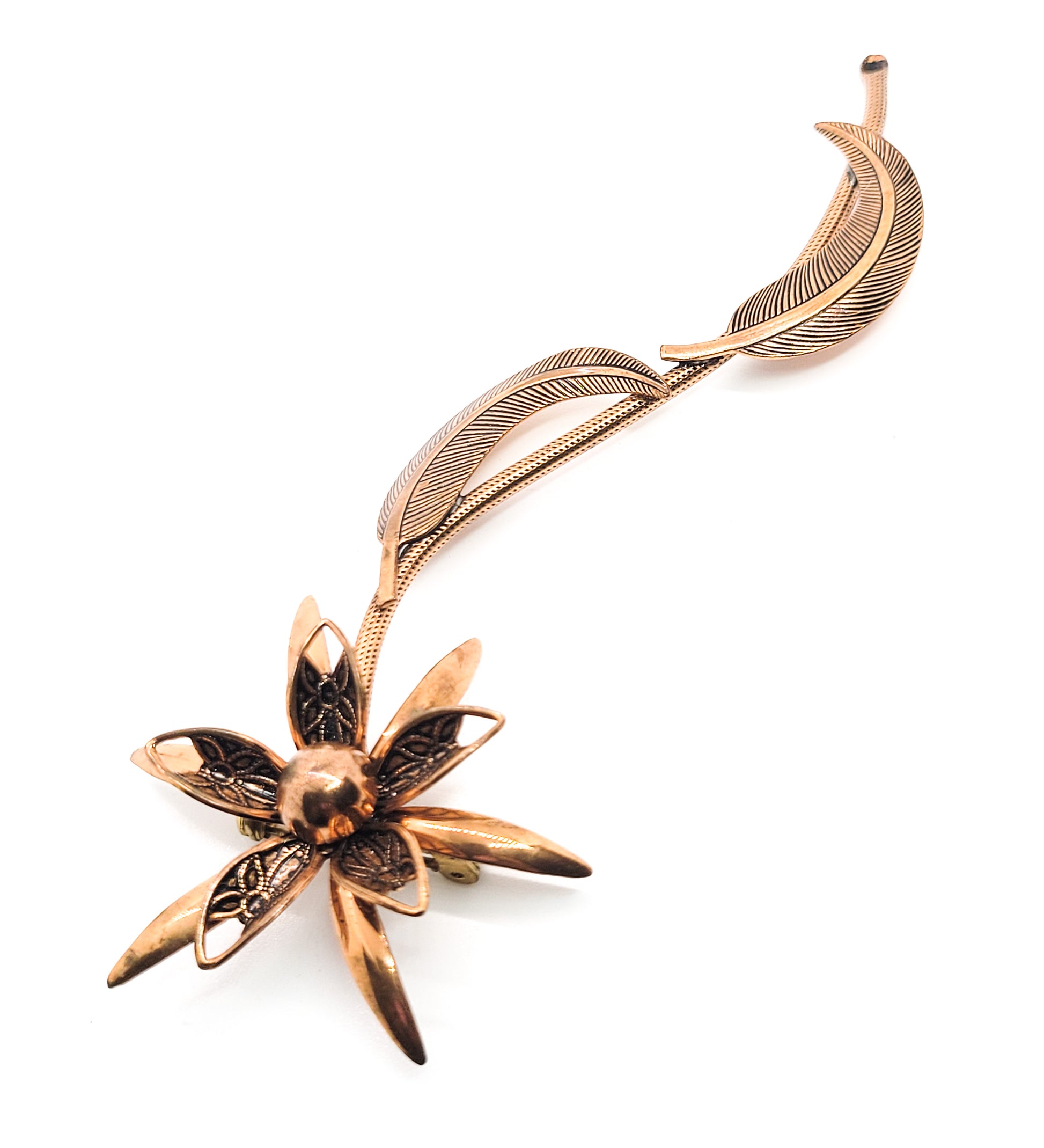 Large copper 3D flower brooch with stem and leaves vintage pin 4.5 inches