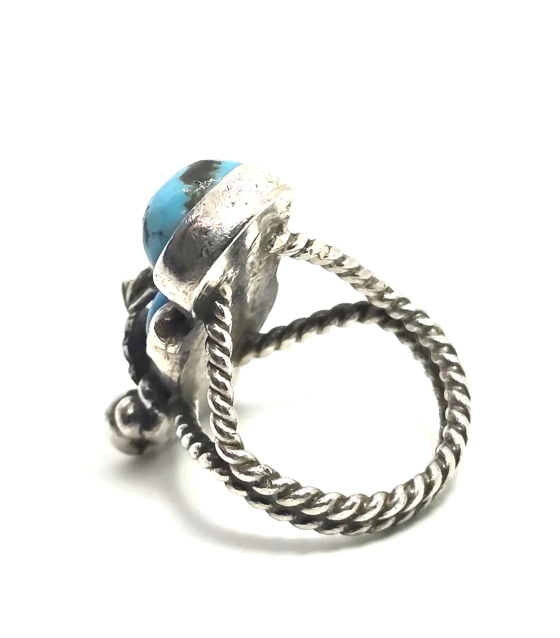 Large Double Turquoise Navajo Native American vintage sterling silver ring. Good used condition with little to no signs of normal wear. Great vintage patina present. Beautiful twisted silver split shank. Beautiful double turquoise cabs. Amazing handcrafted accents.
