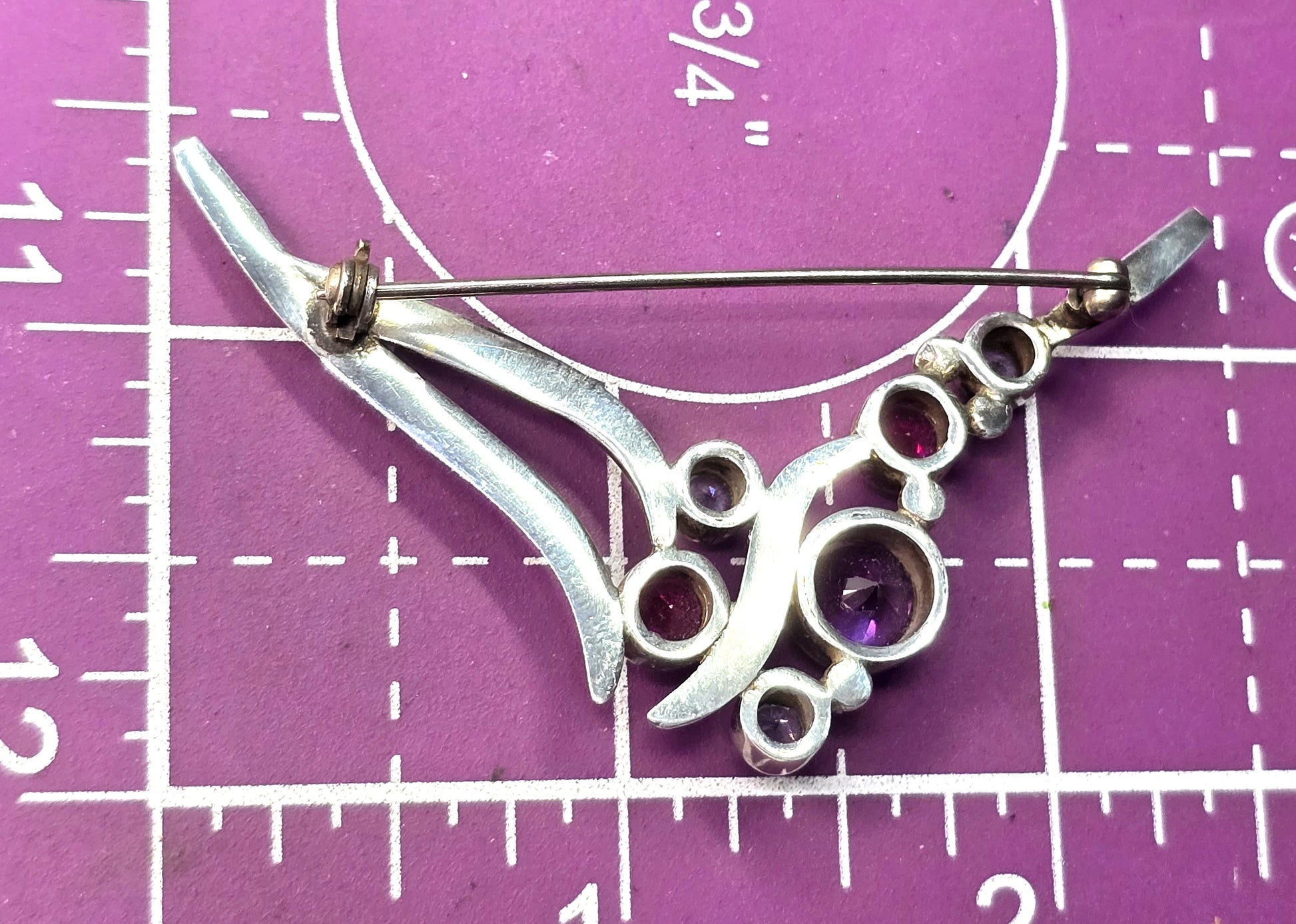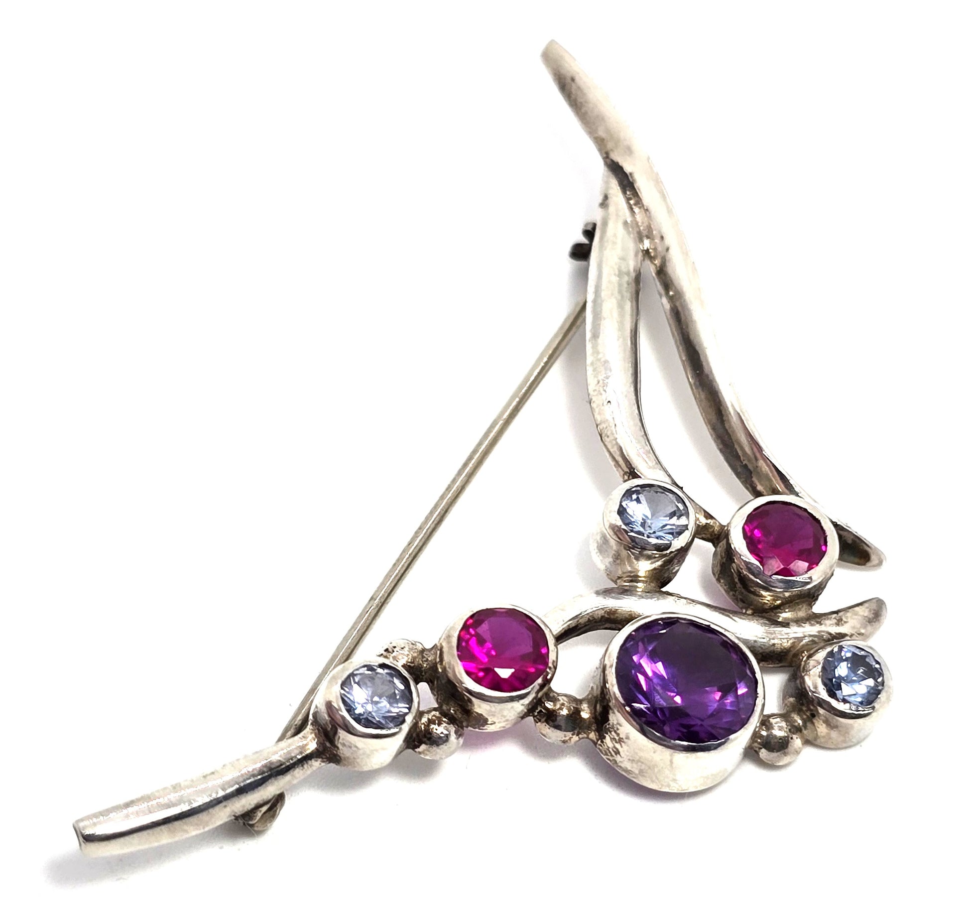 Large multi gemstone abstract sapphire aquamarine sterling silver brooch. Good used condition with little to no signs of normal wear. Stones include synthetic purple sapphire, pink sapphire and blue aquamarine.