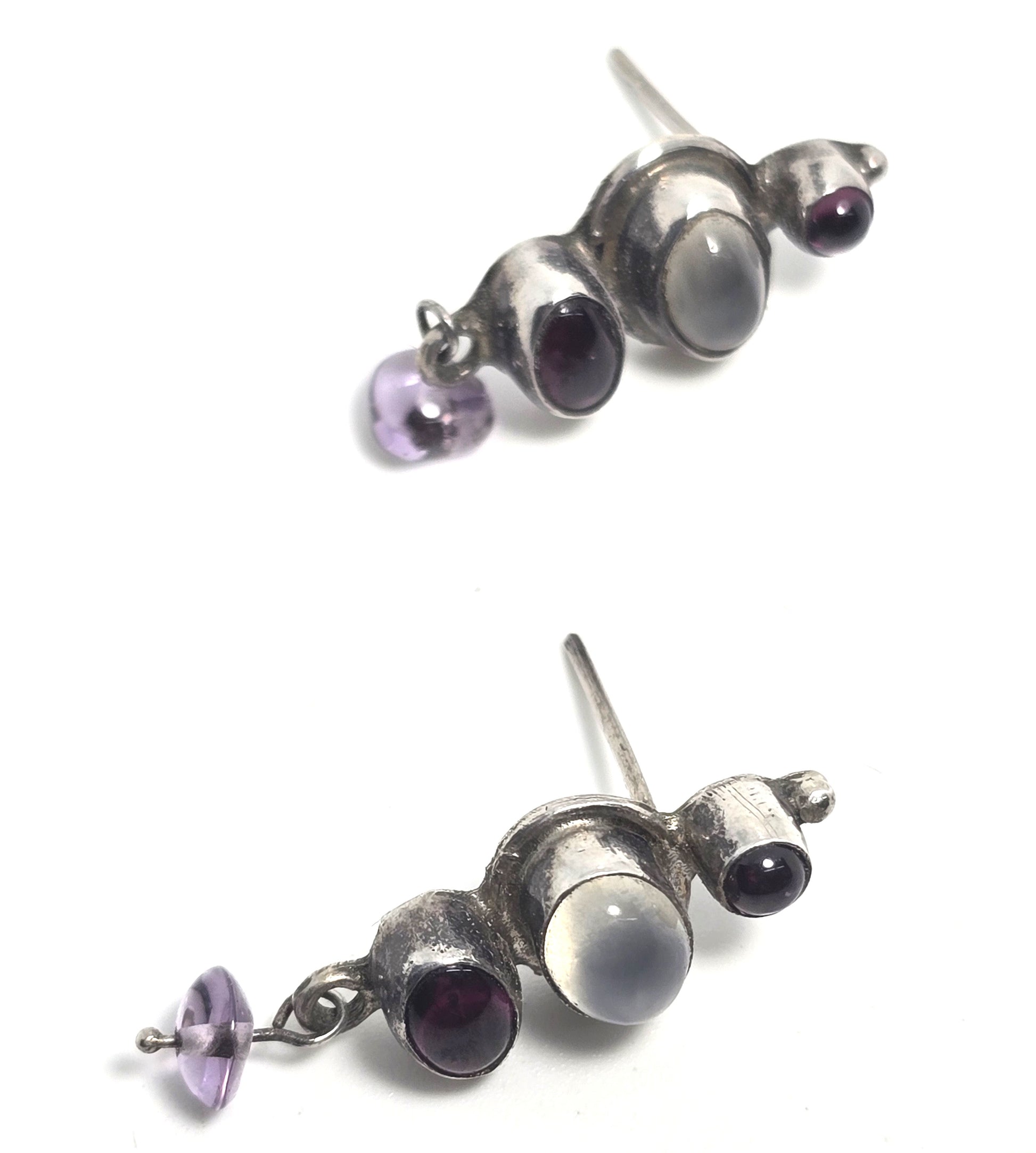 Multi gemstone garnet, amethyst silver moonstone vintage sterling silver earrings . These beautiful earrings are set in solid sterling silver with an amethyst drop bead. Good used condition with little to no signs of normal wear. All post earrings come with new sterling silver butterfly backings. Stamped 925 on the back.