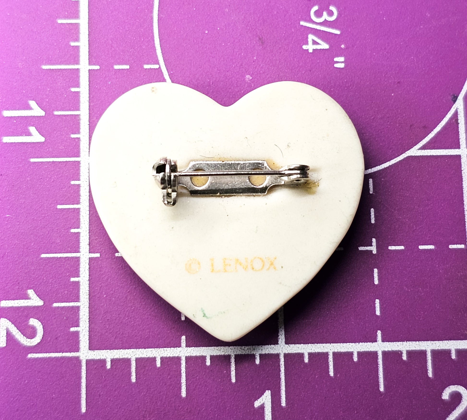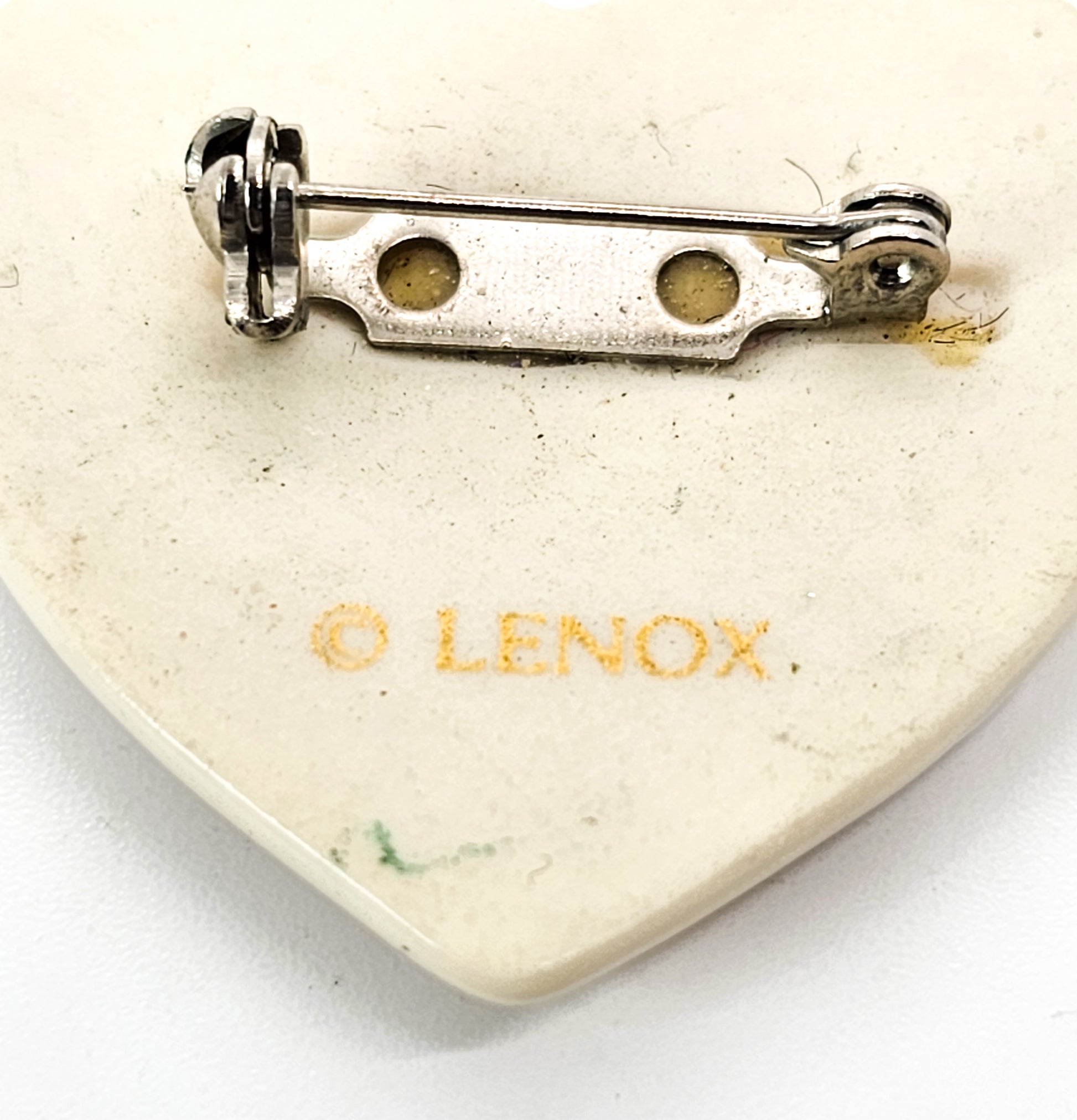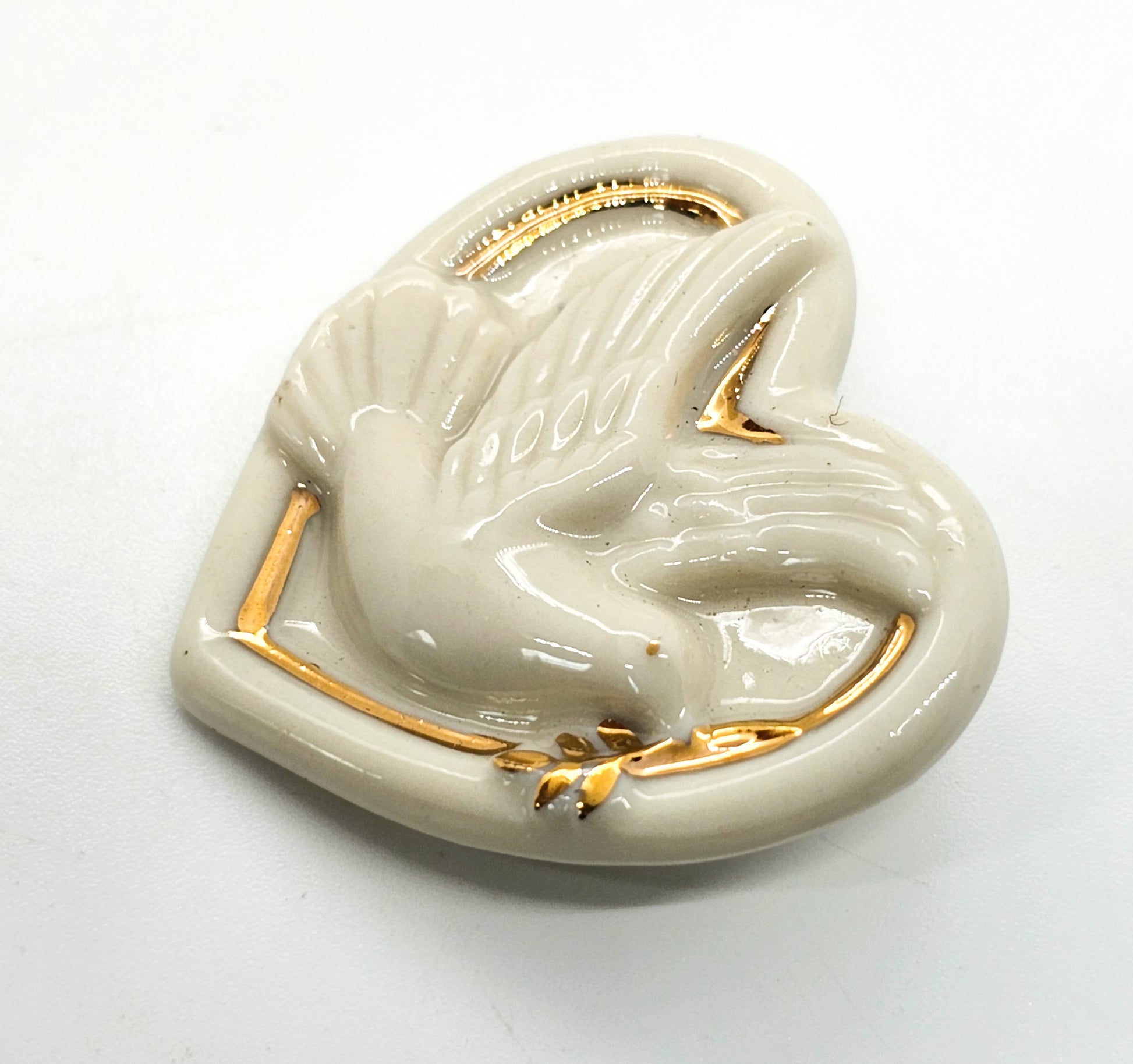 Lenox porcelain flying dove olive branch signed vintage heart brooch. Good vintage condition with little to no signs of normal wear. Stamped Lenox on the back of the brooch.