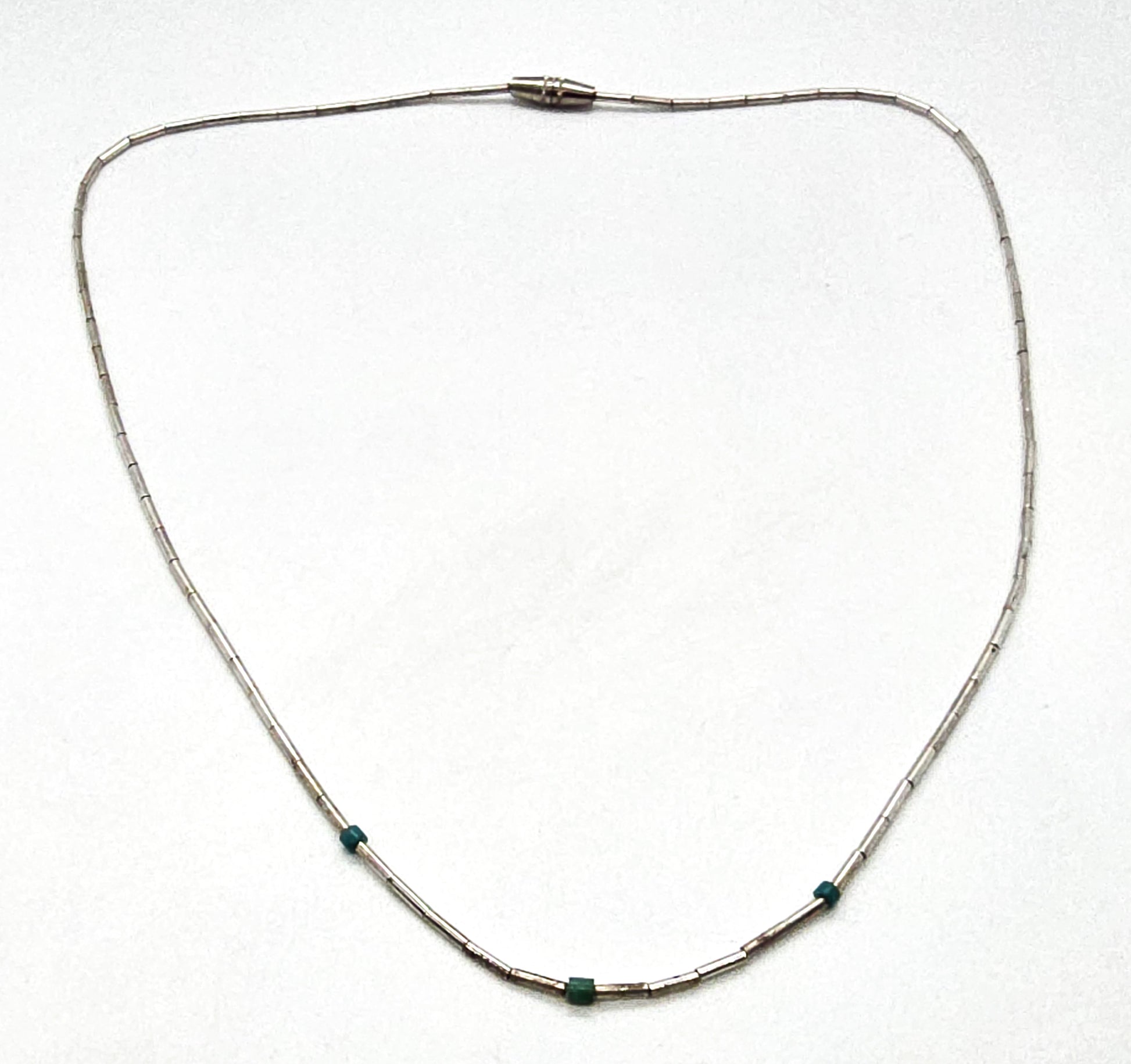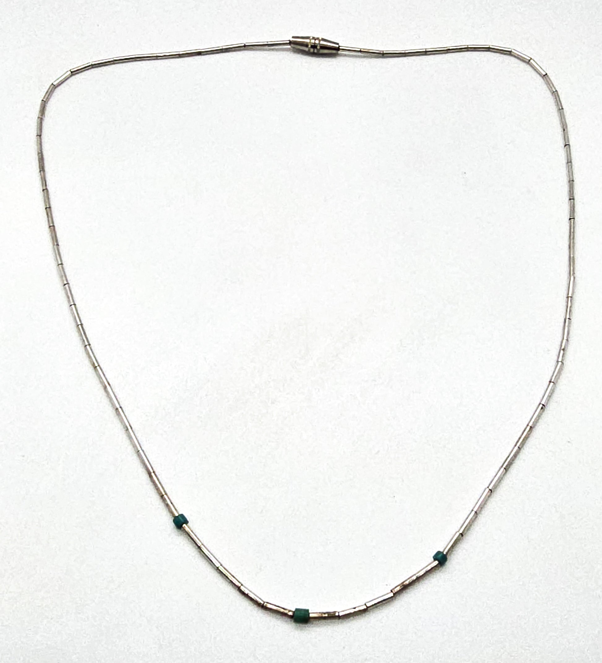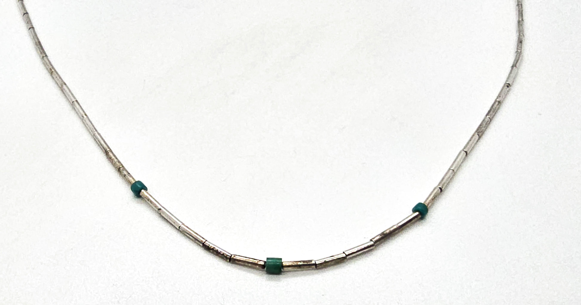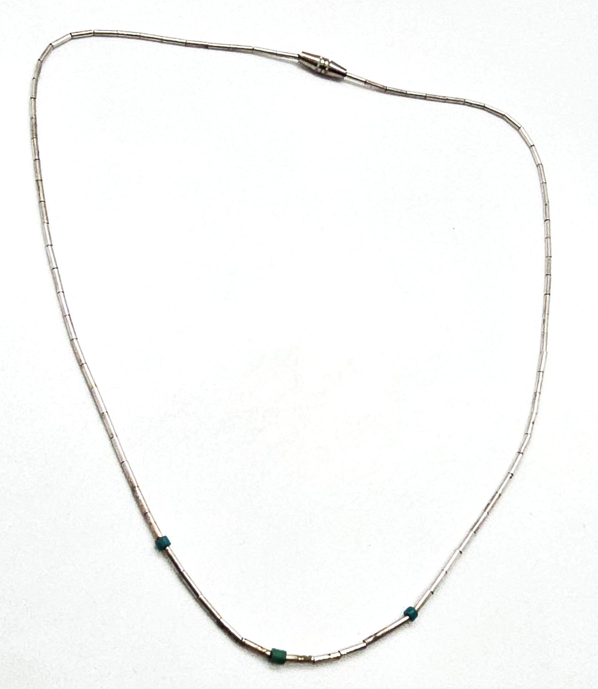 Liquid silver Southwestern block turquoise beaded heishi silver plated vintage necklace. Good used condition with little signs of normal wear. Barrel clasp double silk strung beads. There are three small block turquoise accents to the thin sterling silver tube beads.