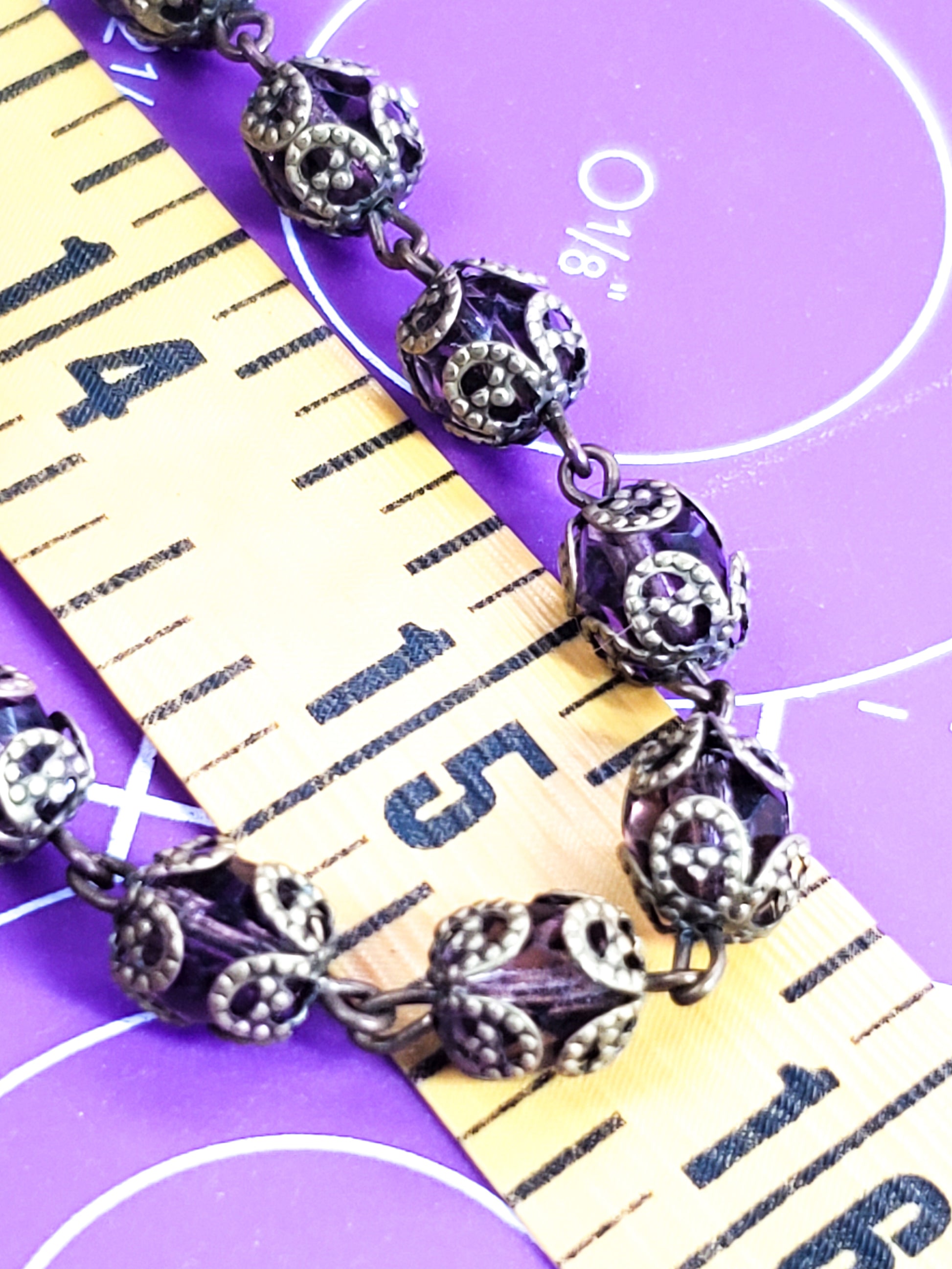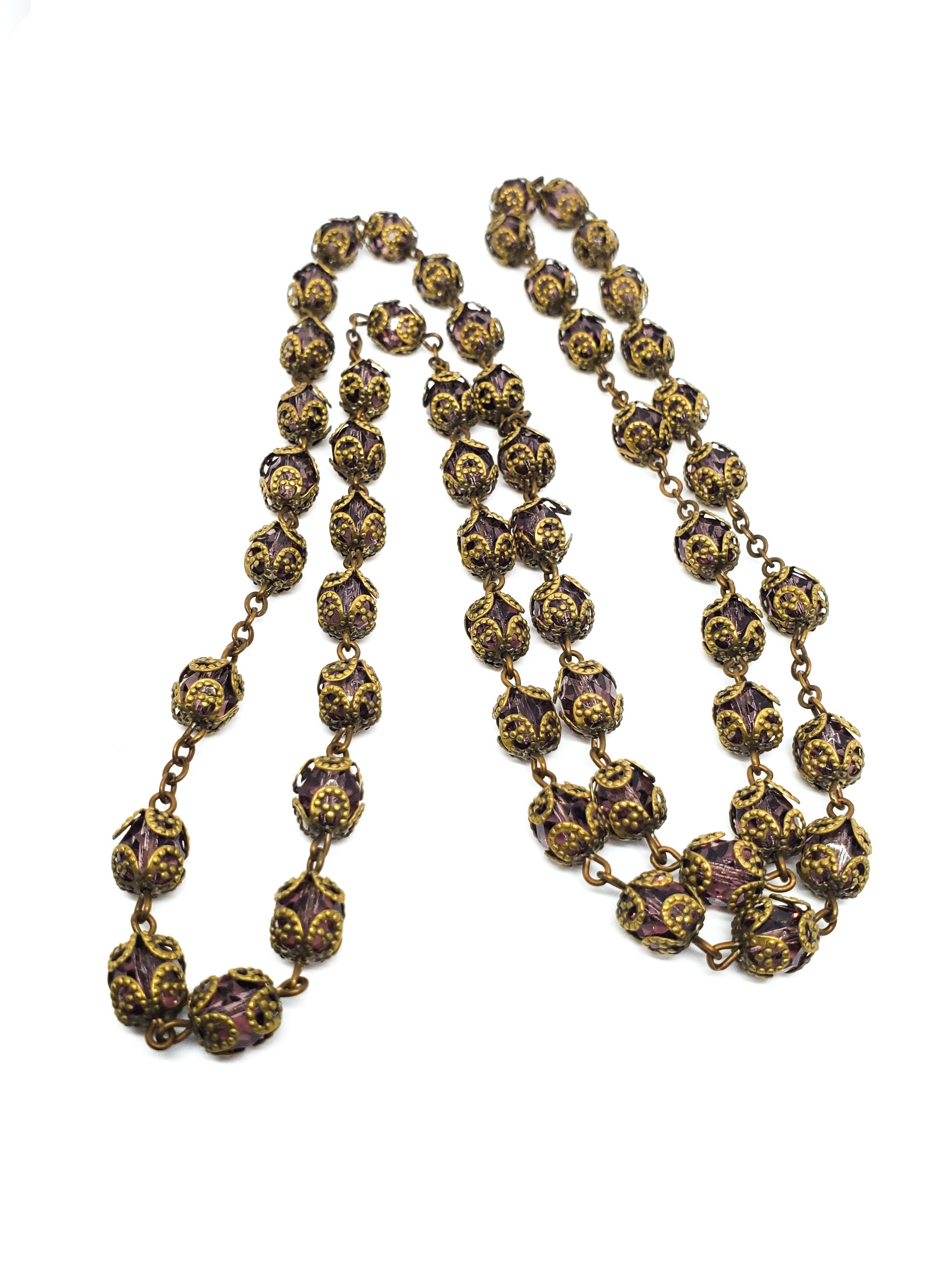 Long Venetian purple faceted glass vintage beaded necklace with brass flower caps . These lovely purple beads are almost fully encased in the brass flower caps. These beads are strung together on handmade brass links. Great vintage condition with little to no signs of normal vintage wear.