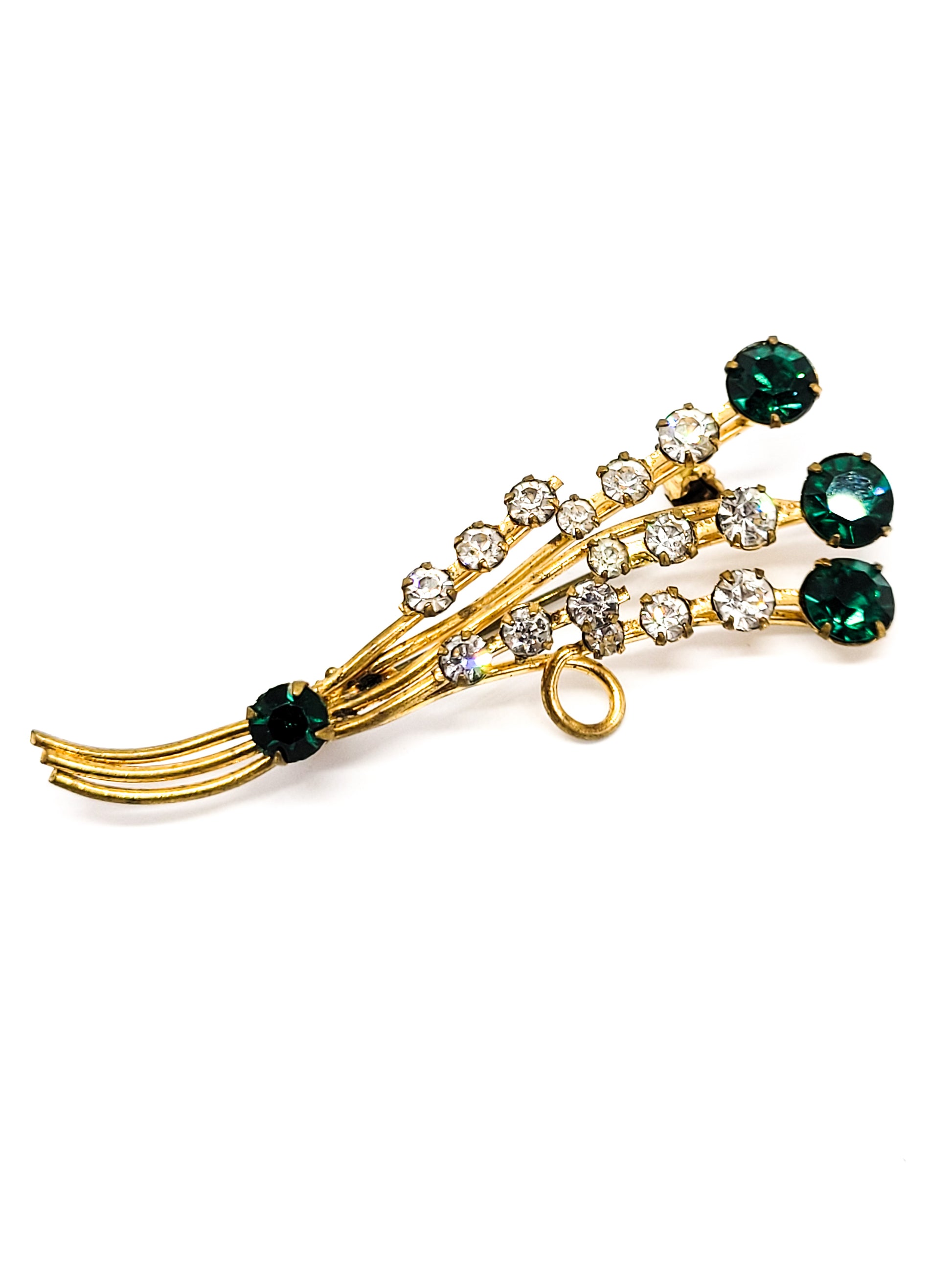Made in Austrian bright green and clear chaton gold toned vintage mid century brooch