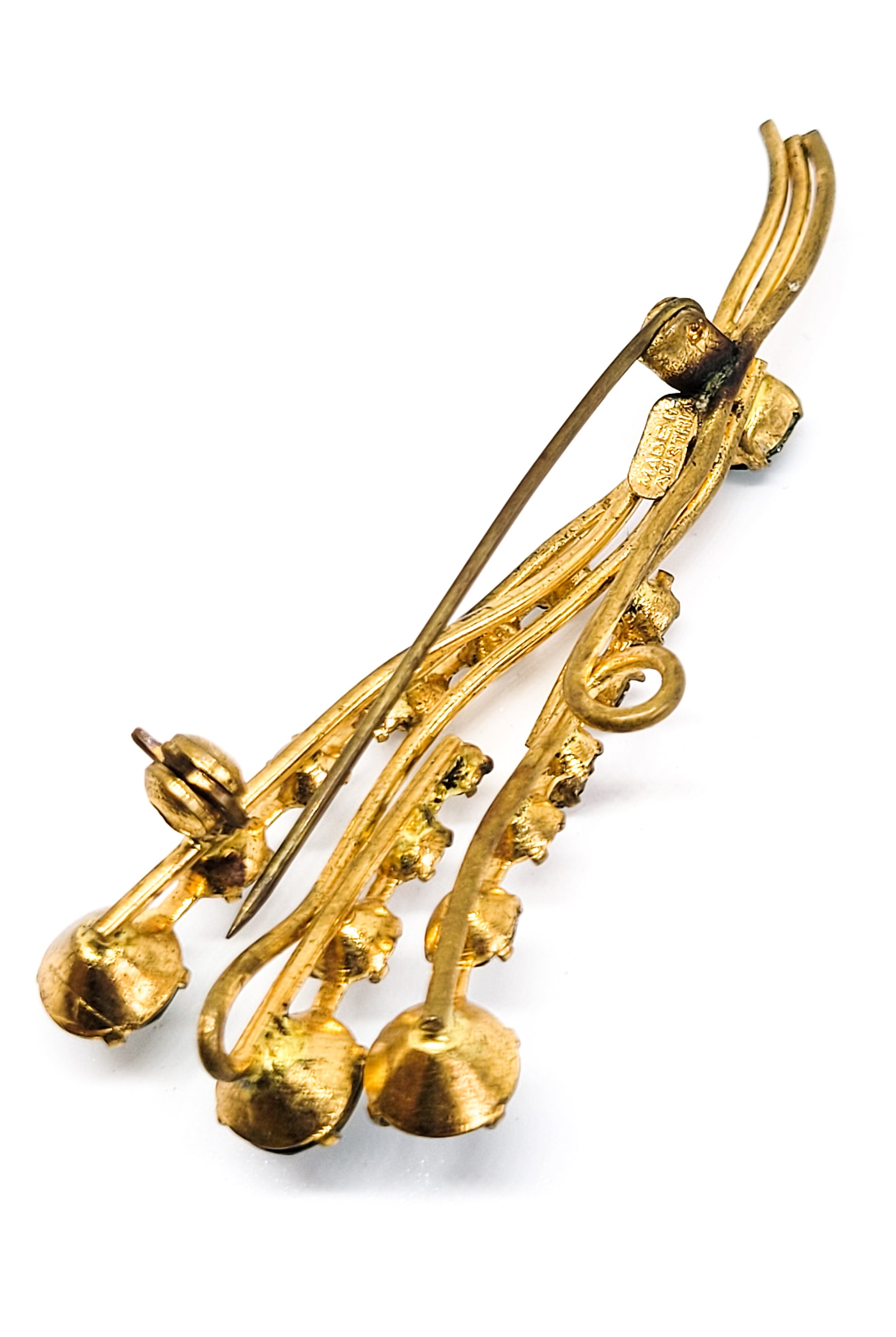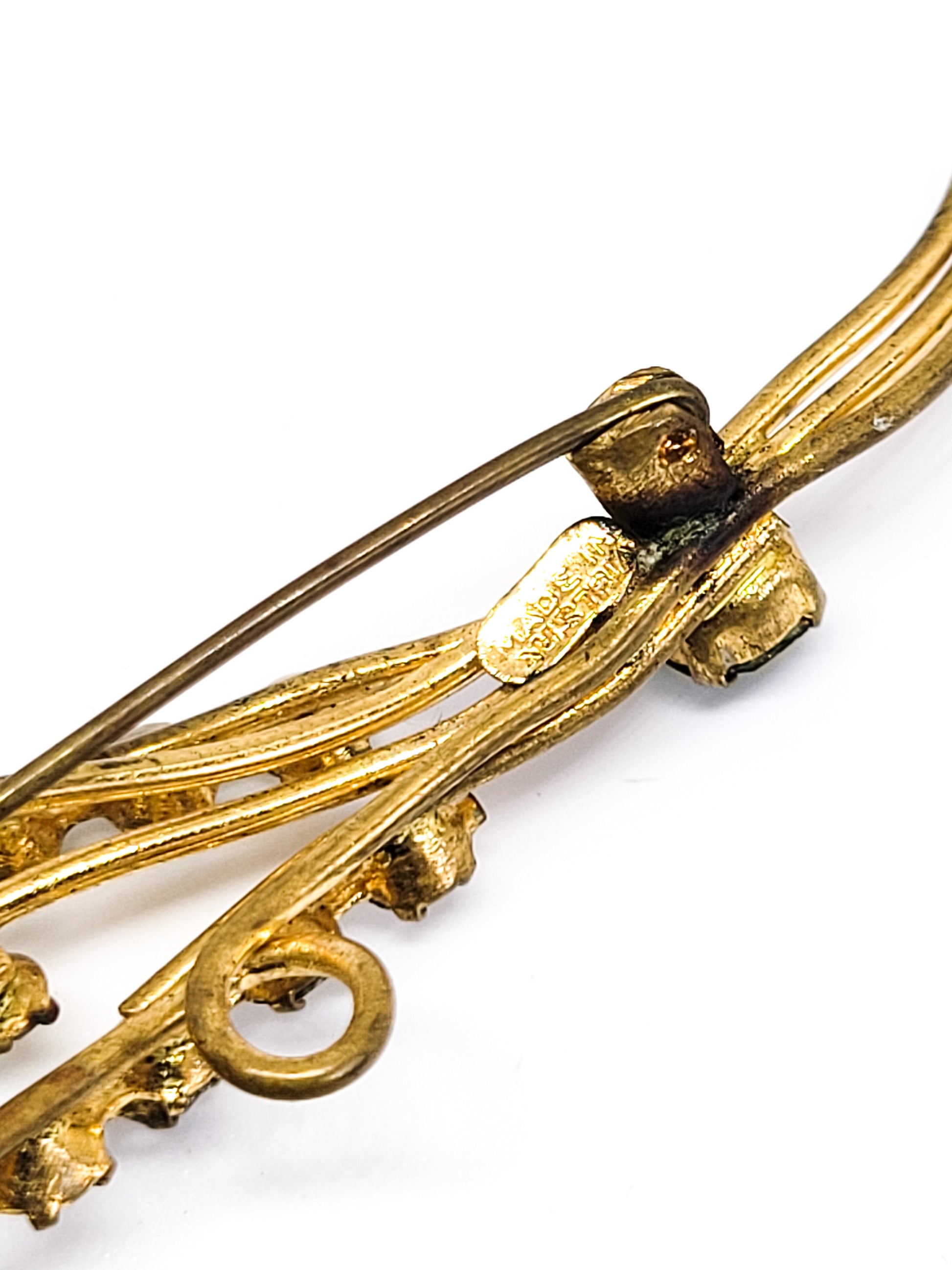 Made in Austrian dark green and clear chaton gold toned vintage mid century brooch. Beautiful bright colors. Good vintage condition with small signs of normal vintage wear. Stamped made in Austria on the reverse.