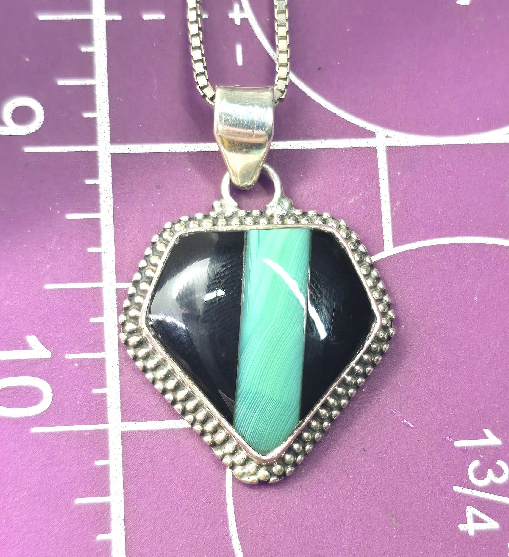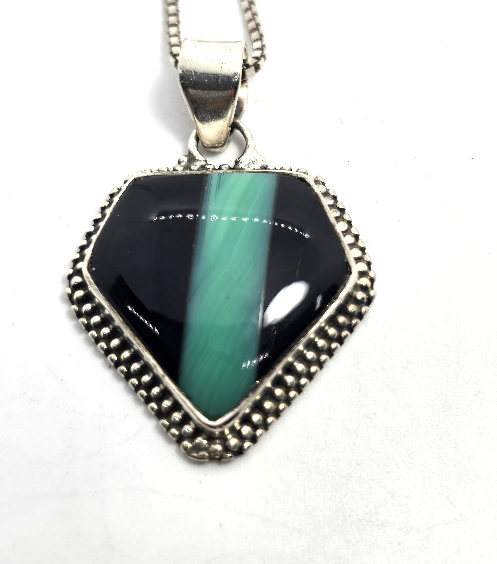 Banded Malachite stripped black onyx inlay artisan vintage sterling silver necklace. Good vintage condition with little to no signs of normal vintage wear. Stamped 925 on the back of the pendant. Comes with sterling silver box chain.