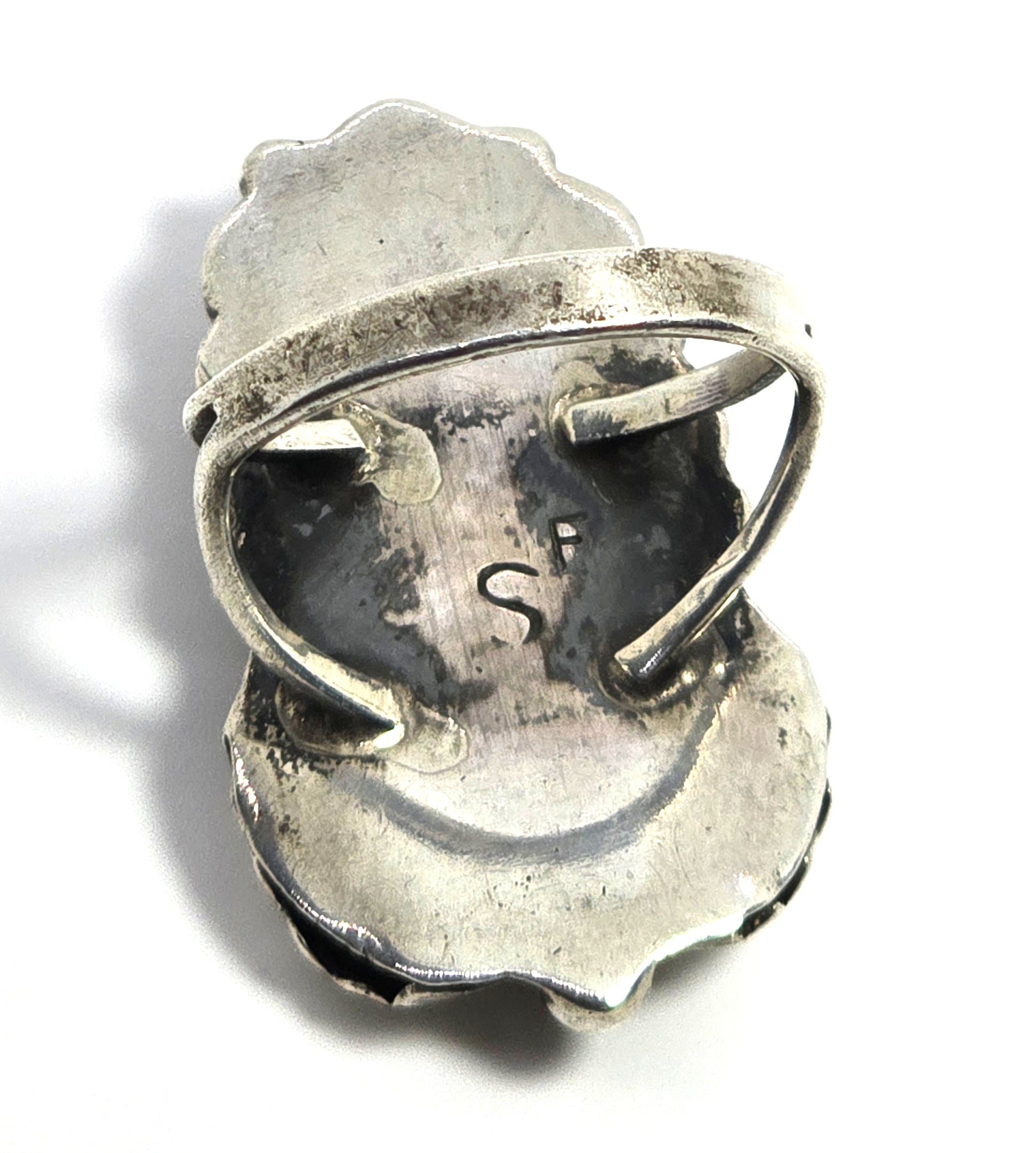 Malachite large Navajo Native American feather sterling silver ring. Good vintage condition with little to no signs of normal vintage wear. Split shank band. Stamped SF on the back of the ring. Large dark bezel set stone. Twisted rope halo scalloped edges and double Navajo feather accents.