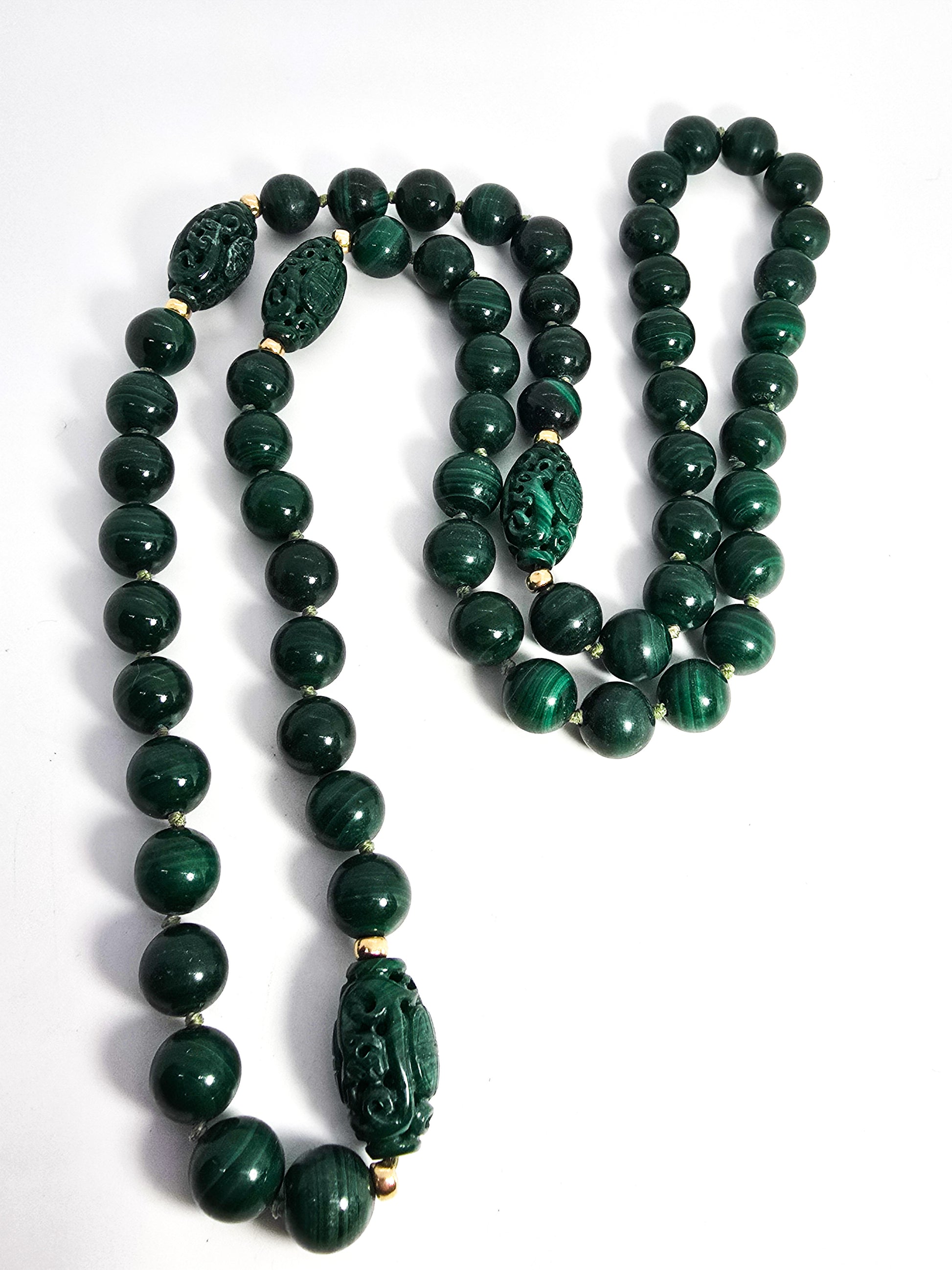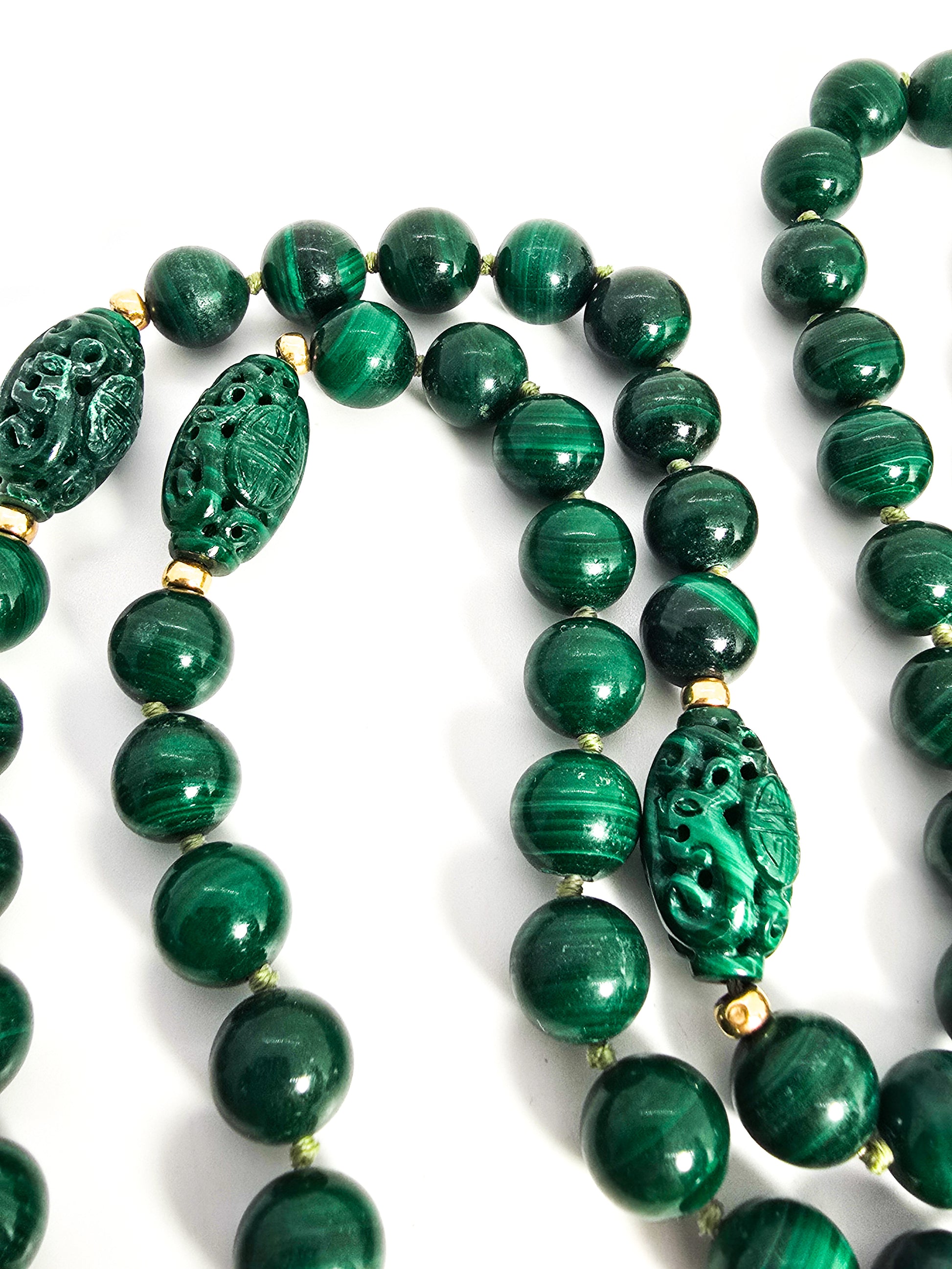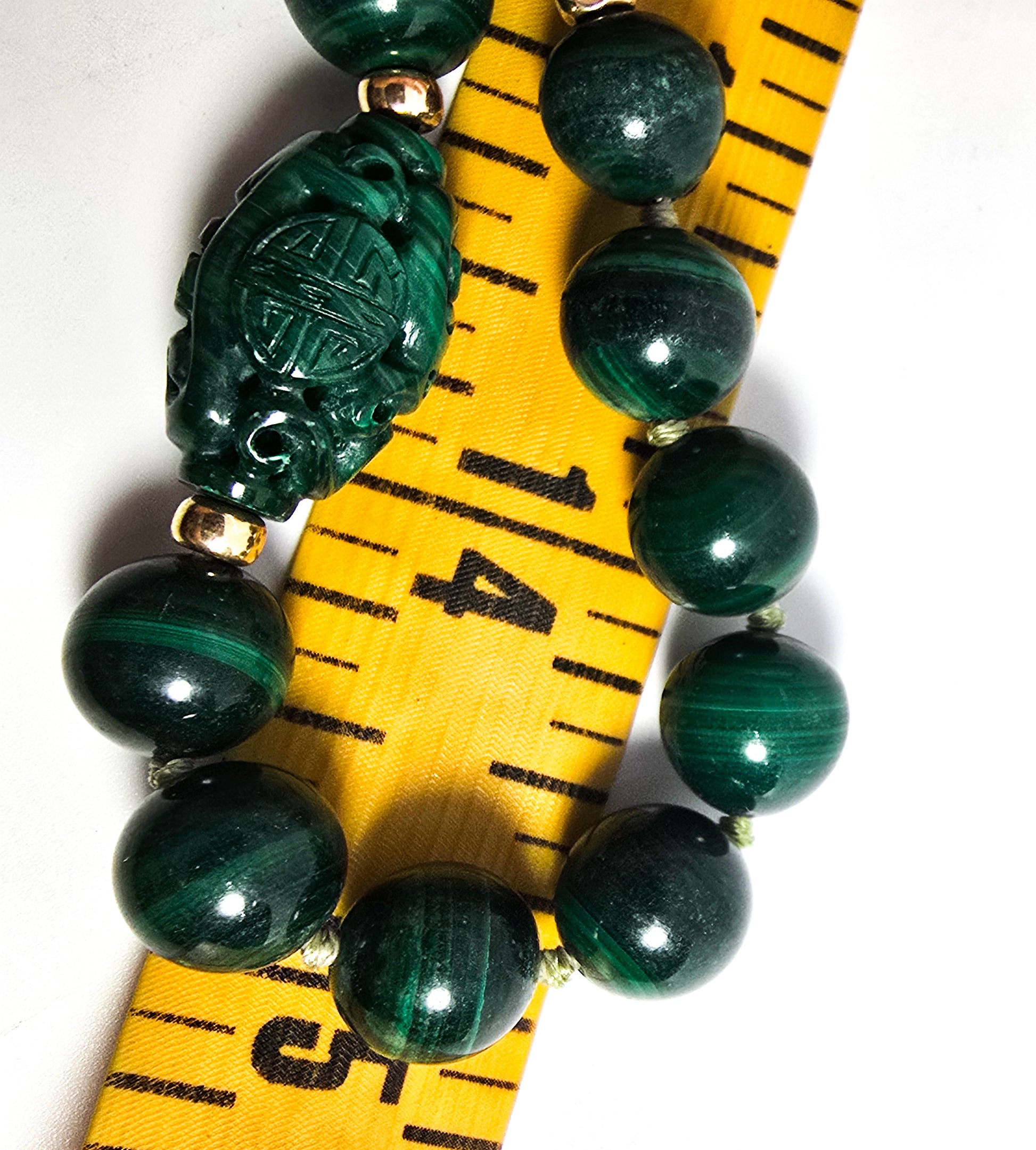 Malachite carved gemstone 14k gold accent vintage 30" beaded vintage necklace. Good used condition with little to no signs of normal wear. Each bead is hand carved and unique in shape and size. There are 4 accent beads on the lower half of the necklace. This is so that it is smooth around the neck when worn. These Chinese Feng Shui carved beads are large and oblong in shape. These have 14k gold spacer beads between them. Necklace has a good weight to the stones. These are silk strung and knotted between the beads.