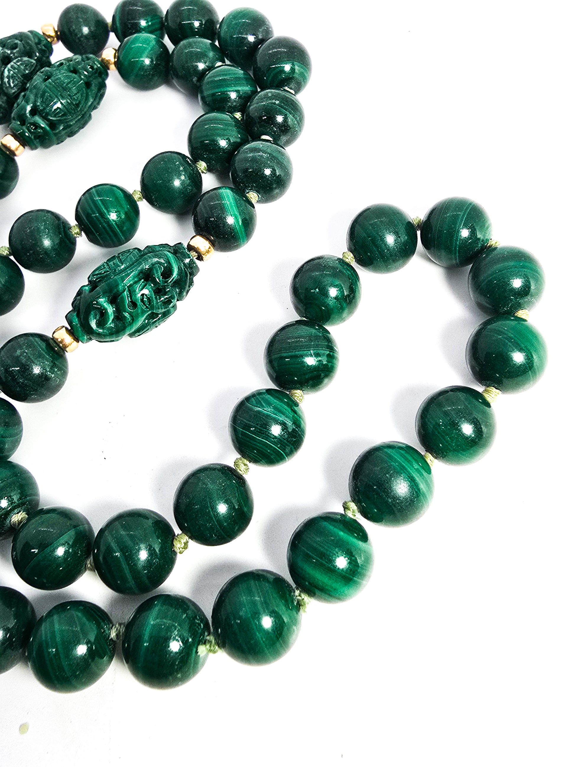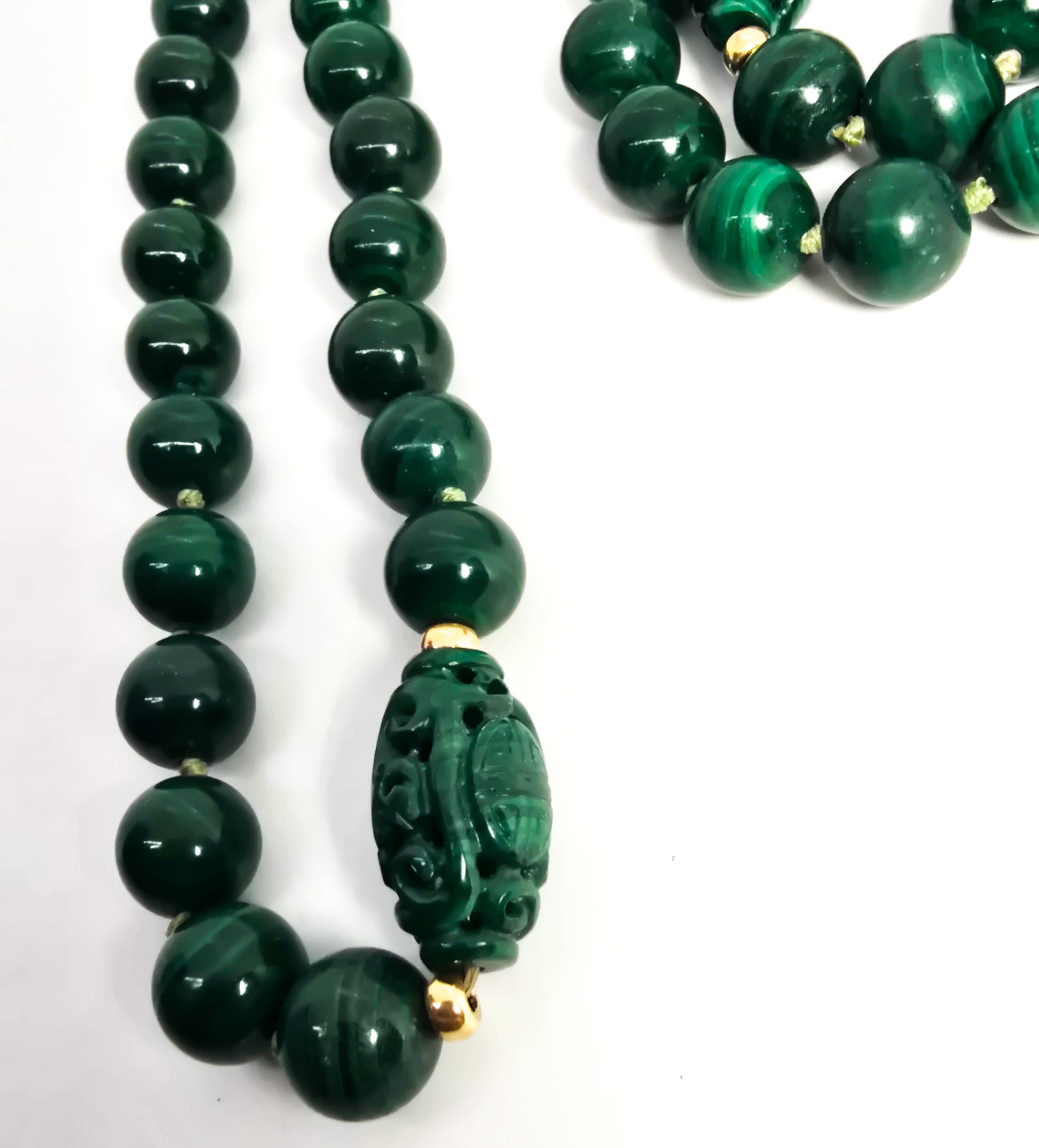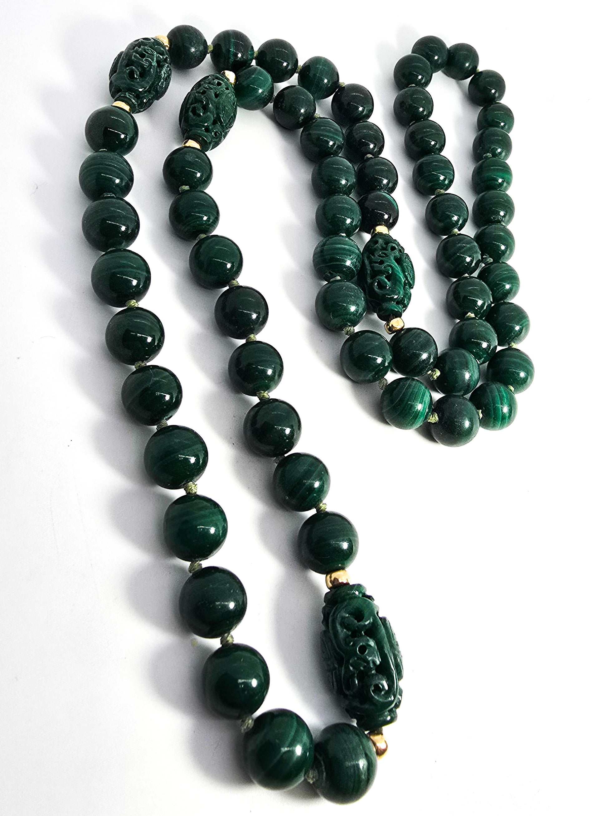 Malachite carved gemstone 14k gold accent vintage 30" beaded vintage necklace. Good used condition with little to no signs of normal wear. Each bead is hand carved and unique in shape and size. There are 4 accent beads on the lower half of the necklace. This is so that it is smooth around the neck when worn. These Chinese Feng Shui carved beads are large and oblong in shape. These have 14k gold spacer beads between them. Necklace has a good weight to the stones. These are silk strung and knotted between the beads.