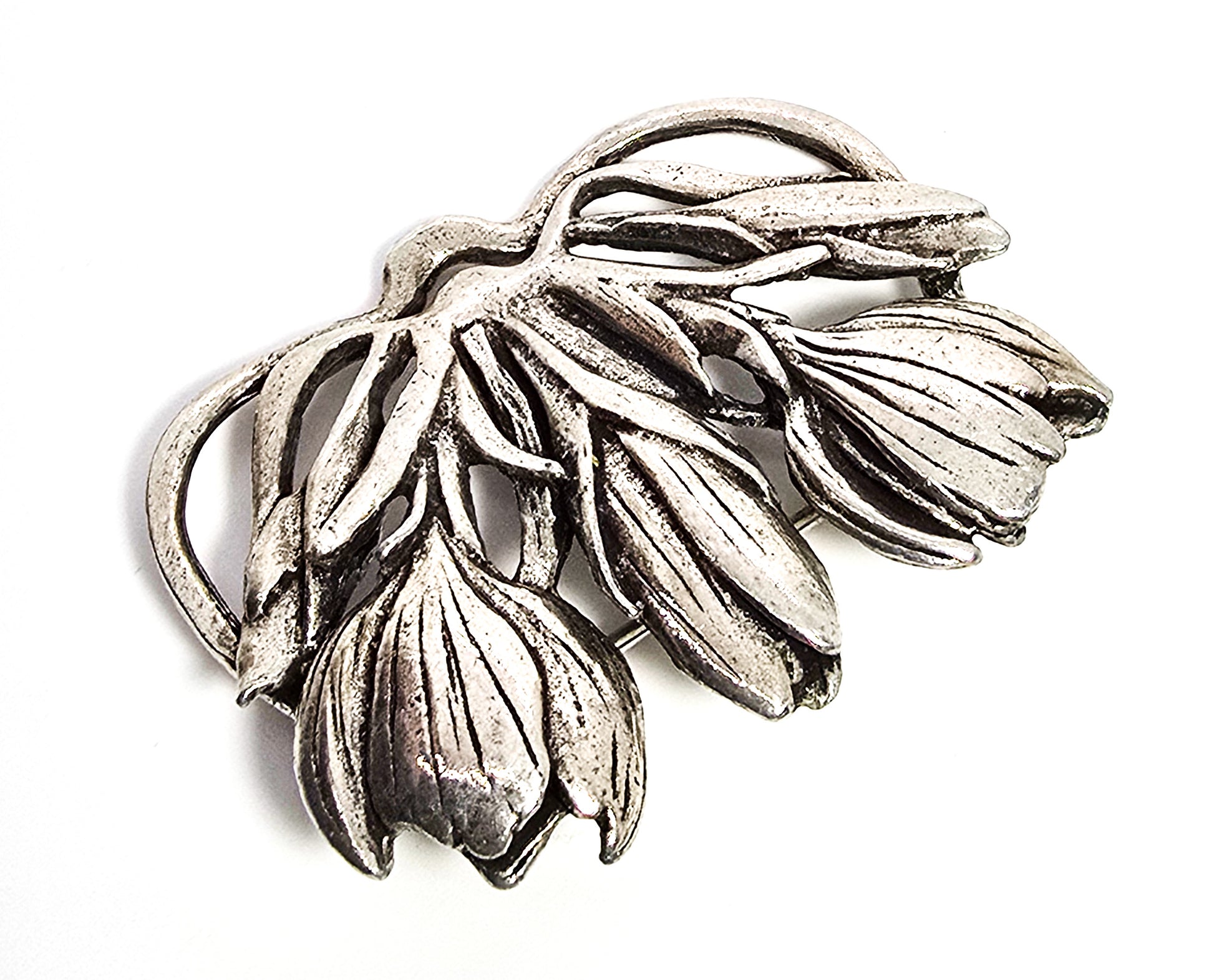 MASJ Silver Scenes silver plated pewter flowers tulip signed brooch. Good used condition with little to no signs of normal wear. Stamped on the edge MASJ 1995.