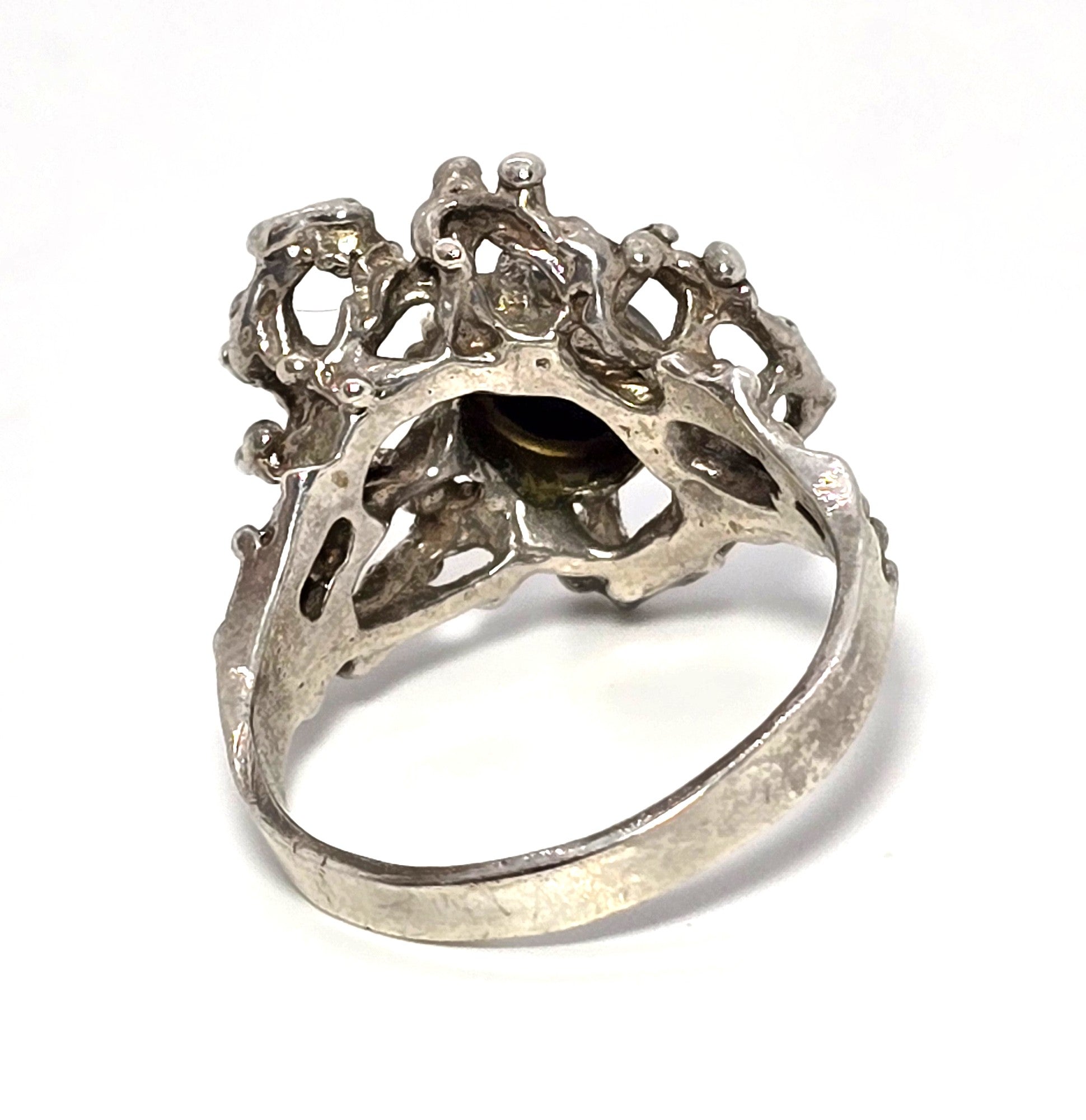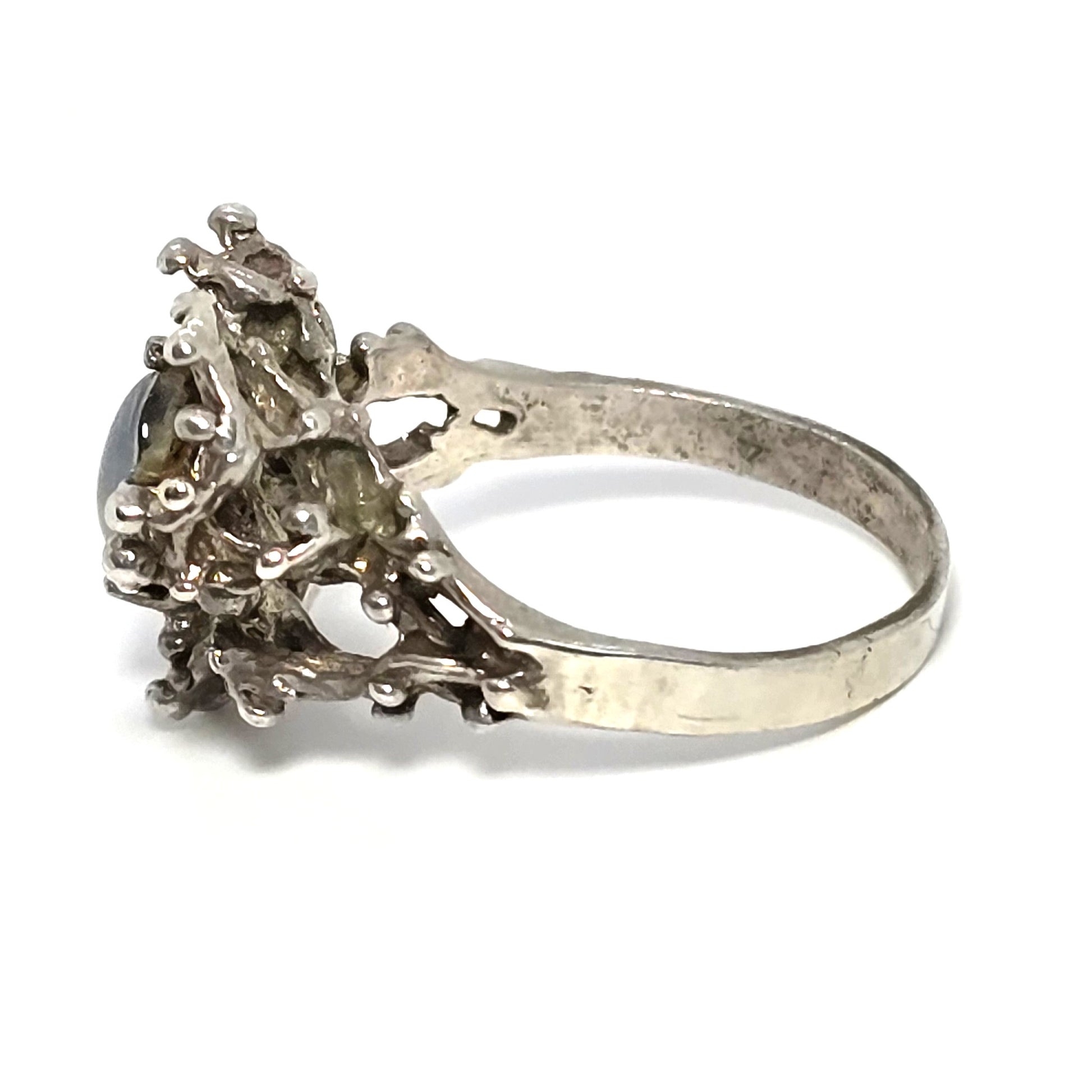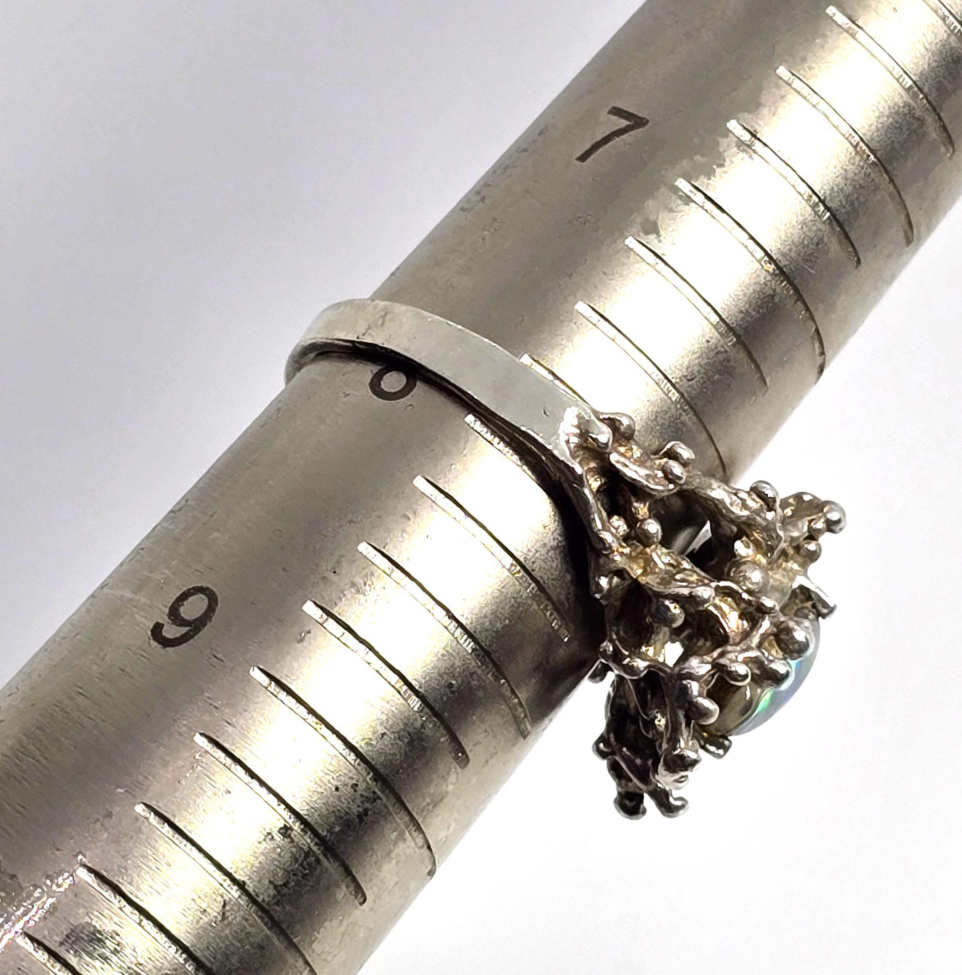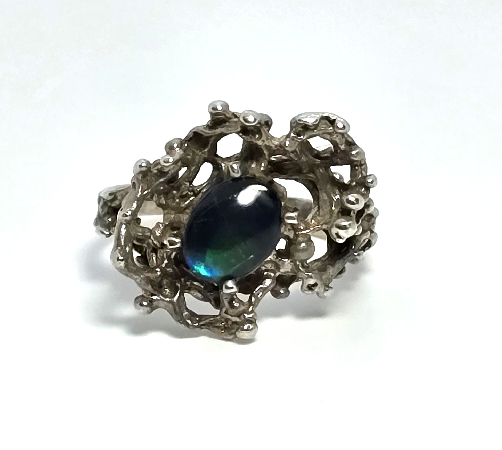 Brutalist black opal triplet crafted retro vintage sterling silver ring . Good used condition with little to no signs of normal wear. Triplet held into the setting with sweeping sterling silver handcrafted prongs. Decorated handcrafted brutalist setting.