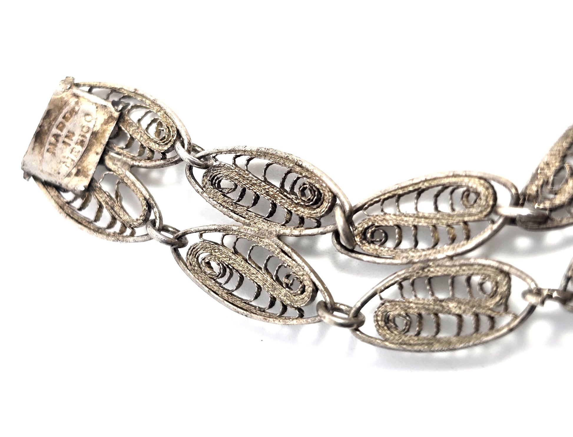 Mexican Antique filigree double leaf sterling silver panel bracelet Good used condition with little to no signs of normal wear. Great vintage patina. Stamped on the back of the box clasp made in Mexico
