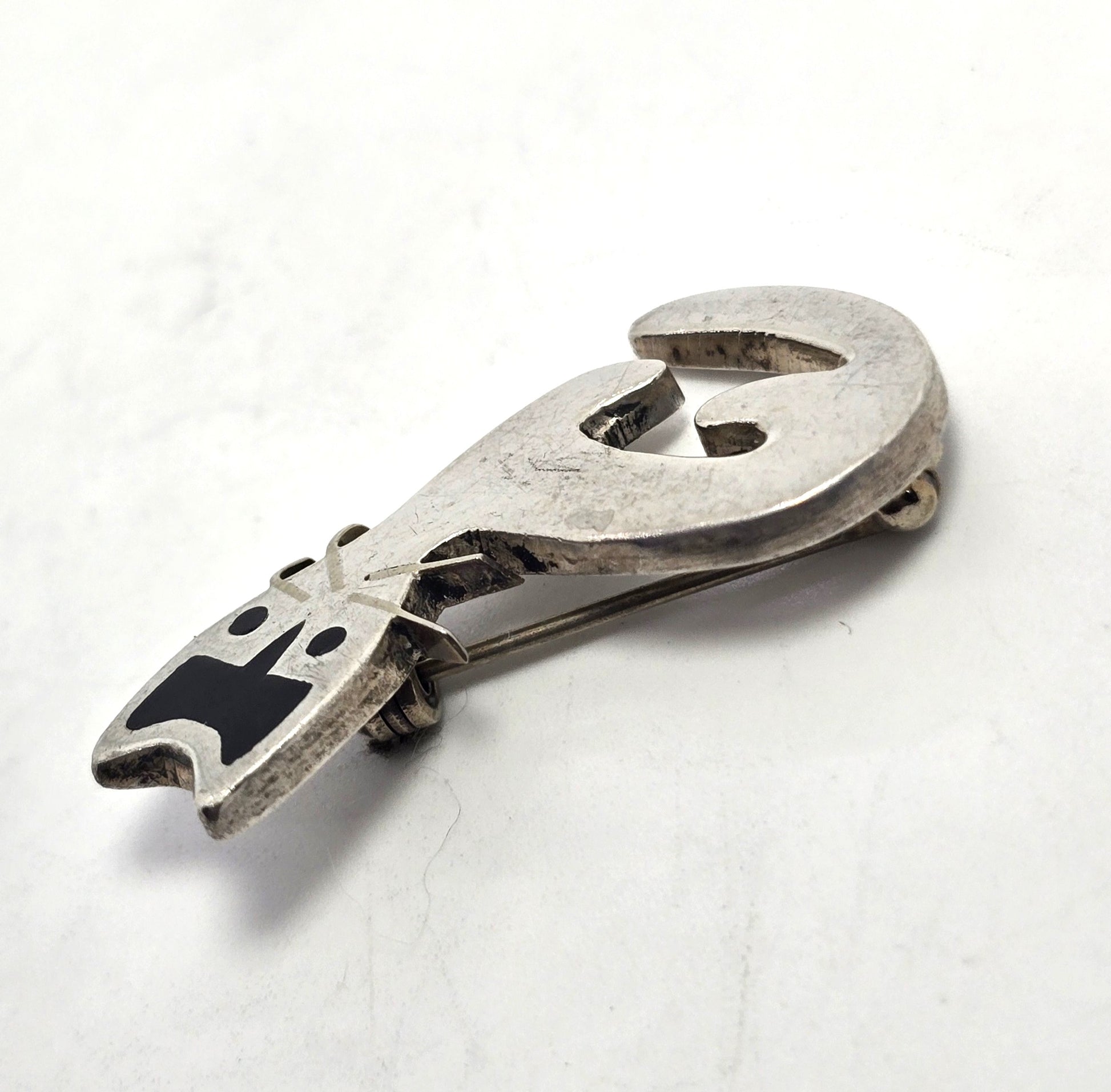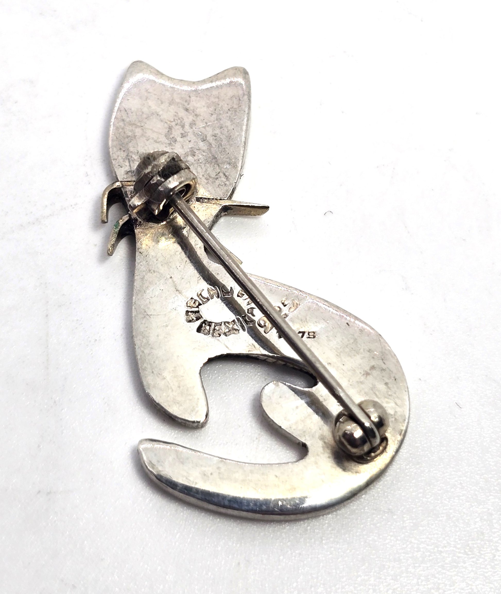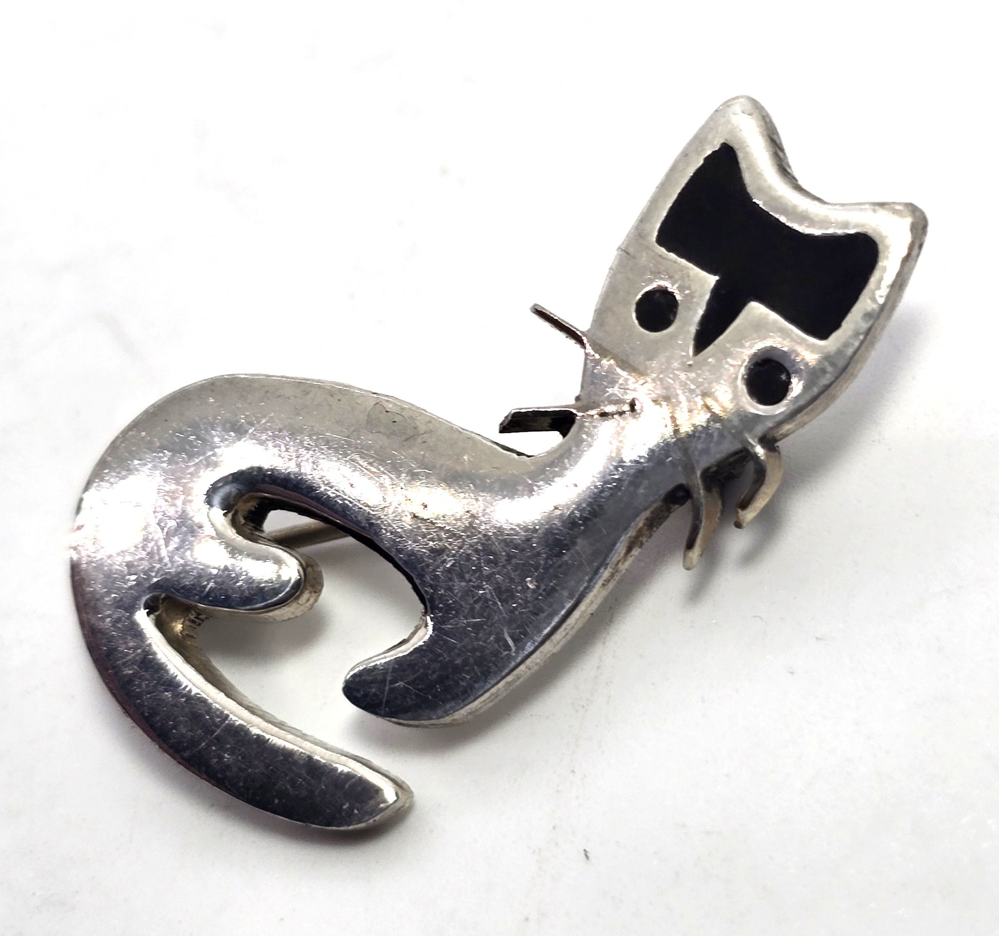 Mexico Taxco Black Enamel Kitty Cat vintage signed sterling silver feline brooch. Good used condition with little signs of normal wear. Great vintage patina. Stamped Hencho en Mexico 925 Tr-75. Solid sterling silver construction.