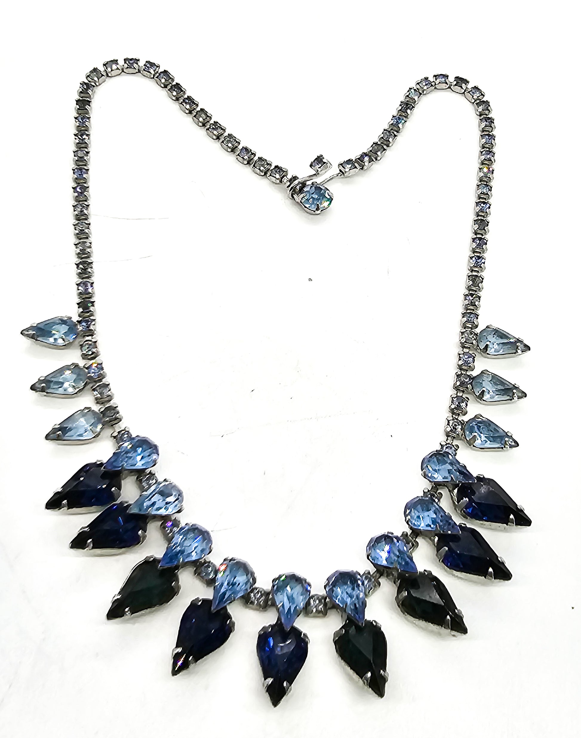 Mid century Dark and light blue pear cut vintage rhinestone statement necklace