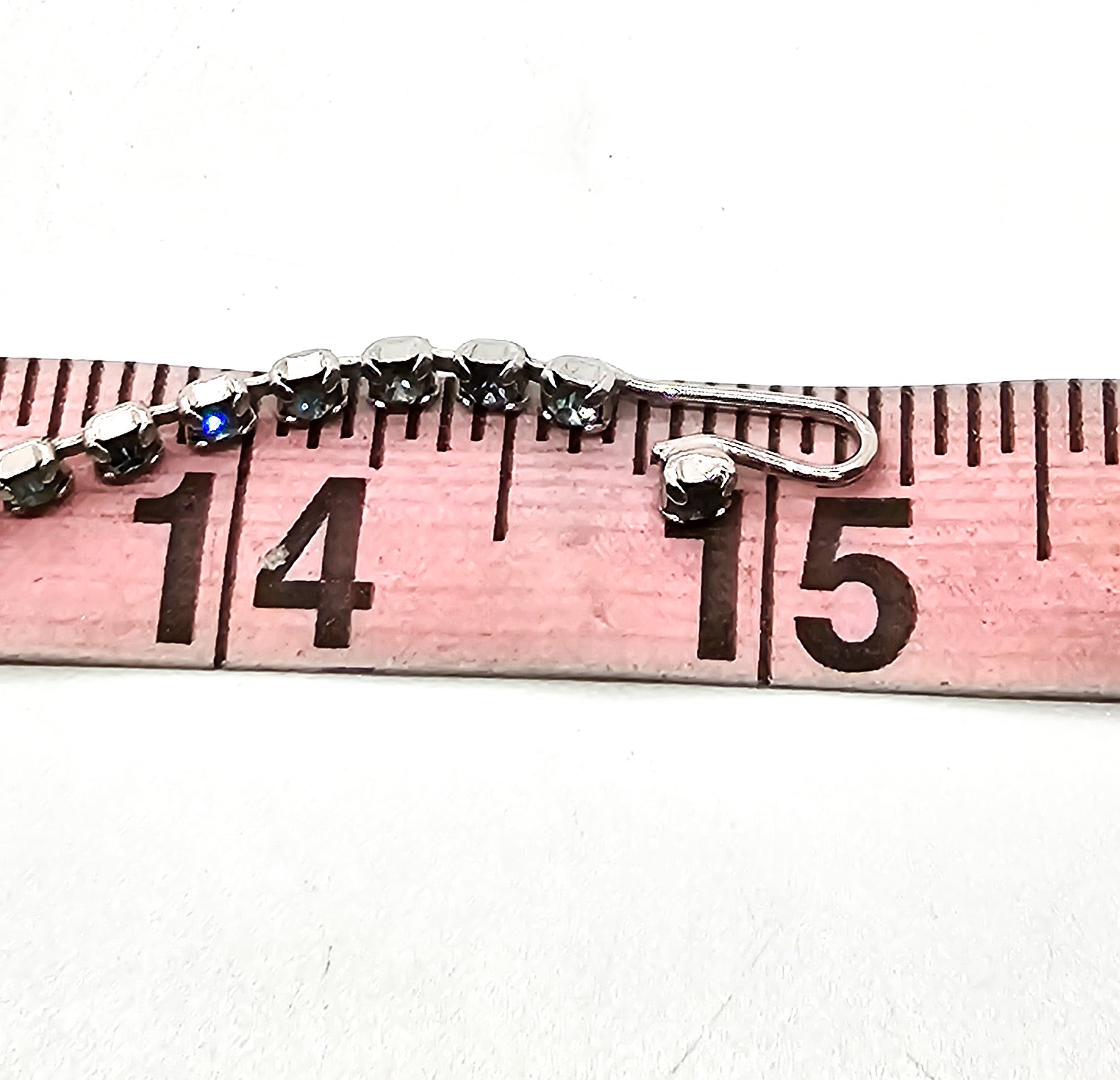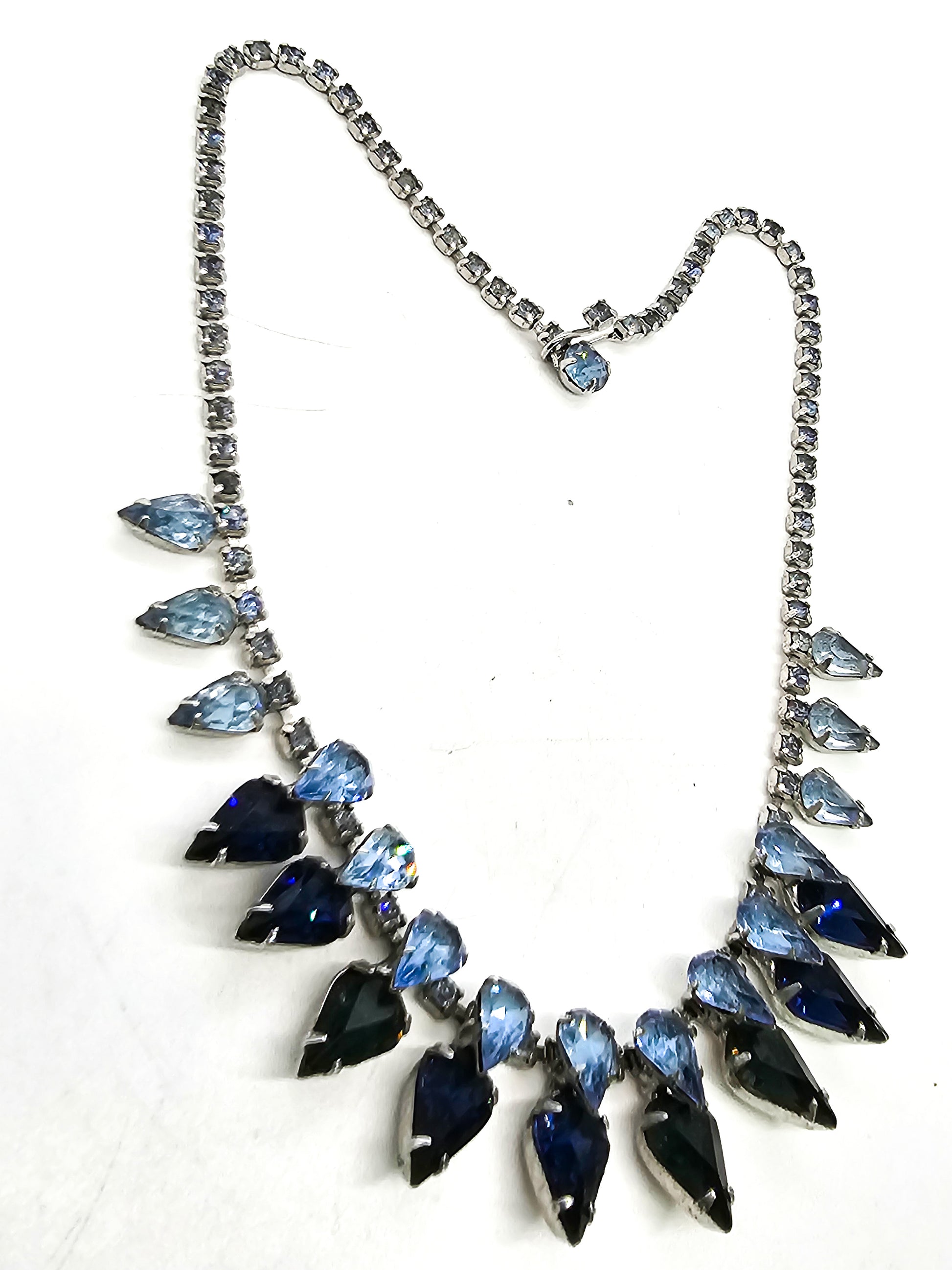 Mid century Dark and light blue pear cut vintage rhinestone statement necklace. Good vintage condition with little signs of normal vintage wear. No missing or black stones. Hook fastening with rhinestone accent.