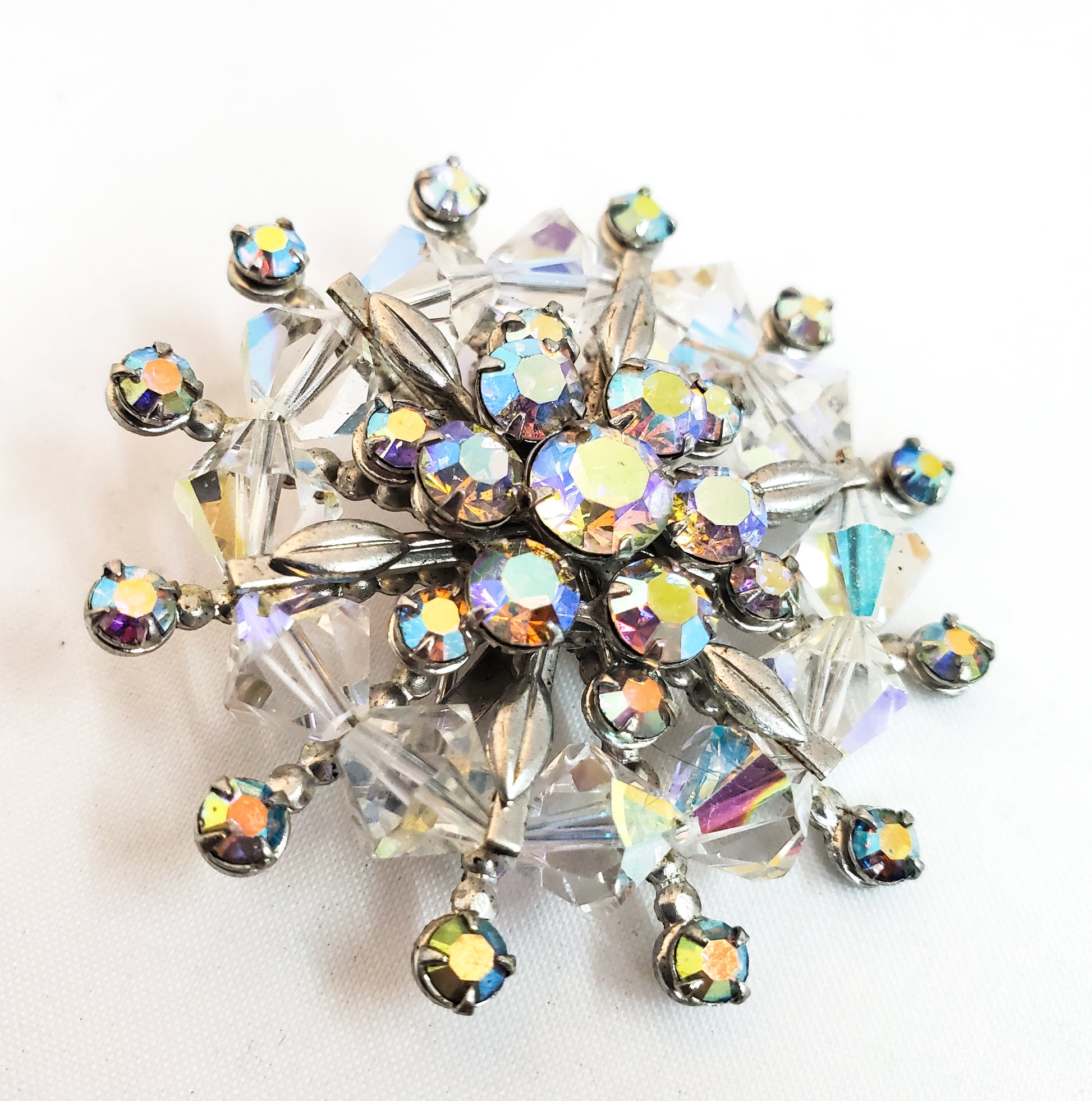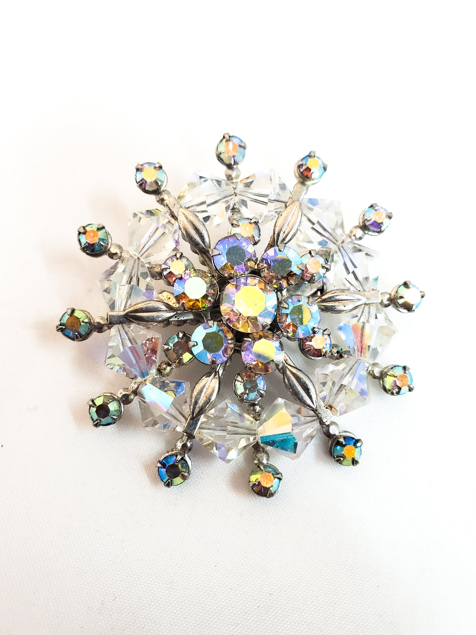 Mid Century Snowflake Brooch Austrian crystal and Aurora Borealis chaton rhinestone 1960's pin up