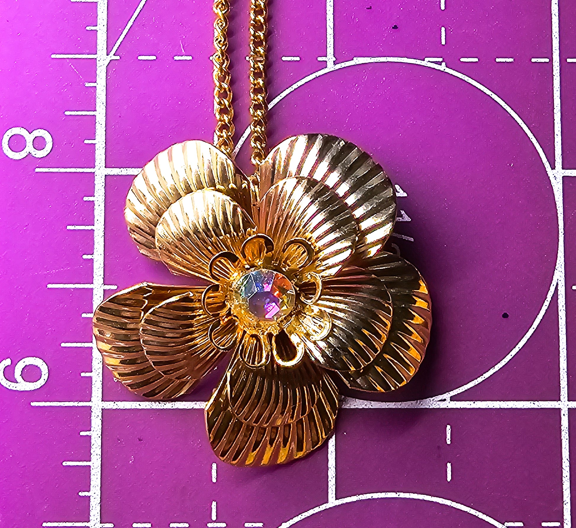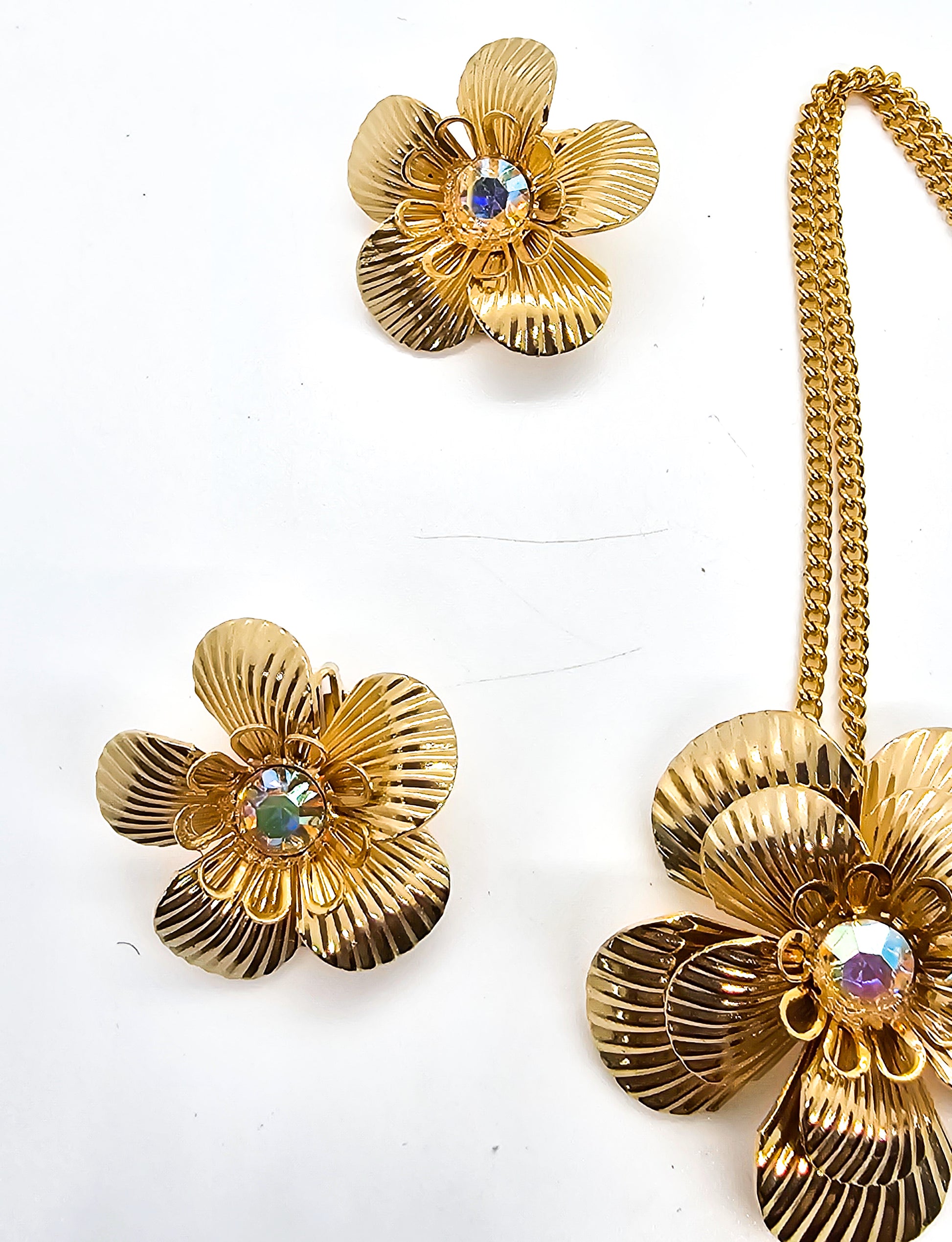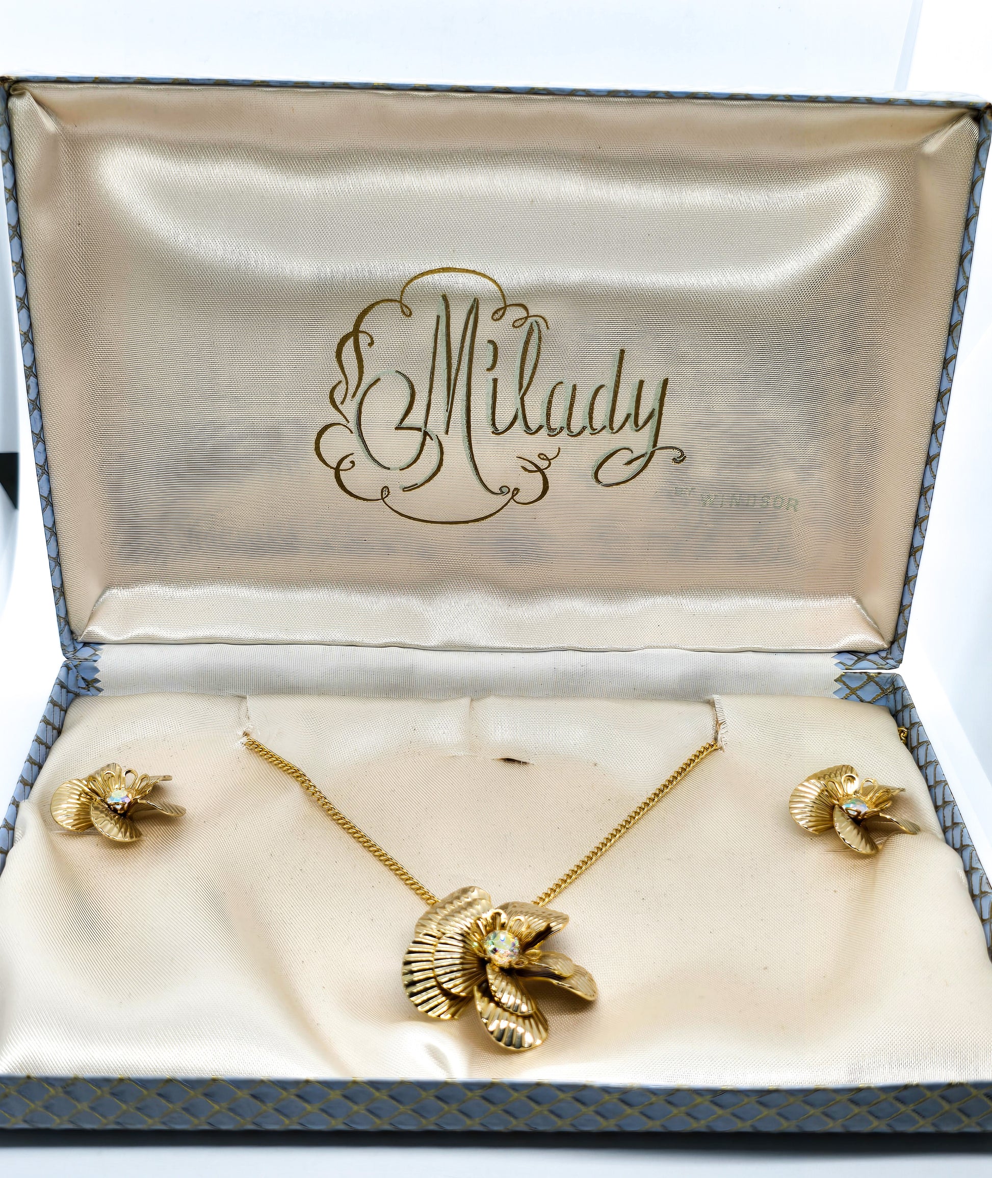 Milady Boxed gold Aurora Borealis vintage rhinestone earrings and necklace demi parure set. Good used vintage condition with some signs of wear. They come in the original box. The outside of the blue box has some discoloration as seen in pictures. Jewelry is in good condition with little to no signs of wear. Gold plating is bright. Each flower has aurora borealis rhinestone center. Earrings have clip on fastening.