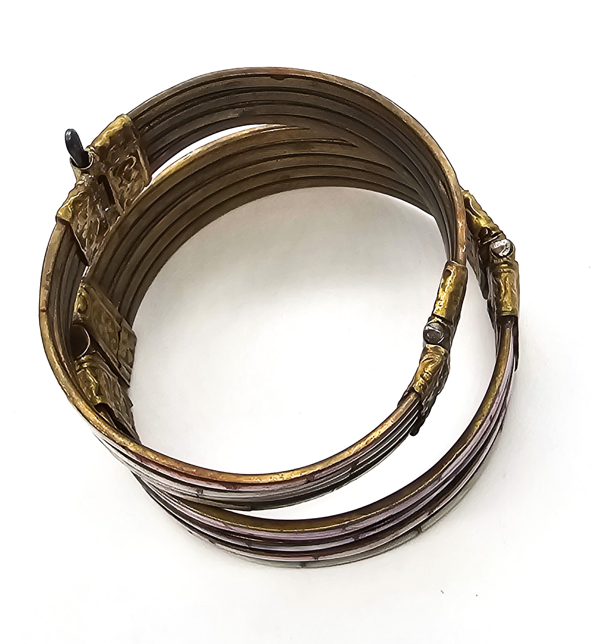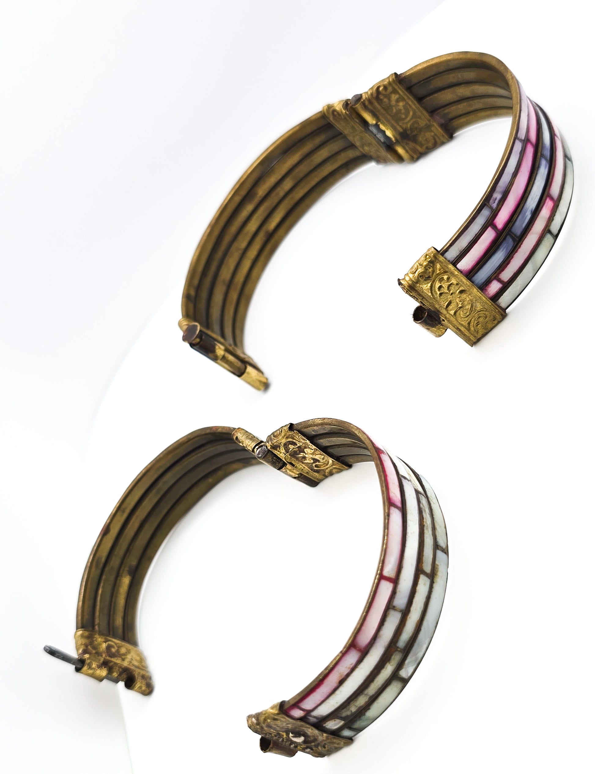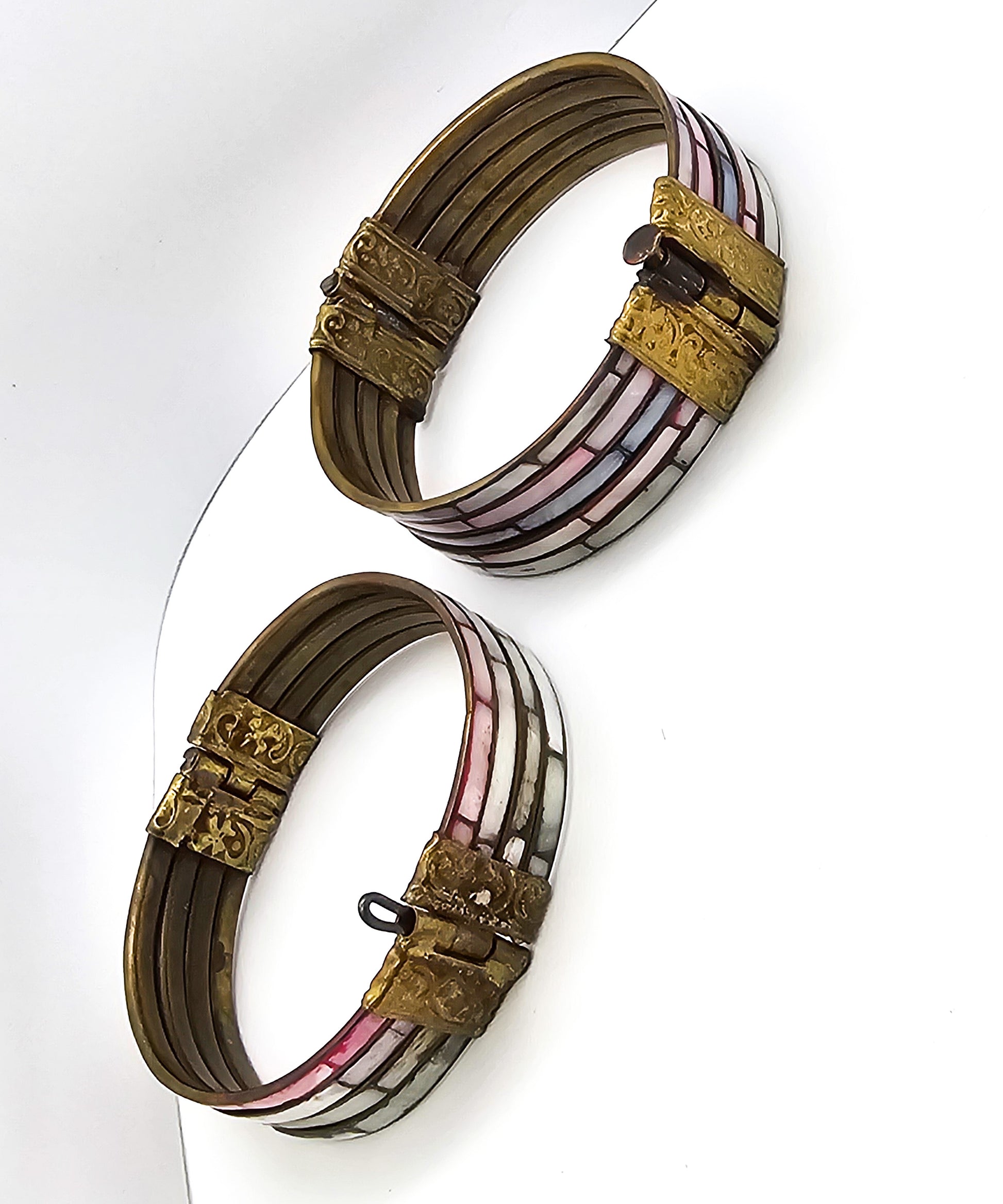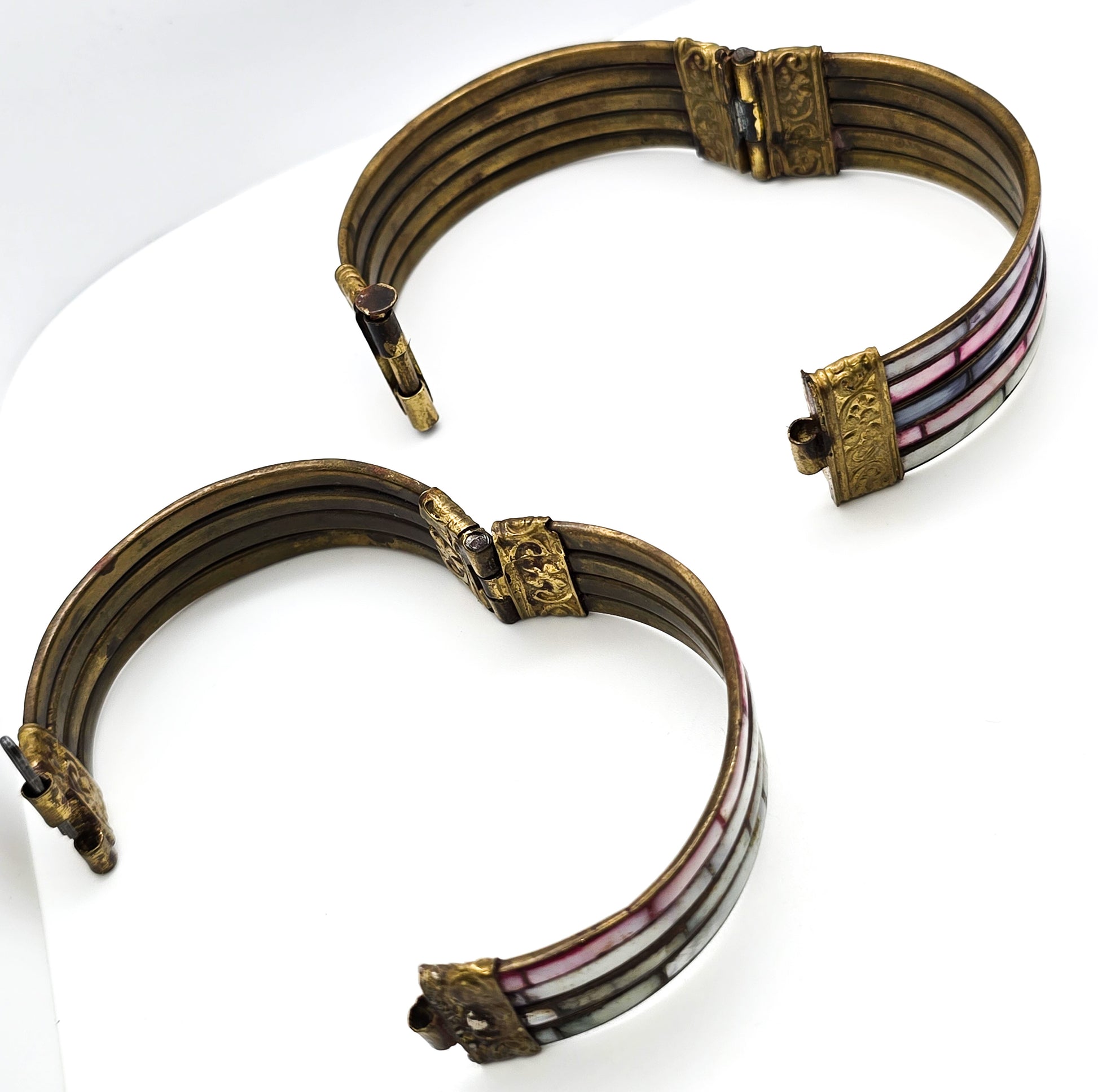 Mother of Pearl colored matching married bracelet pair men and woman set of two. These beautiful bracelets were acquired as a set. It was said that these were for a couple with one being larger than the other. Each of the bracelets are hinged in the center and use a pin that needs to be opened to be worn. The large one has 5 rows and original pin. The smaller bracelet has 4 rows and a replacement pin.