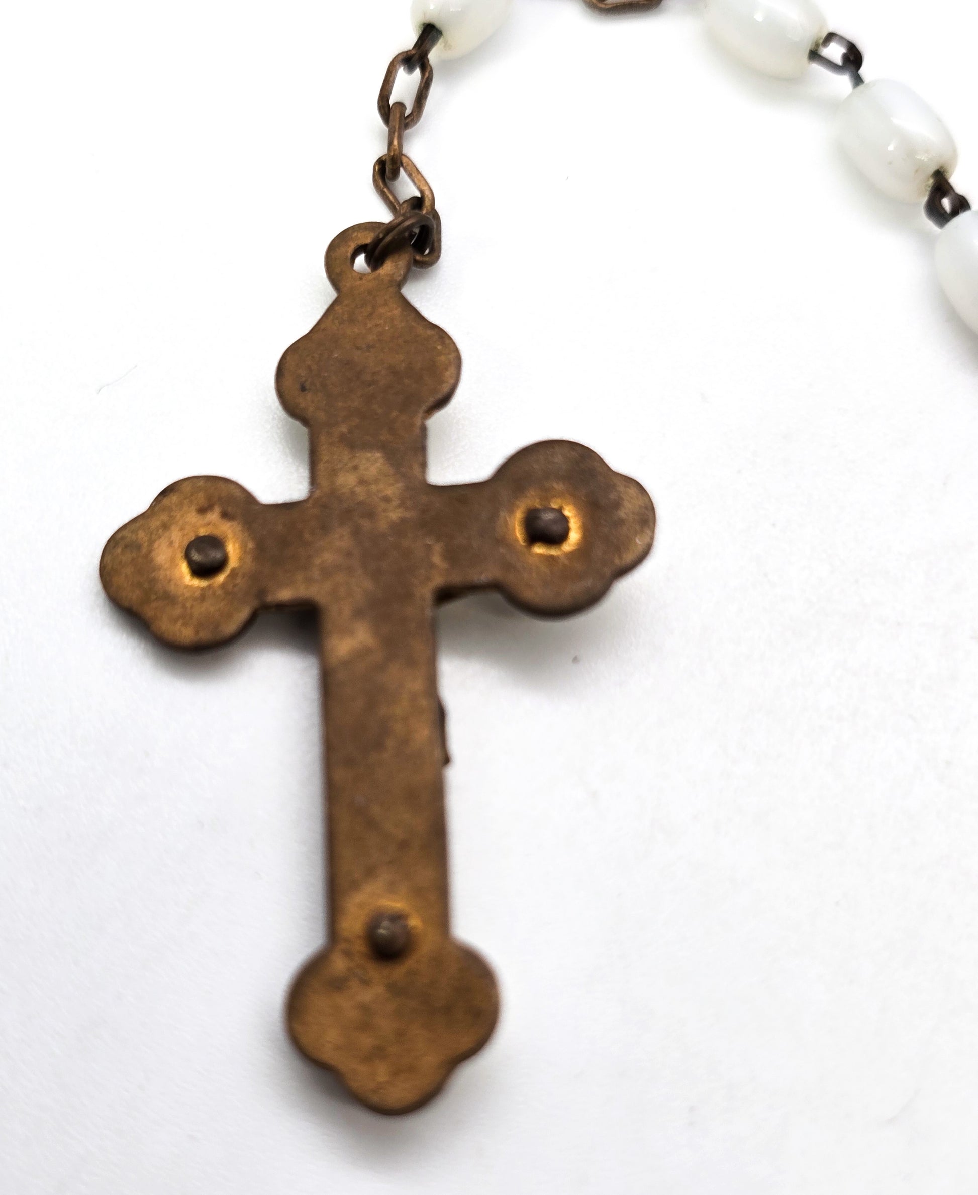 Mother of pearl gold toned vintage white Czech glass beaded rosary. Good used condition with small signs of normal wear. Gold toned metal shows small signs of aging. Great patina present. Mother of Pearl overlay between the crucifix and the cross.
