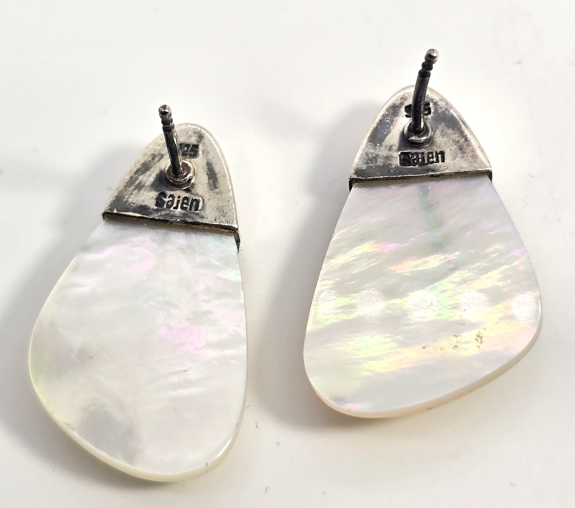 Sajen Mother of Pearl MOP gemstone sterling silver tear drop vintage post earrings. Lovely modern sterling silver tear drop earrings with mother of pearl. Great vintage condition with little signs of normal vintage wear. Stamped 925 Sajen on the back of the earrings. All post earrings come with new sterling silver butterfly earring backings.