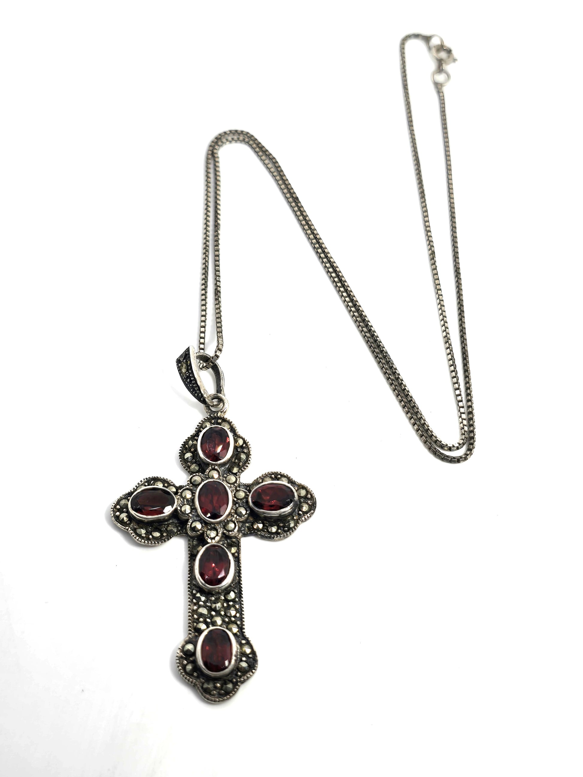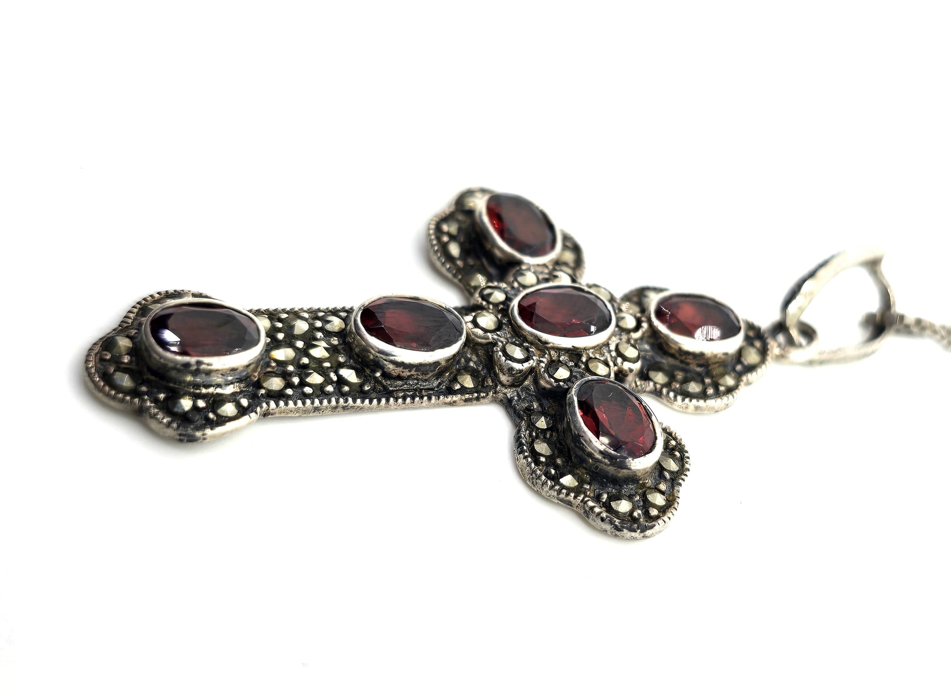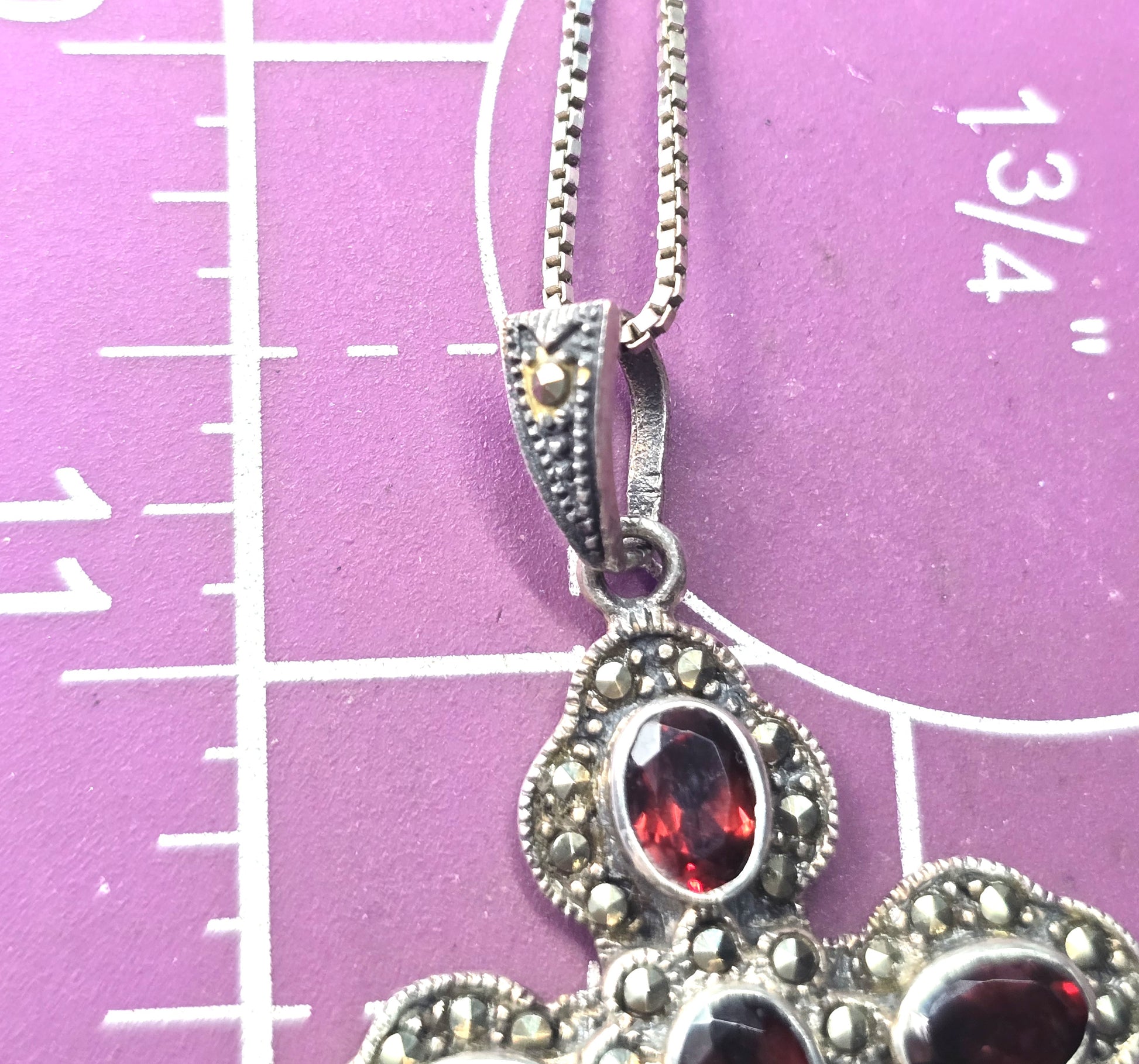 Garnet large multistone marcasite vintage sterling silver cross necklace. Good used condition with little to no signs of normal wear. Stamped 925 on the inside of the bail. Comes with sterling silver chain. No missing stones.