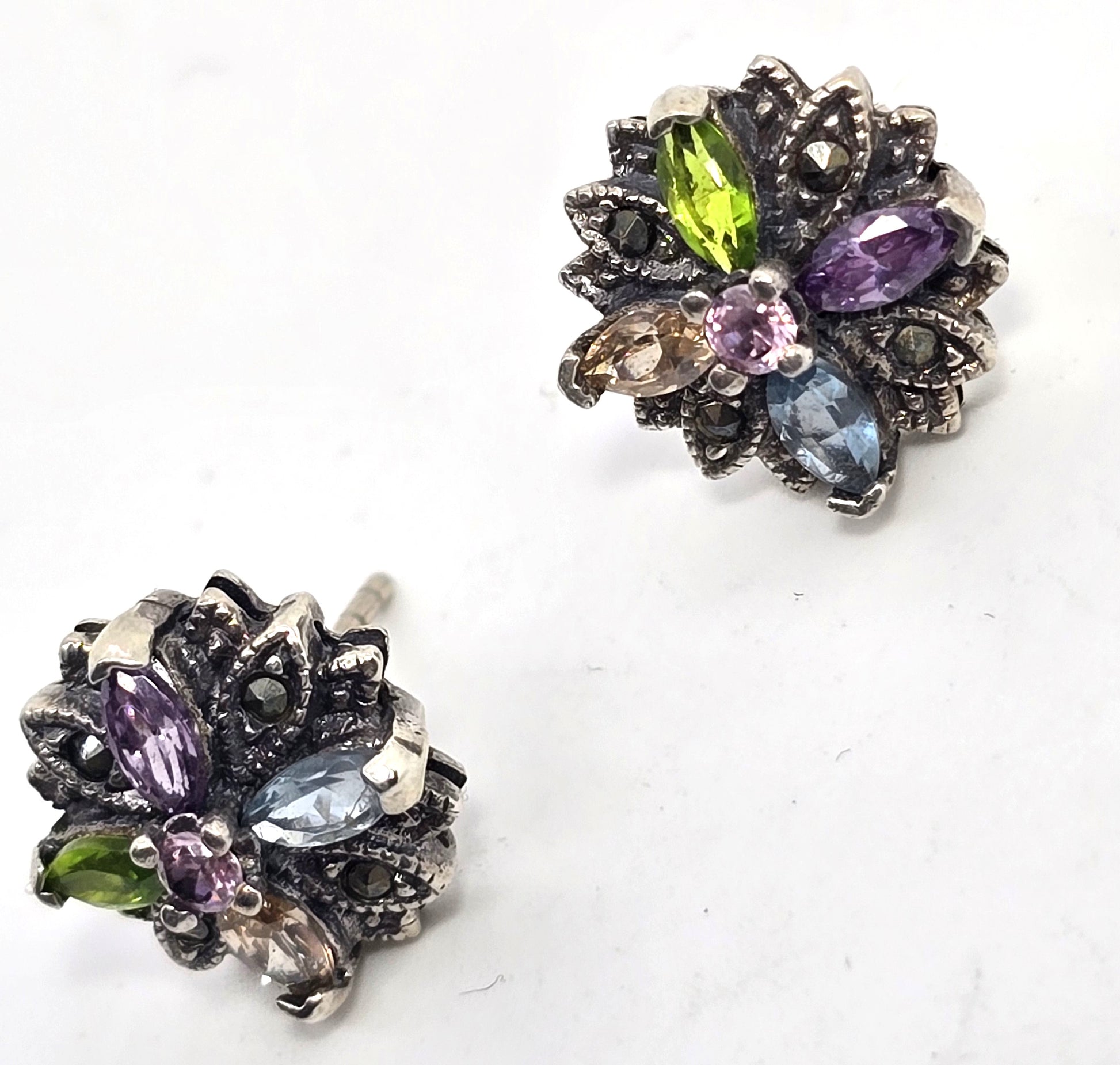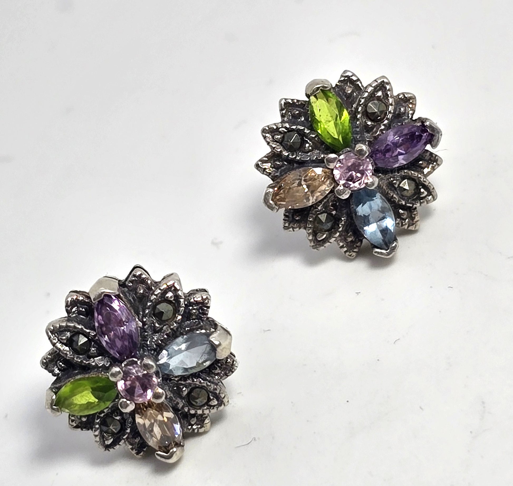 Multi gemstone marquis Cubic zirconia marcasite Sterling Silver stud earrings Good used condition with little to no signs of normal wear. Stamped 925 on the back of the earrings. No missing stones. All post earrings come with new sterling silver butterfly earring backings.