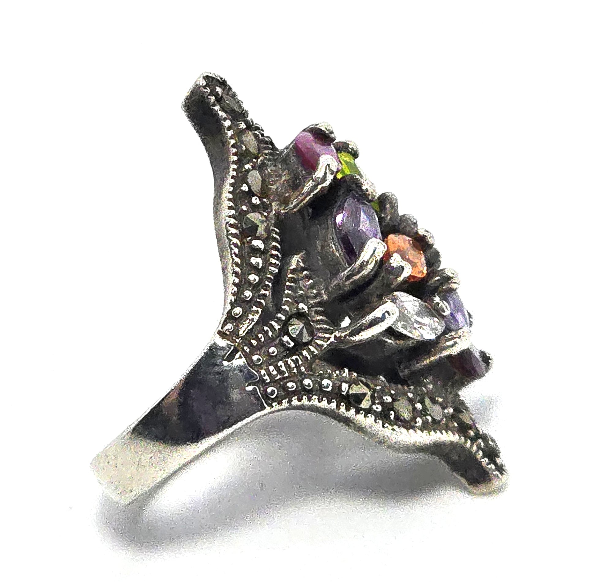 Multicolor Multi gemstone large marcasite vintage Sterling Silver Ring size 5