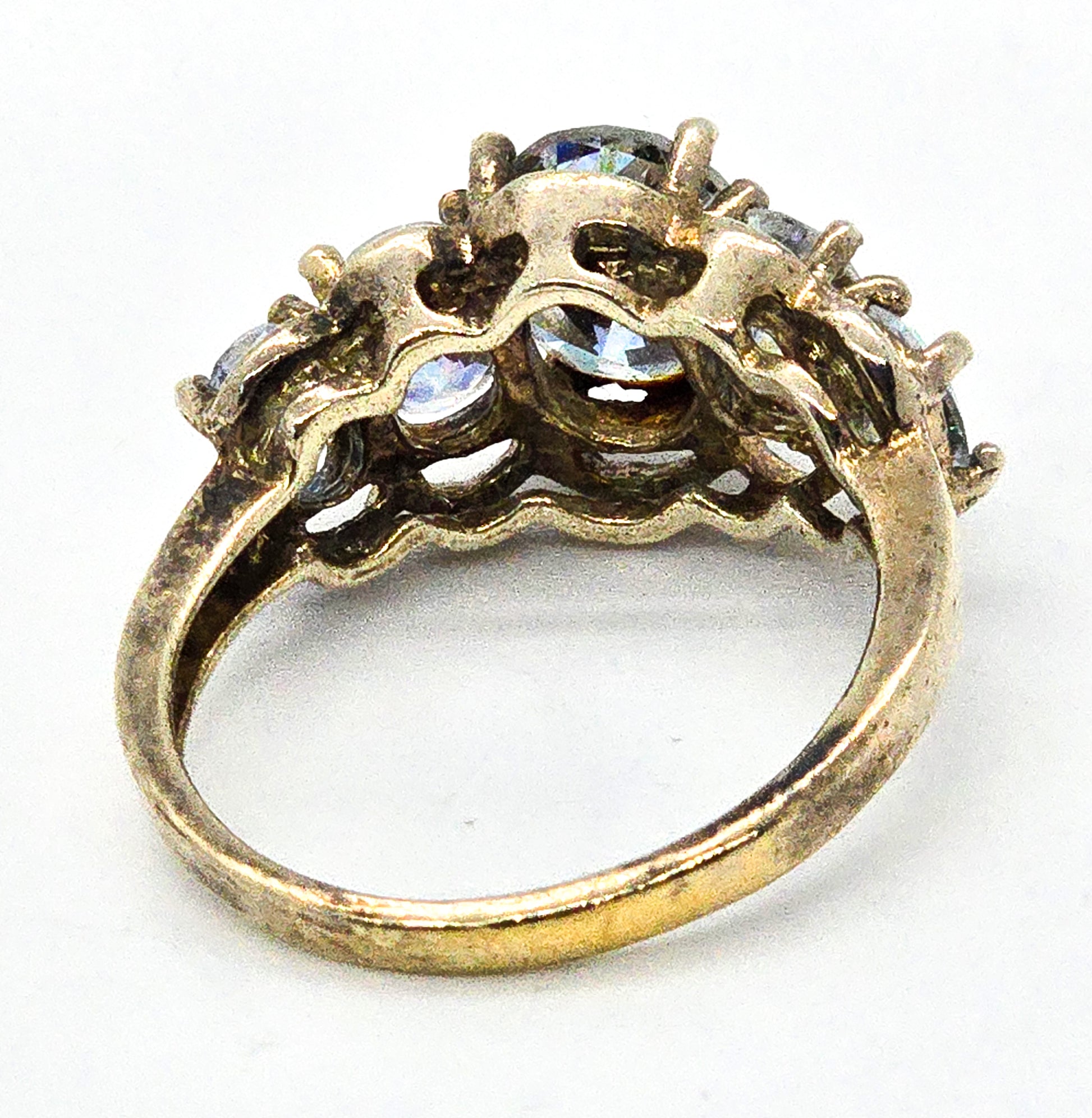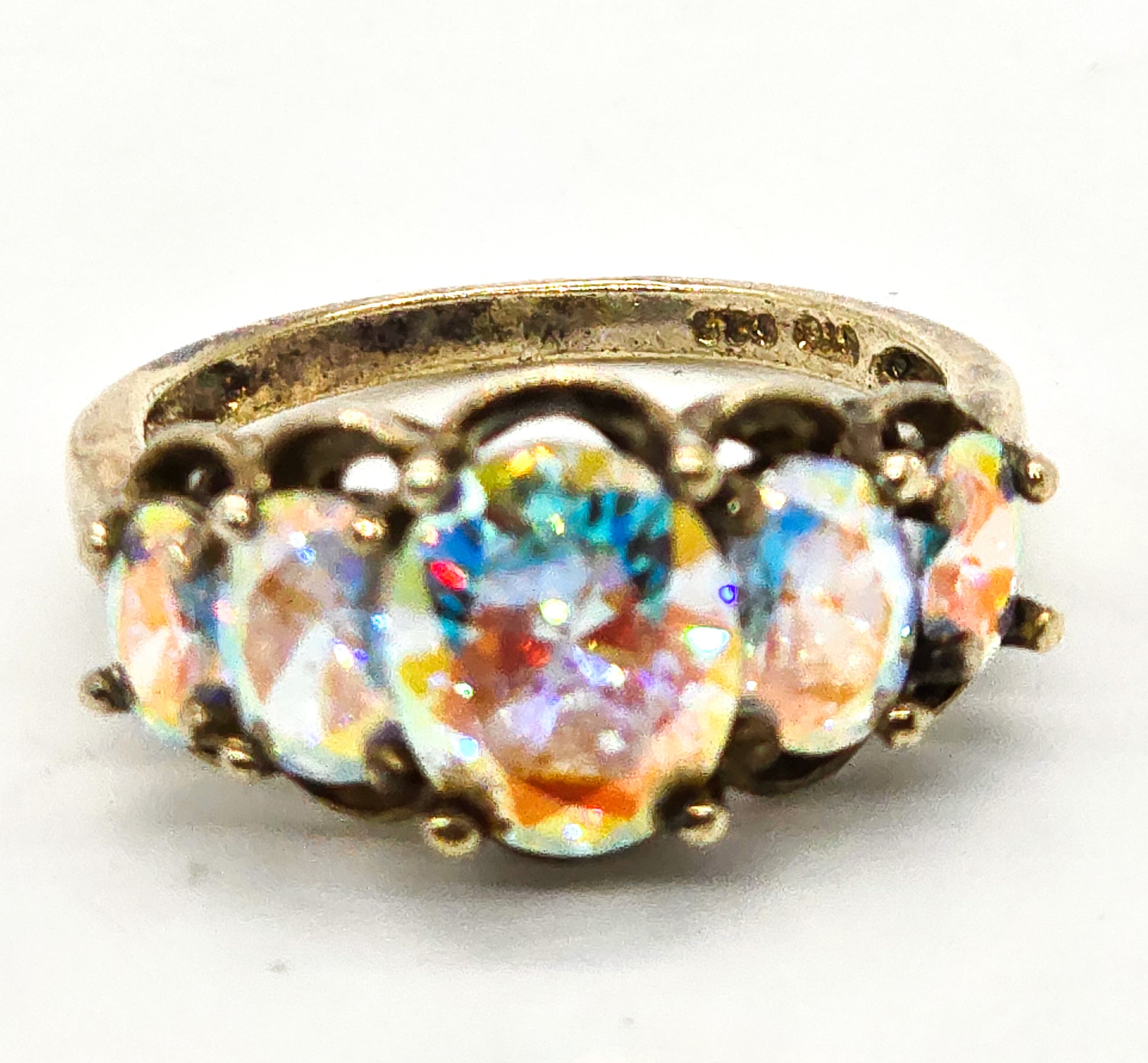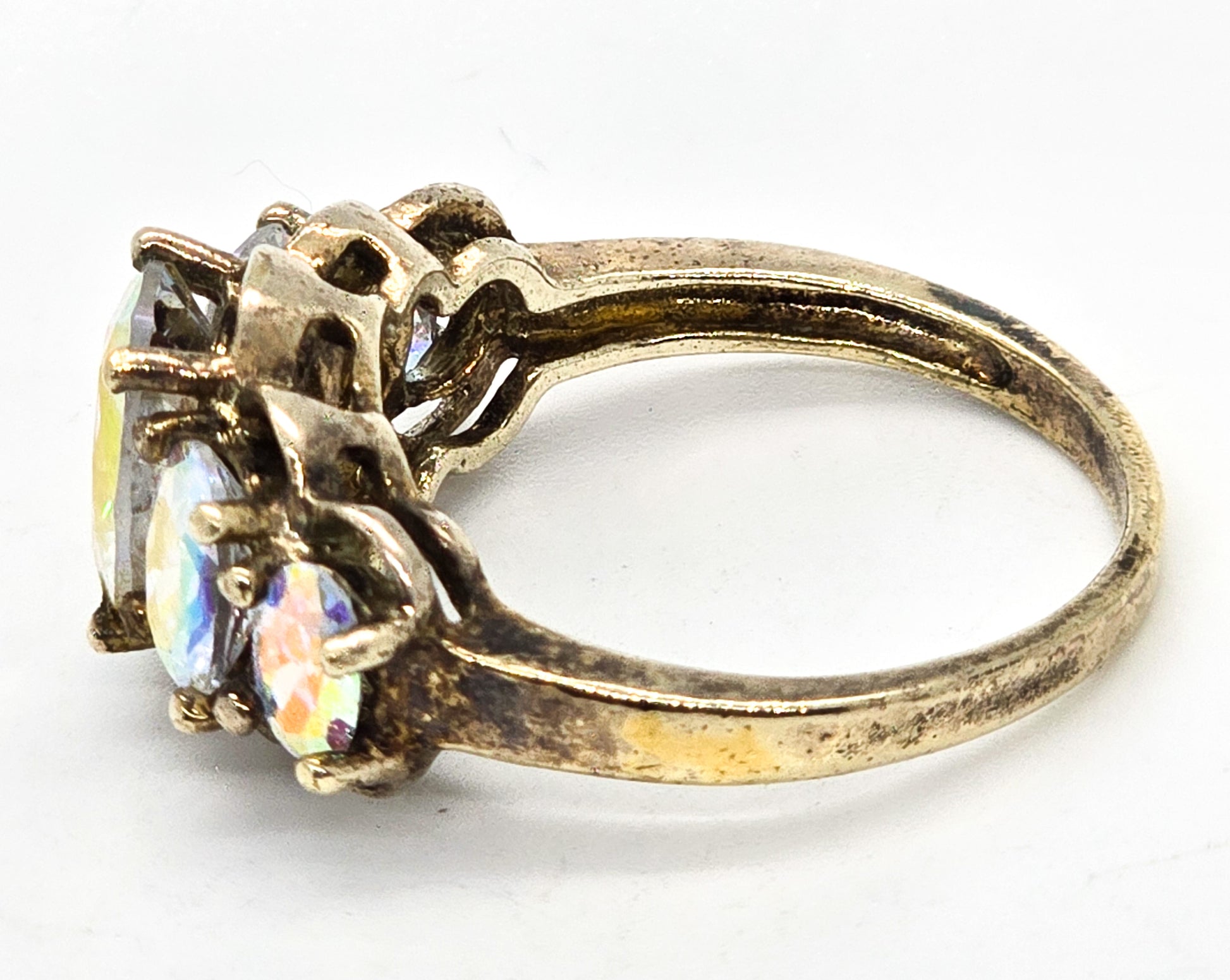 Mystic Topaz 5 stone UTC vermeil statement ring. Good wearable used condition with small signs of normal wear. Beautiful shining faceted stones are prong set in a graduated pattern. Stamped STS 925 on the inside of the band. Gold vermeil overlay on the sterling silver has some signs of wear and base metal can be seen under magnification.