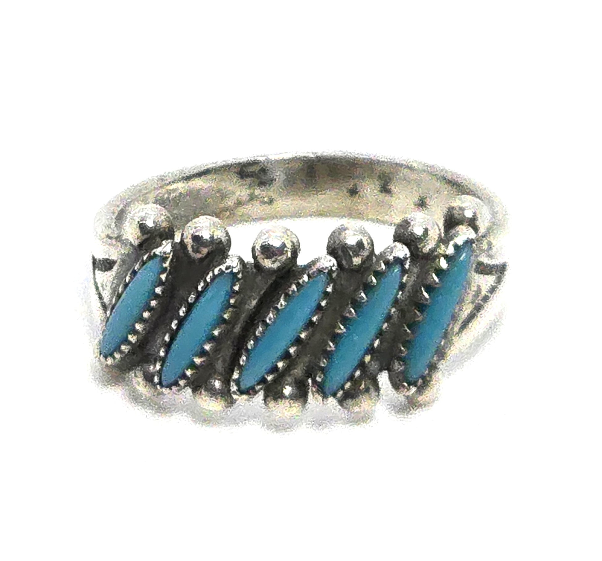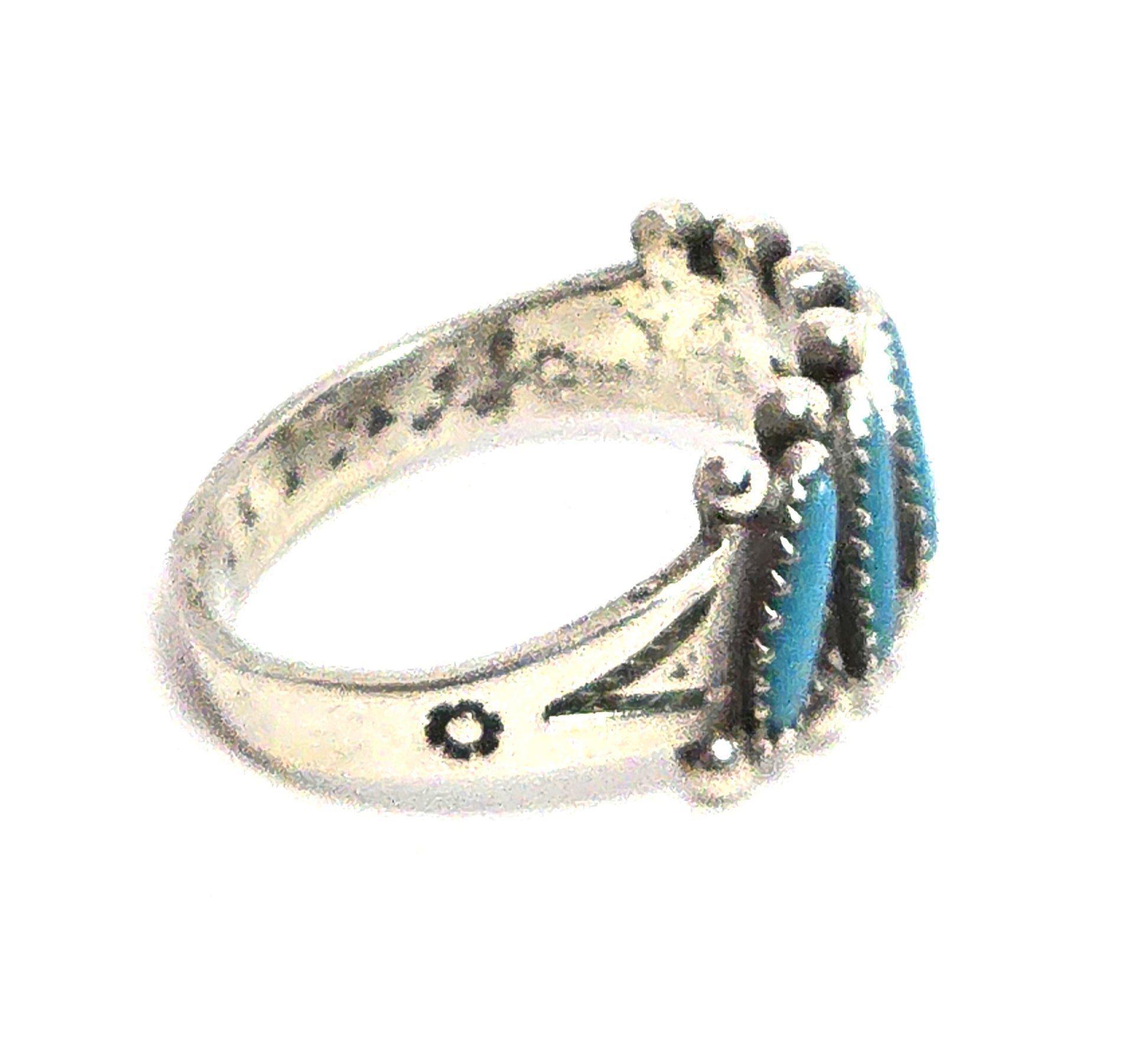Bell Trading Native American Zuni petite point sterling silver vintage ring Good vintage condition with little signs of normal vintage wear. Great vintage patina. Each turquoise stone has been hand set into this stunning ring. Stamped on the inside of the band Sterling with the iconic bell trading post hallmark. They used Native American silversmiths to design jewelry for their stores.