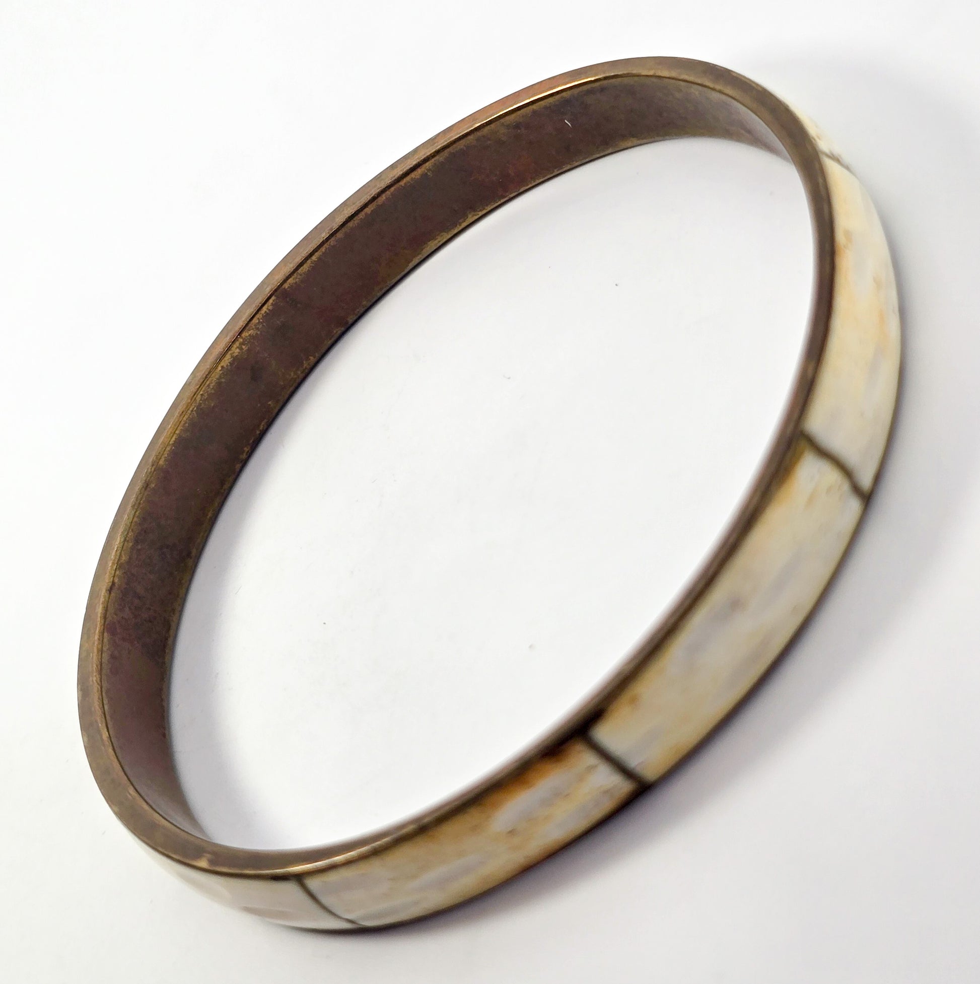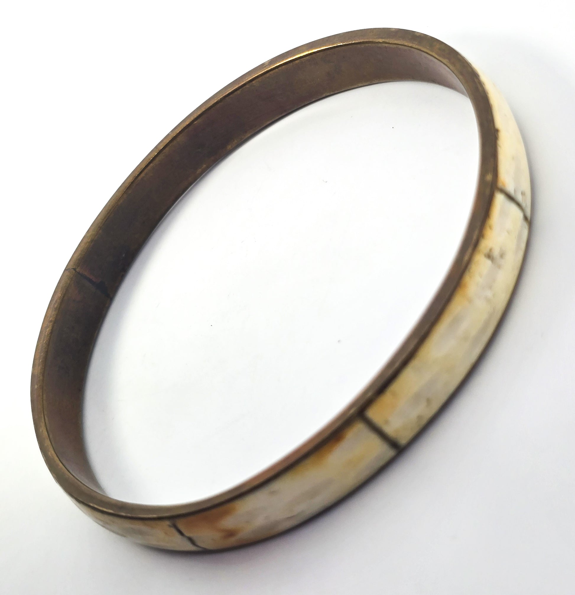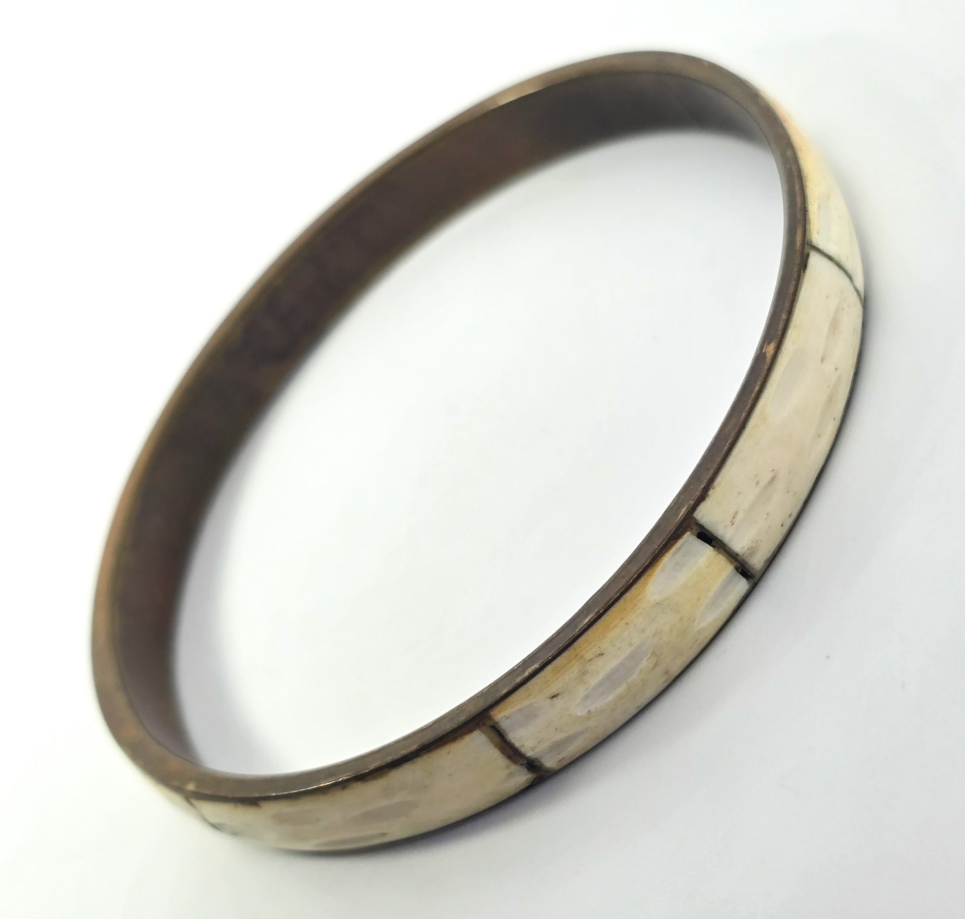 Natural cream inlay carved vintage brass bangle panel bracelet . Good used condition with little signs of normal wear. Brass shows some spotting and small signs of normal wear. Great patina. Bracelet has been left in original found condition. Thick solid construction.