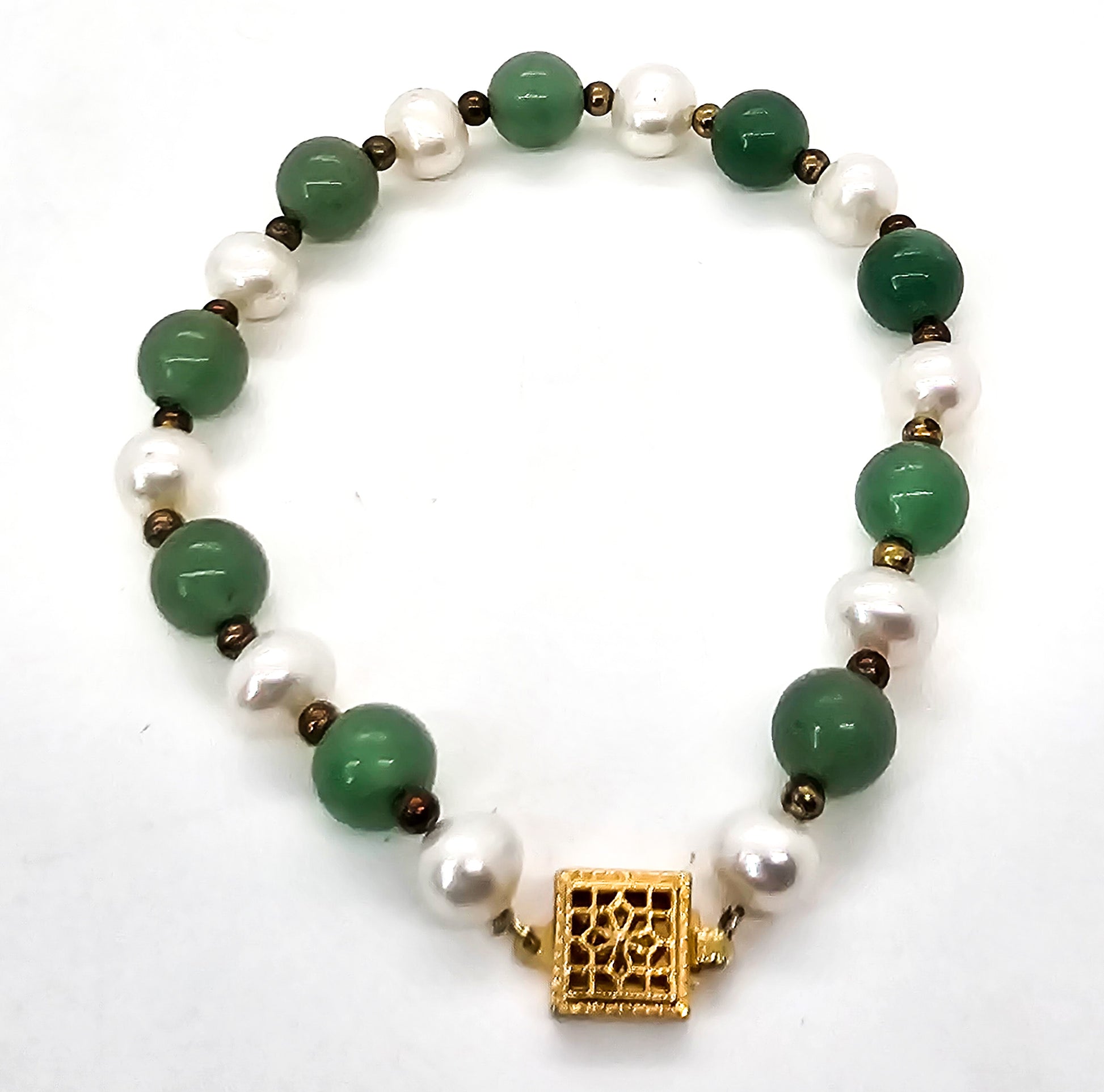 Nephrite Jade and White Freshwater Pearl 14k gold filled bracelet. Good condition with little to no signs of wear. Stamped 14/20 for 14k gold filled on the side of the clasp. Beads alternate with gold filled spacers.