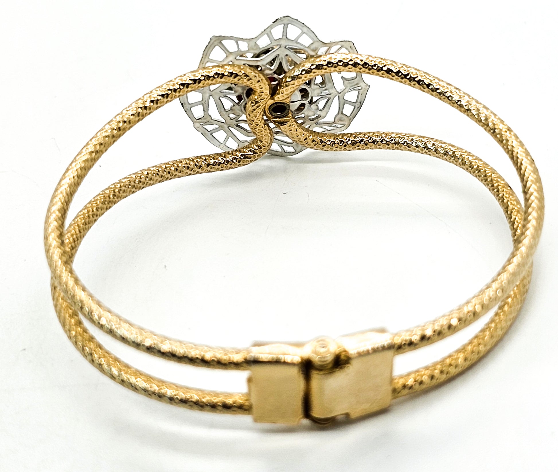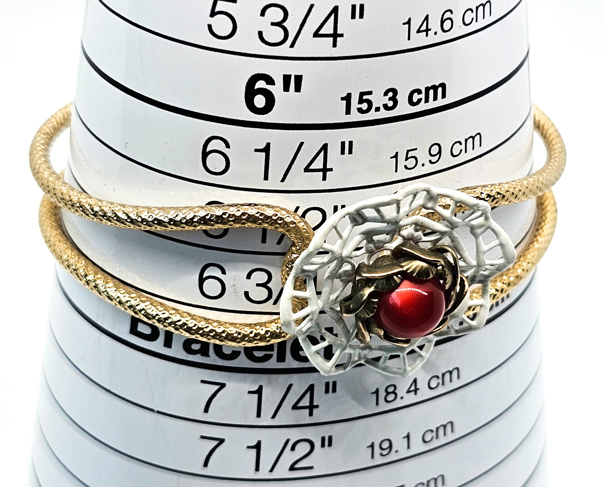 Open work Red and white flower vintage gold toned clamper bracelet. Good vintage condition with little to no signs of normal wear. White open work mesh flower with brass and red glass accents. Gold toned textured clamper style.