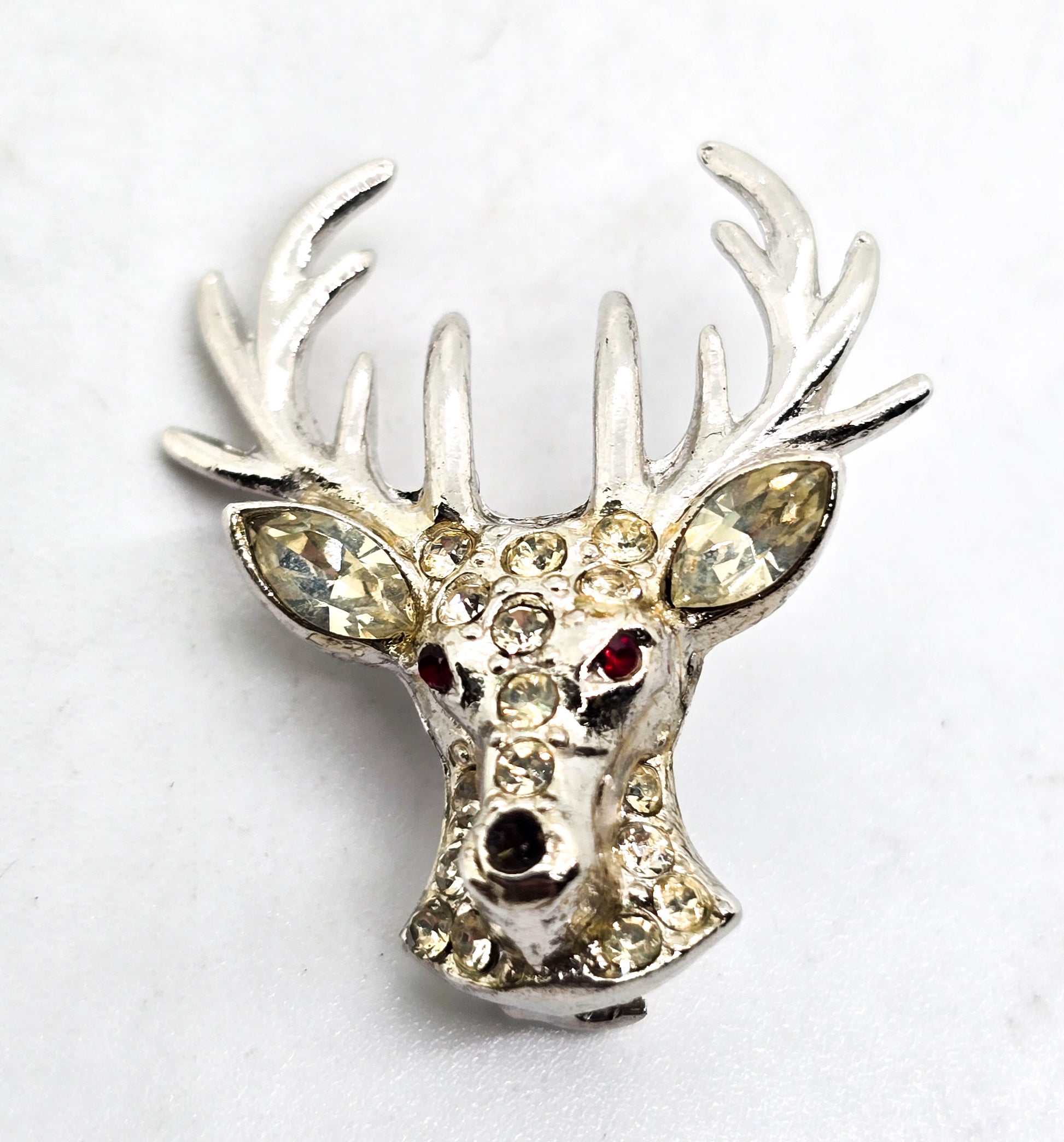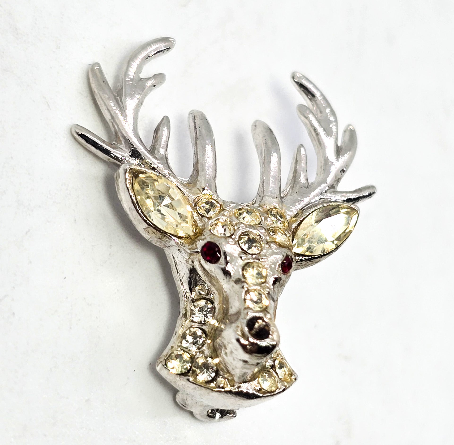 ORA Ruby Red Eyed Crystal Paved rhinestone vintage Reindeer Pin/Brooch. Good used condition with little to no signs of wear. No missing stones.. Shiny silver toned setting. Stamped ORA on the back of the brooch.