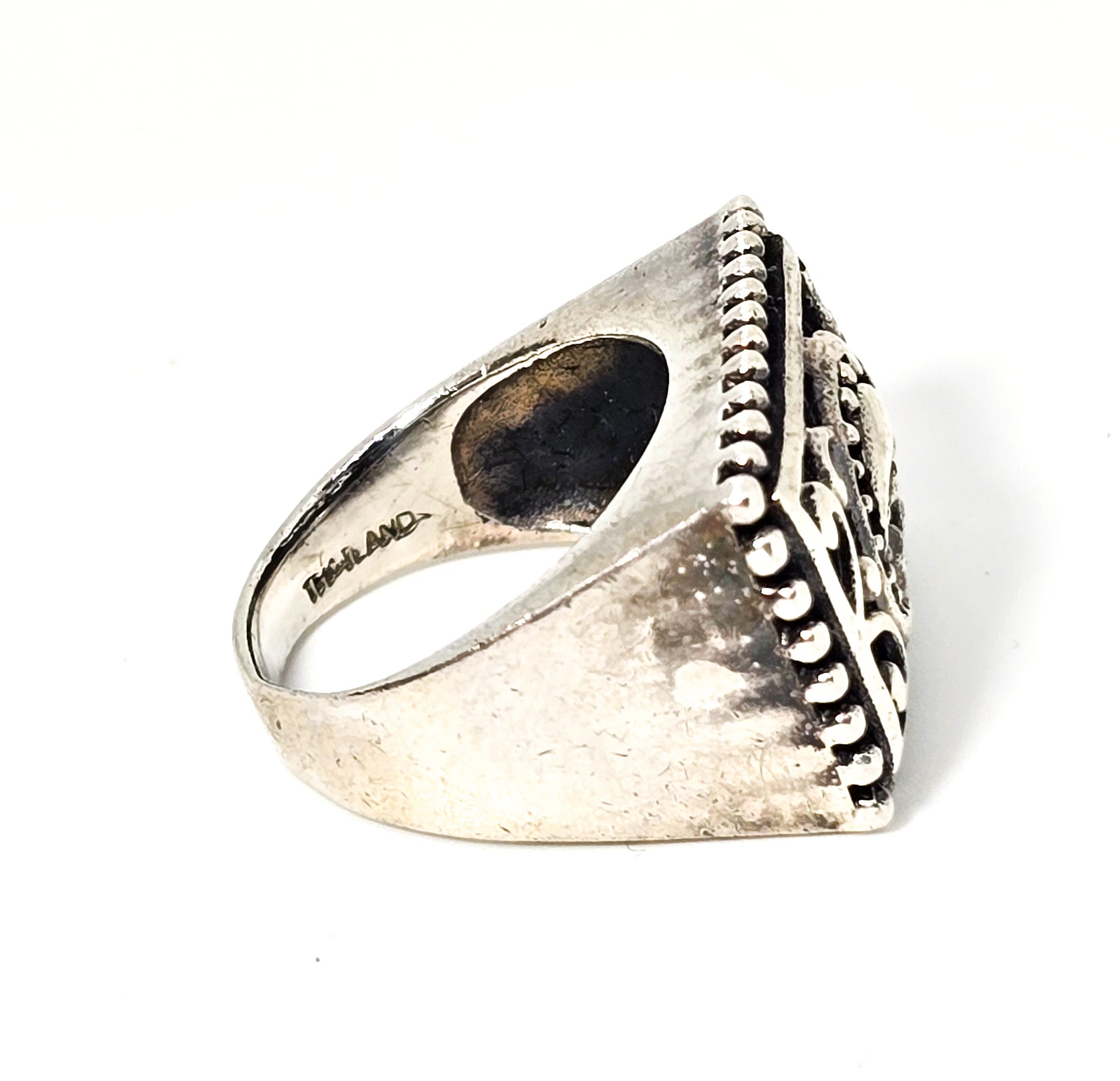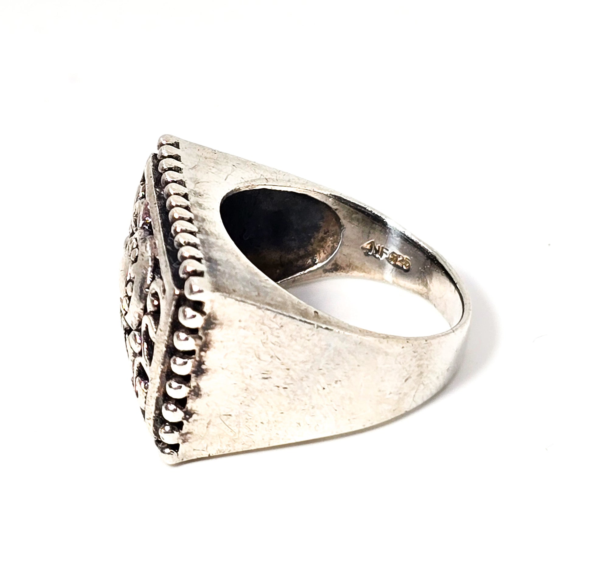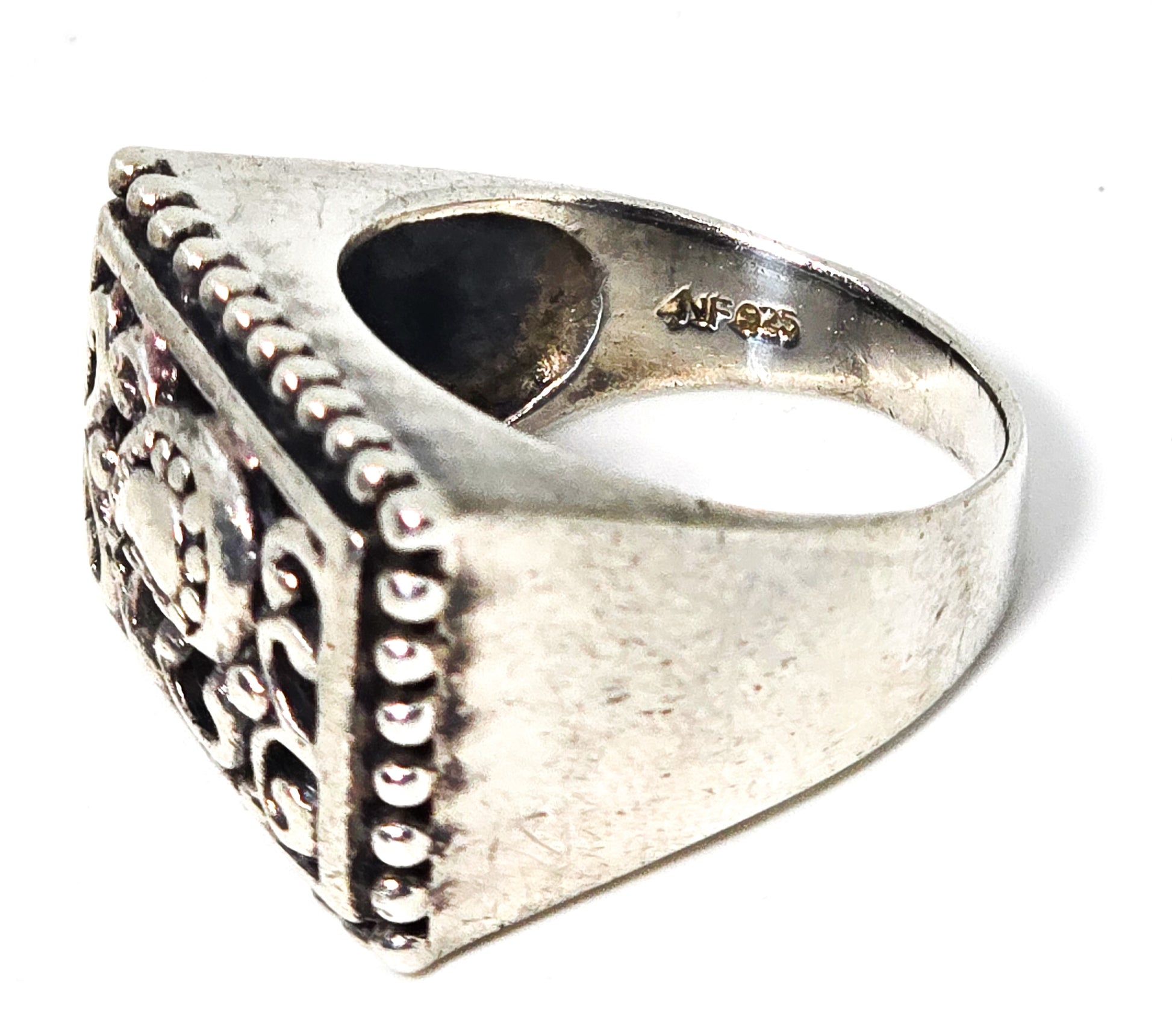 Paisley Scroll Design open large Sterling Silver NF Plaque Ring. Stamped on the inside of the band NF 925 Thailand. Good used condition with little to no signs of normal wear. Great vintage patina. Open work design.