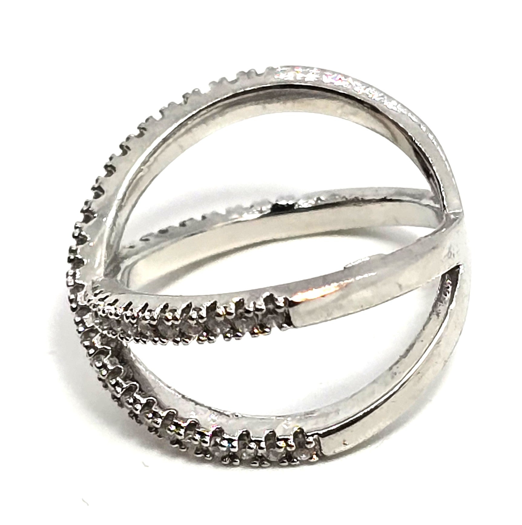 Criss Cross X Cubic zirconia pave set rhodium plated sterling silver ring size 6