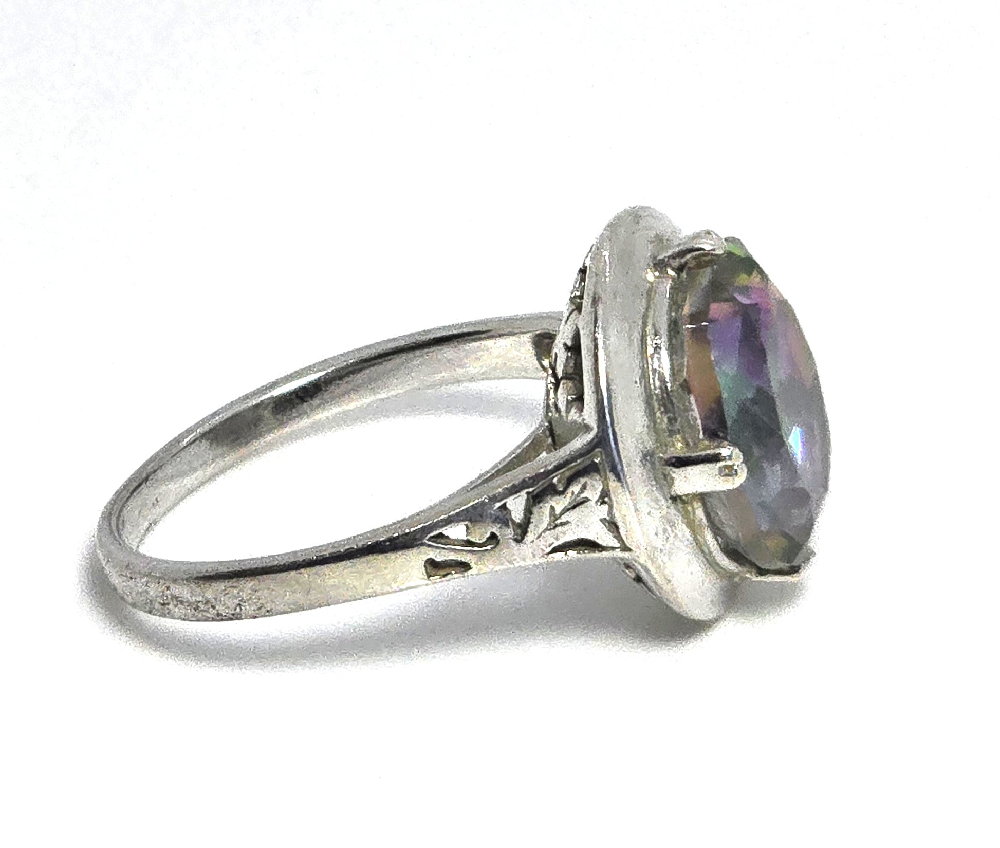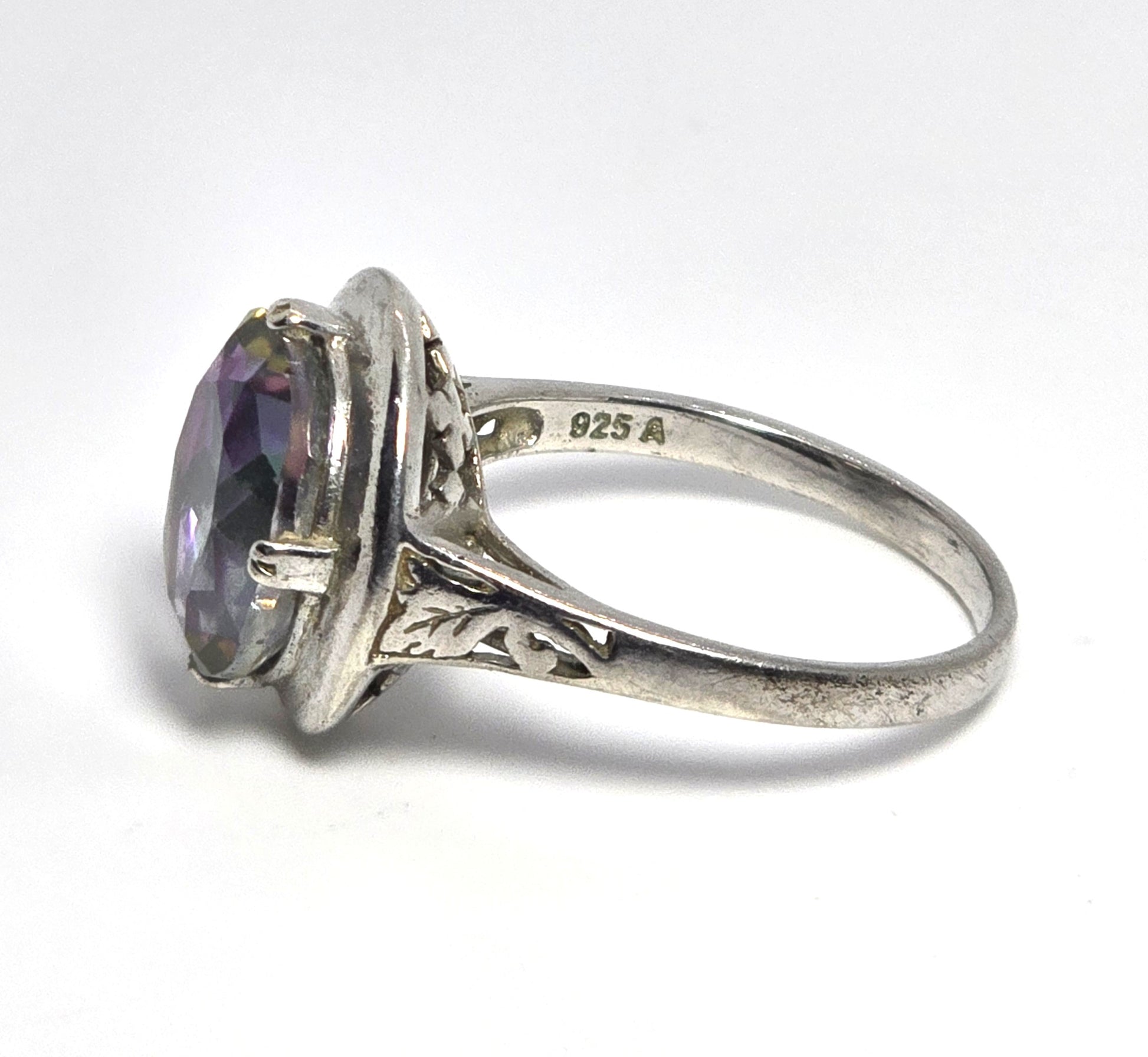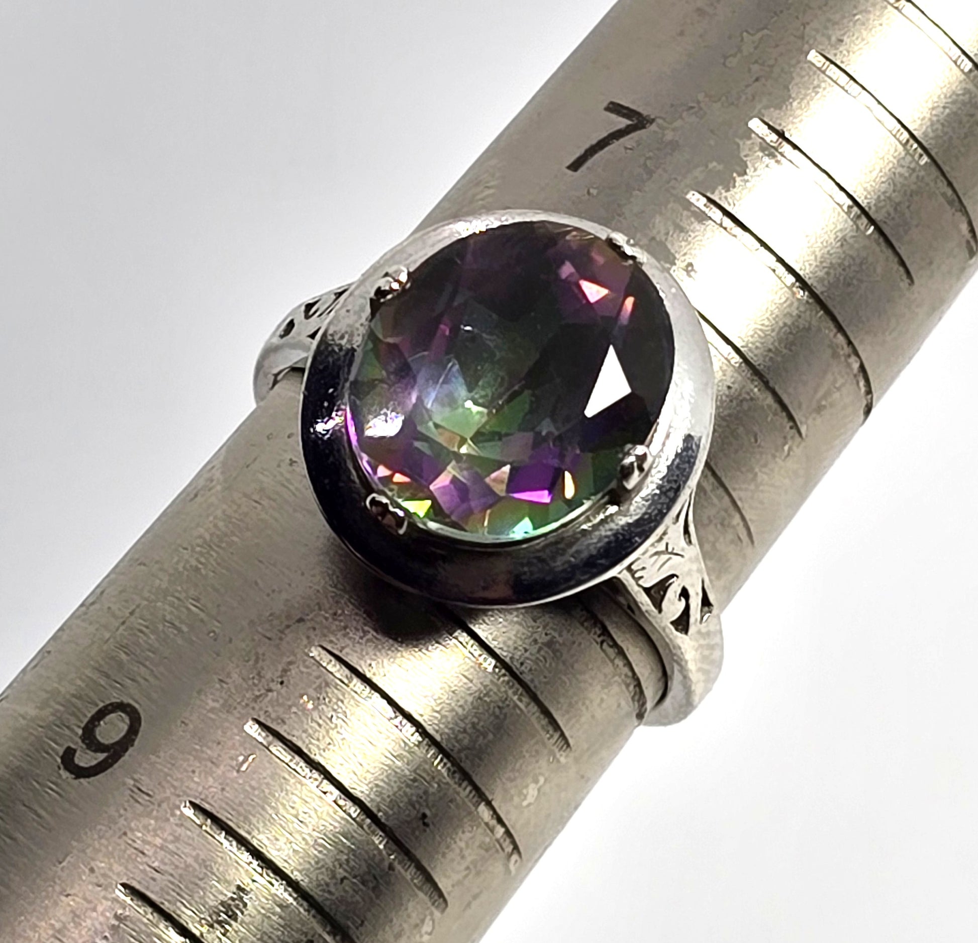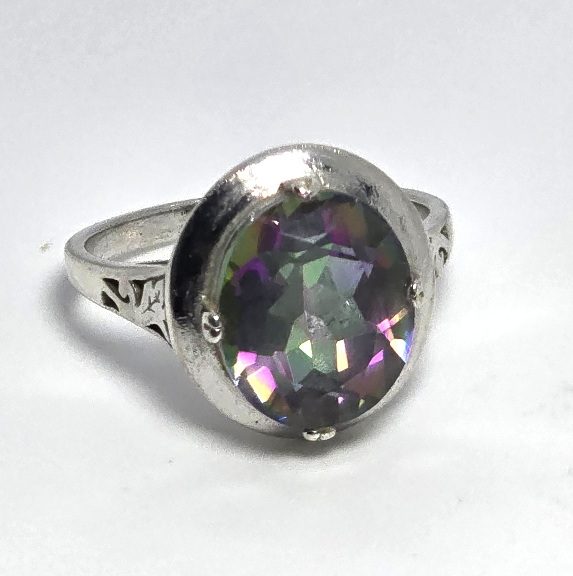 Peacock Mystic Topaz 5ct oval cut faceted sterling silver solitaire ring. Good used condition with little to no signs of normal wear. Stamped on the inside of the band 925 with an A hallmark. Stone measures 12mm by 10mm