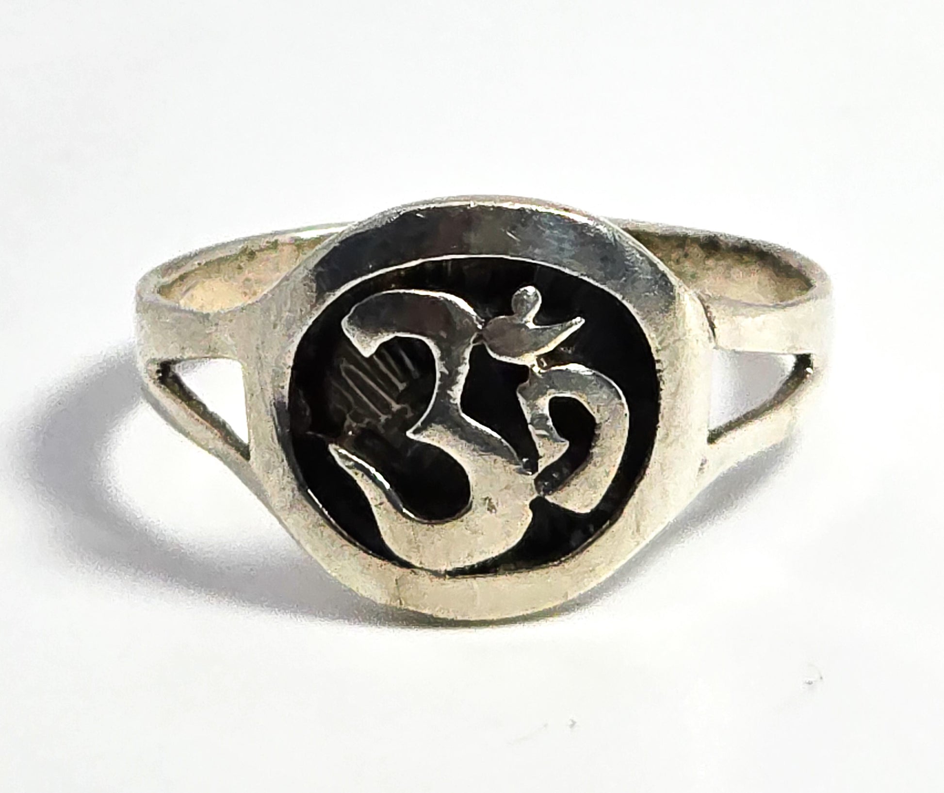 Om Shanti Awakening the Sacred Mantra sterling silver ring. Good used condition with little to no signs of normal wear. Stamped on the inside of the band 925.