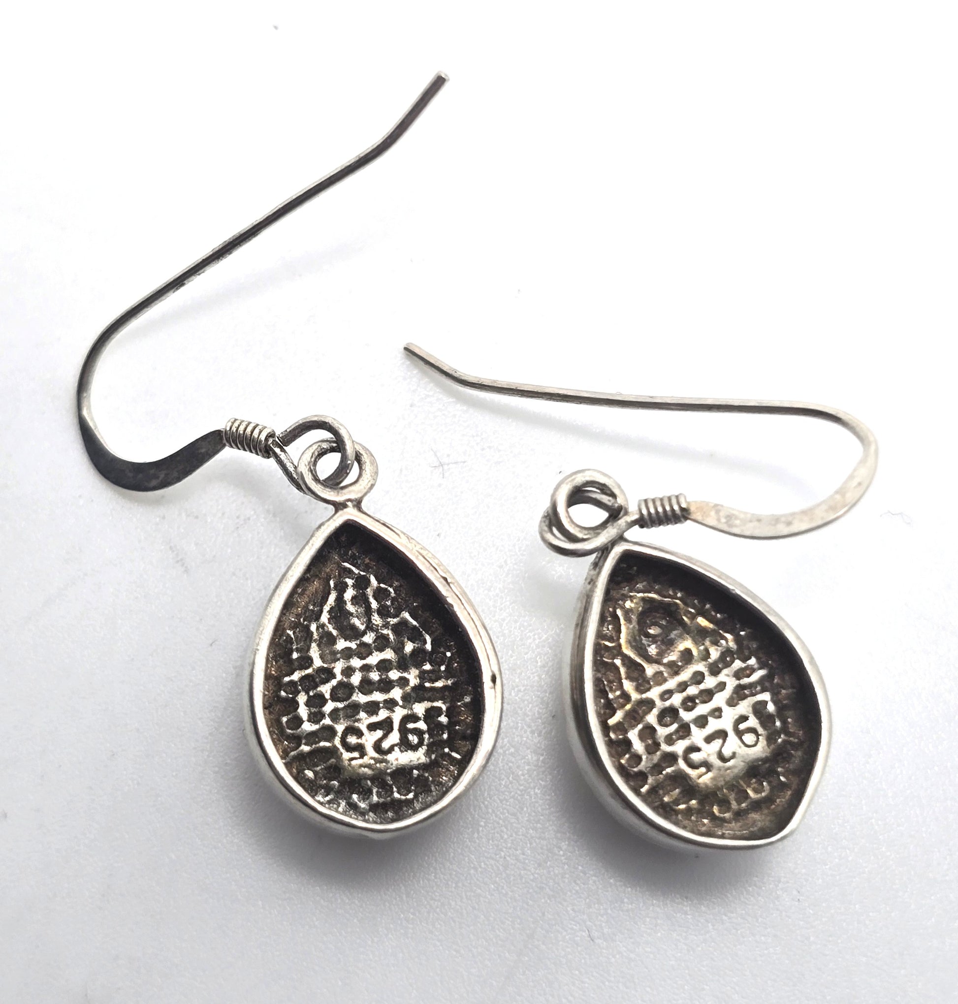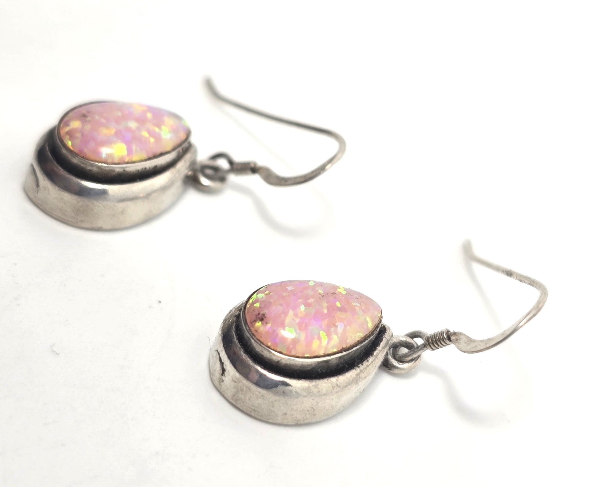 Pink synthetic Fire opal pear cut gemstone sterling silver drop earrings. Good used condition with little signs of wear. Stamped on the reverse 925.