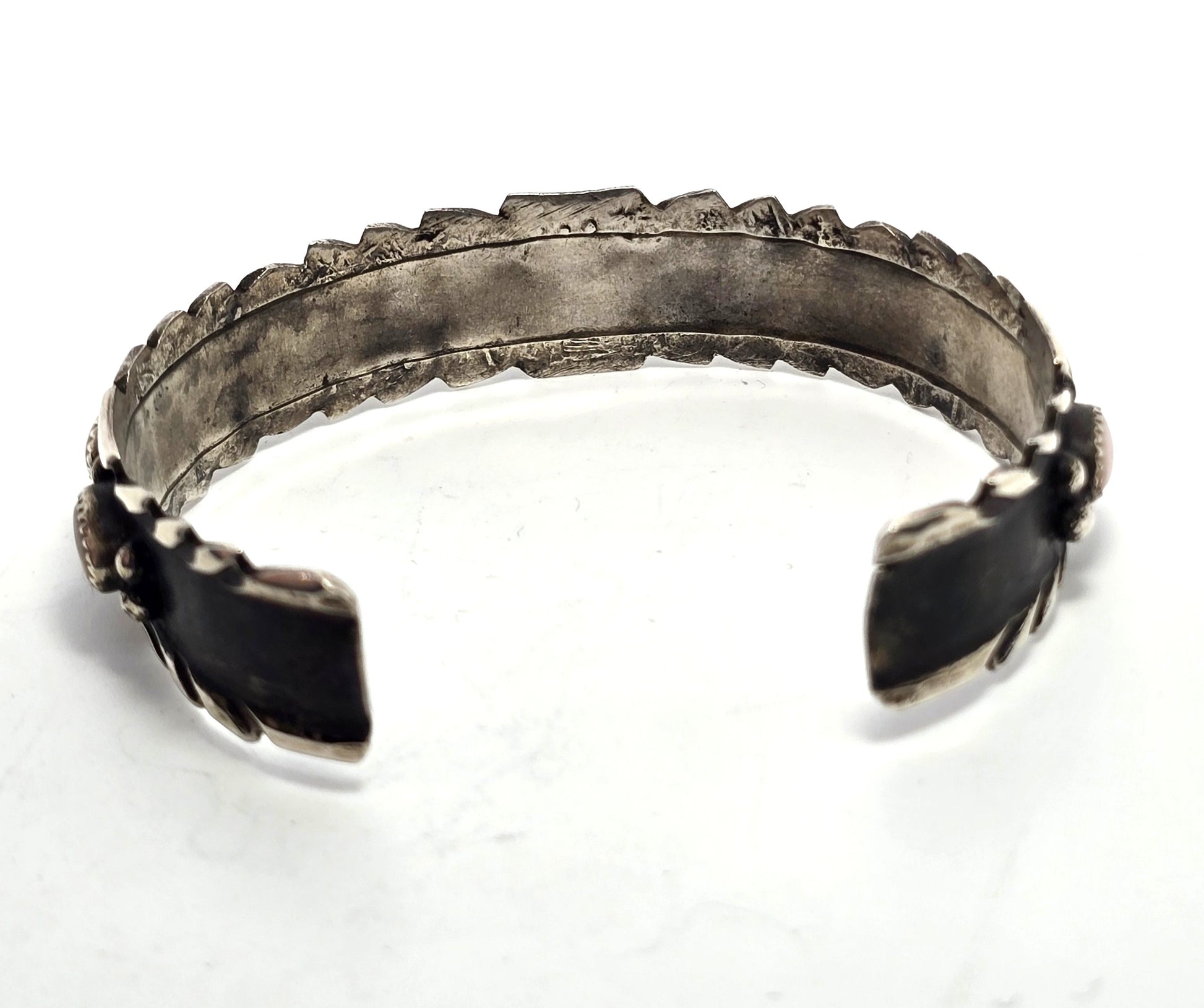 Pink slipper shell Native American vintage sterling silver MOP vintage cuff bracelet. Good used condition with little to no signs of normal wear. Great vintage patina. Sawtooth bezel set stones. No missing stones. Stunning thick silver construction. Handcrafted tooling marks present on the back side.