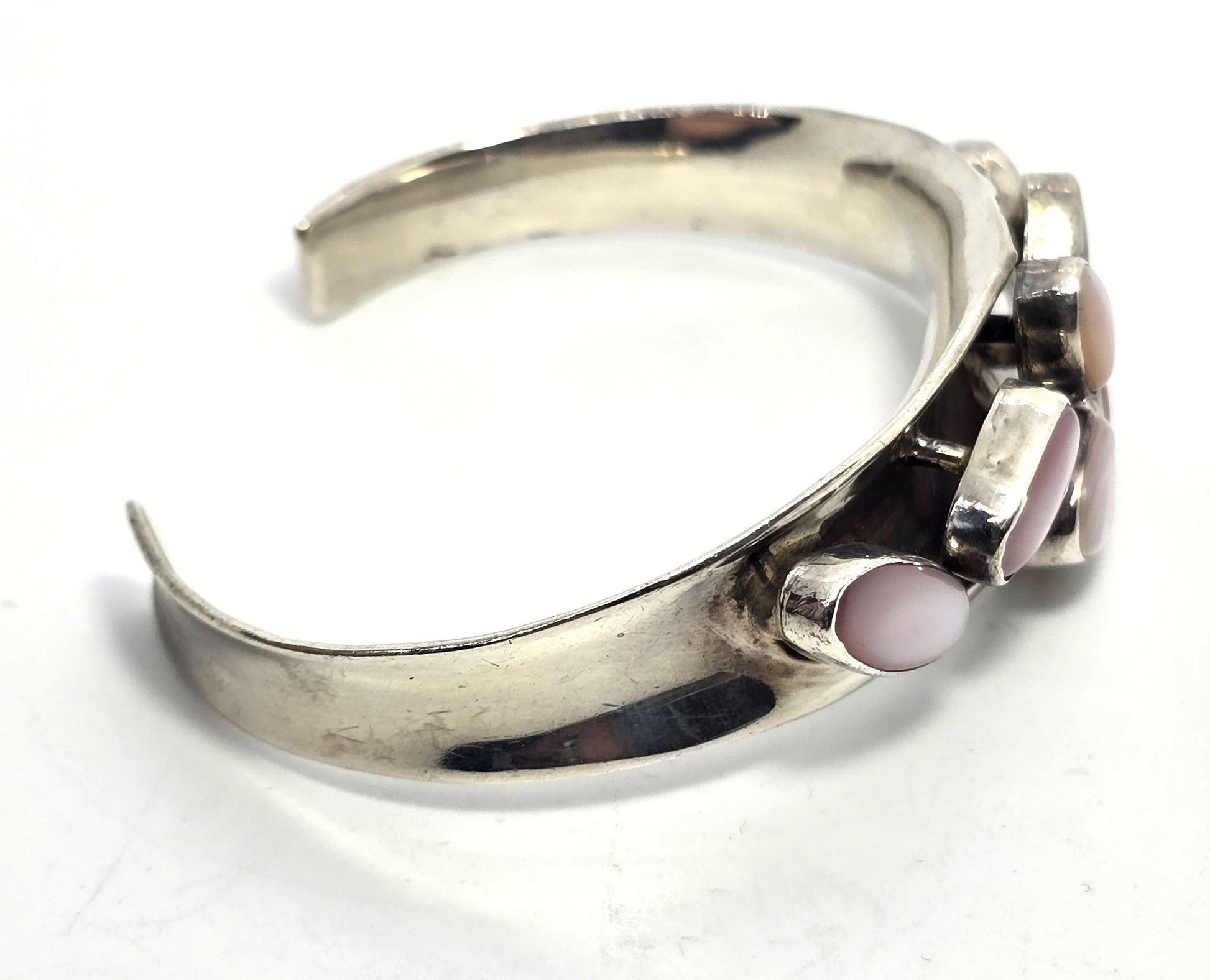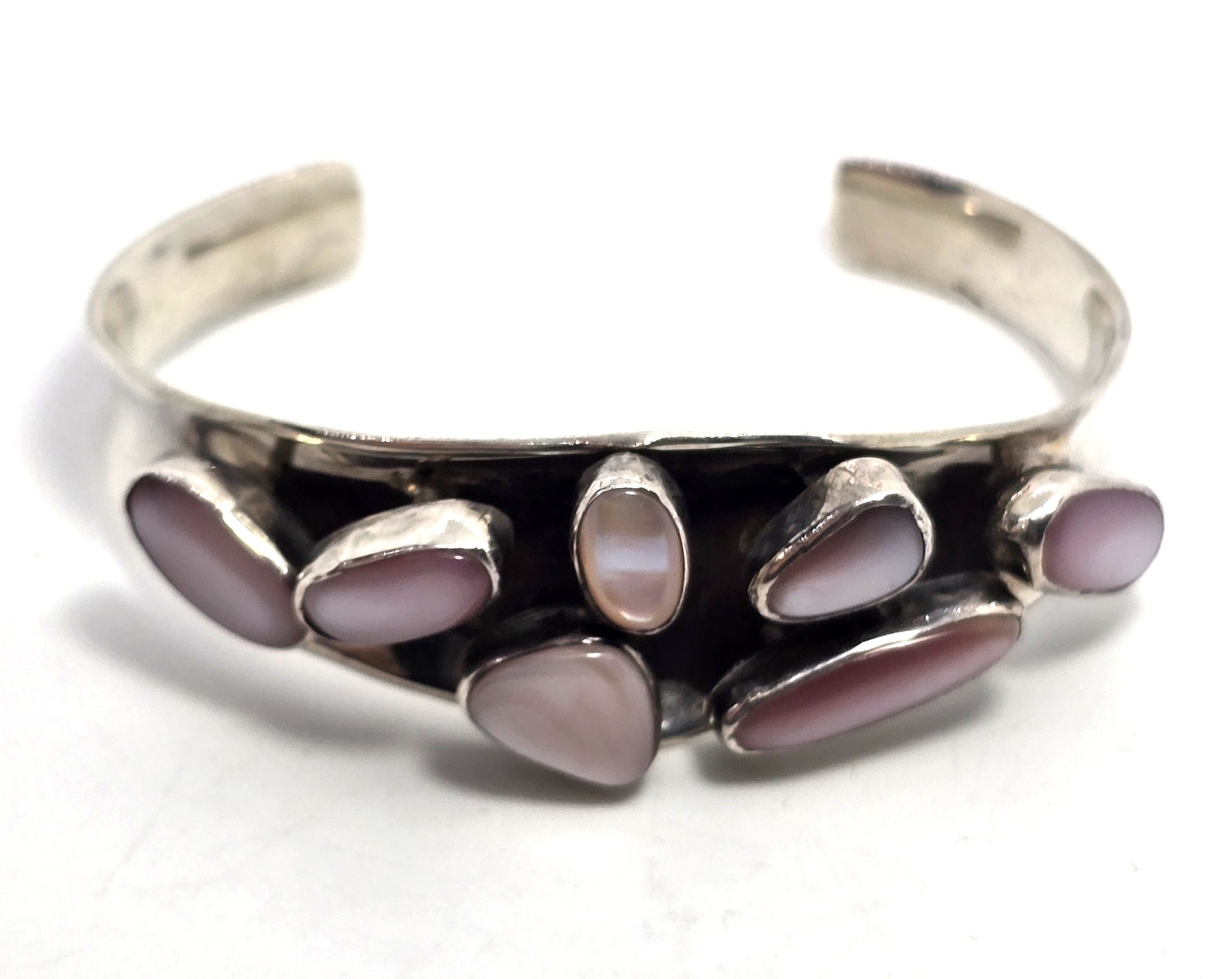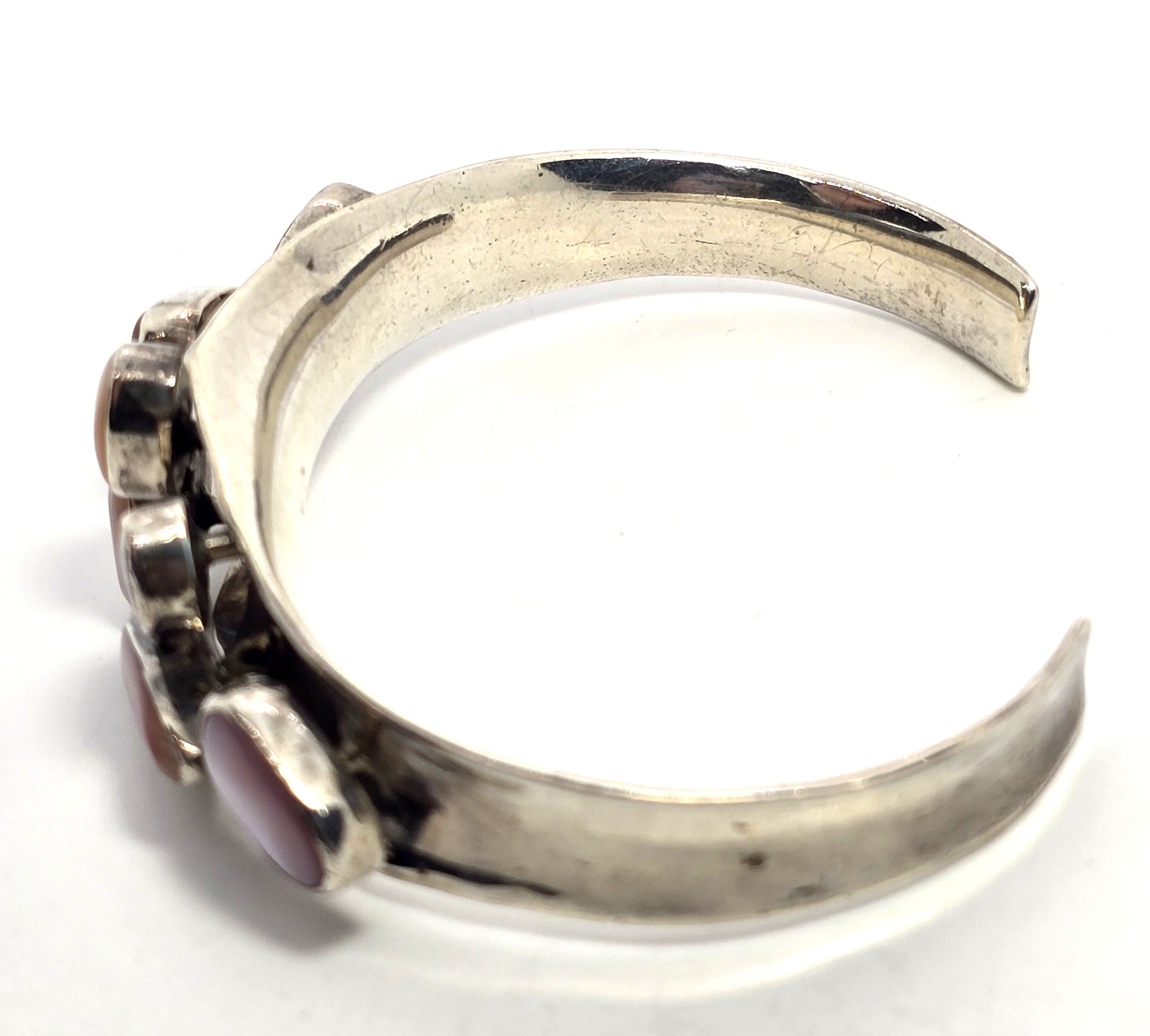 Pink slipper shell Native American vintage sterling silver MOP vintage cuff bracelet. Good used condition with little to no signs of normal wear. Great vintage patina. Seven beautiful bezel set stones. This is one of the few bracelets we have seen from this designer with so many stones. No missing stones. Stunning thick silver construction. Stamped AP on the backside of the bracelet.