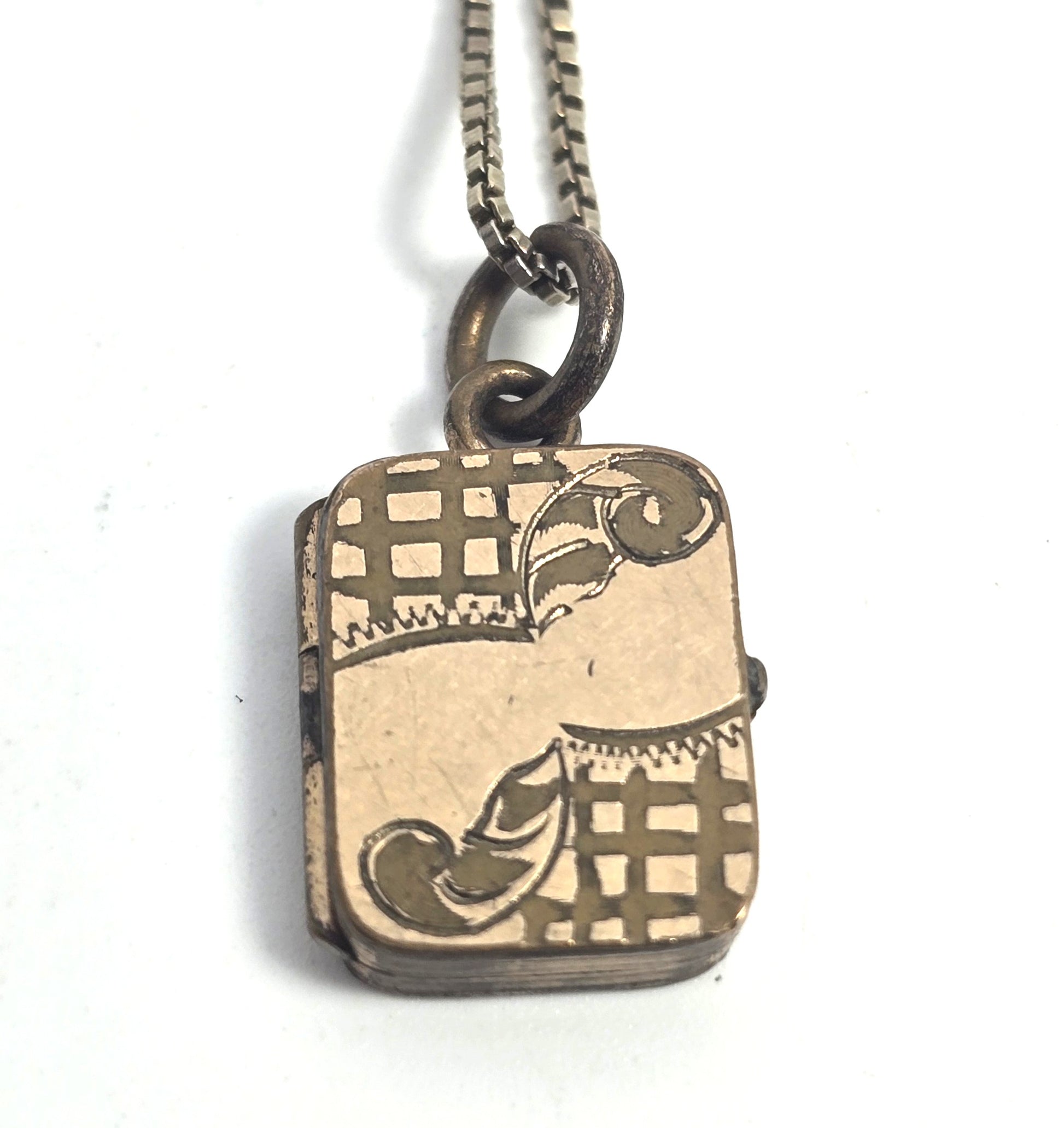 Art Deco gold filled etched box photo locket necklace with sterling chain