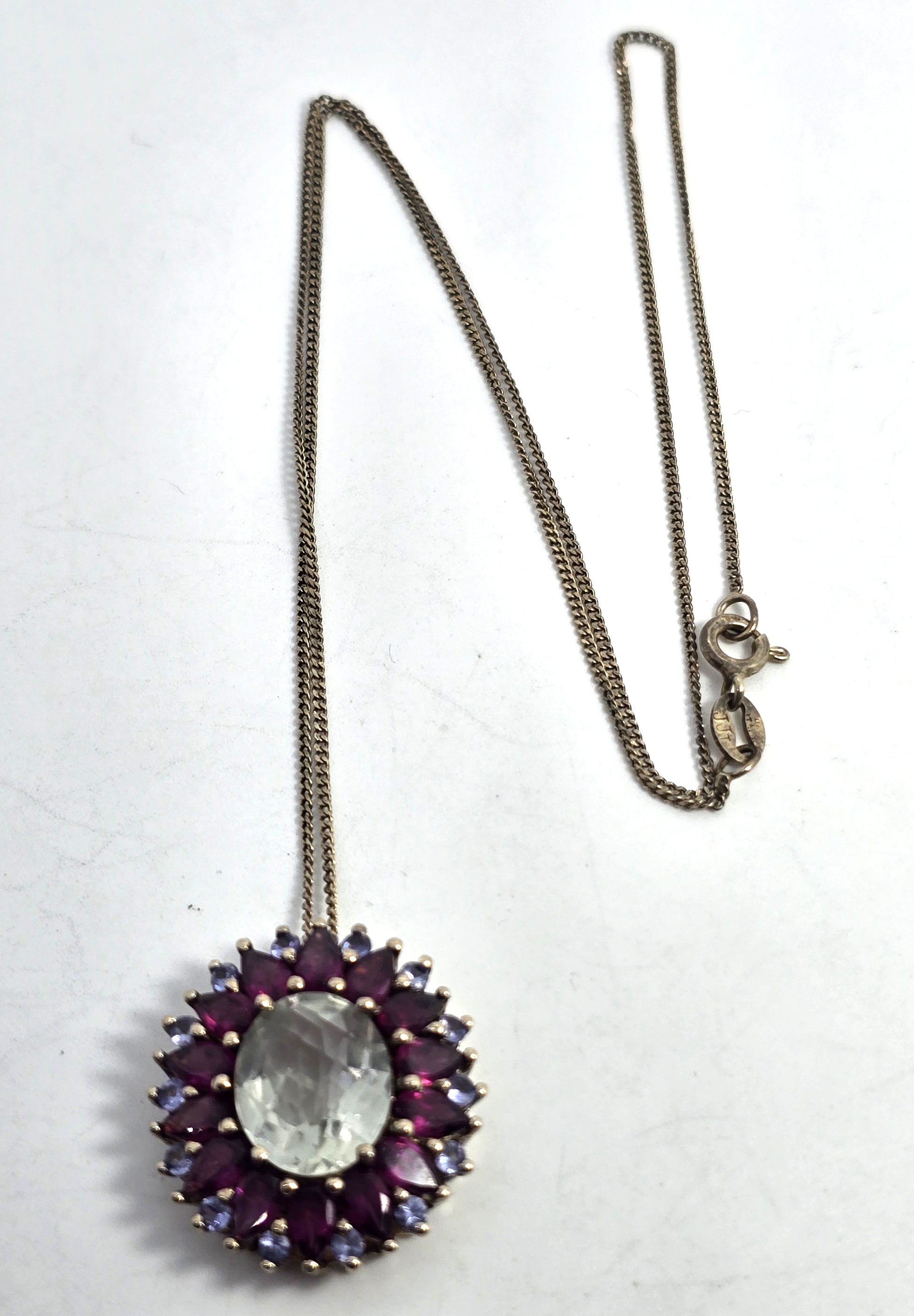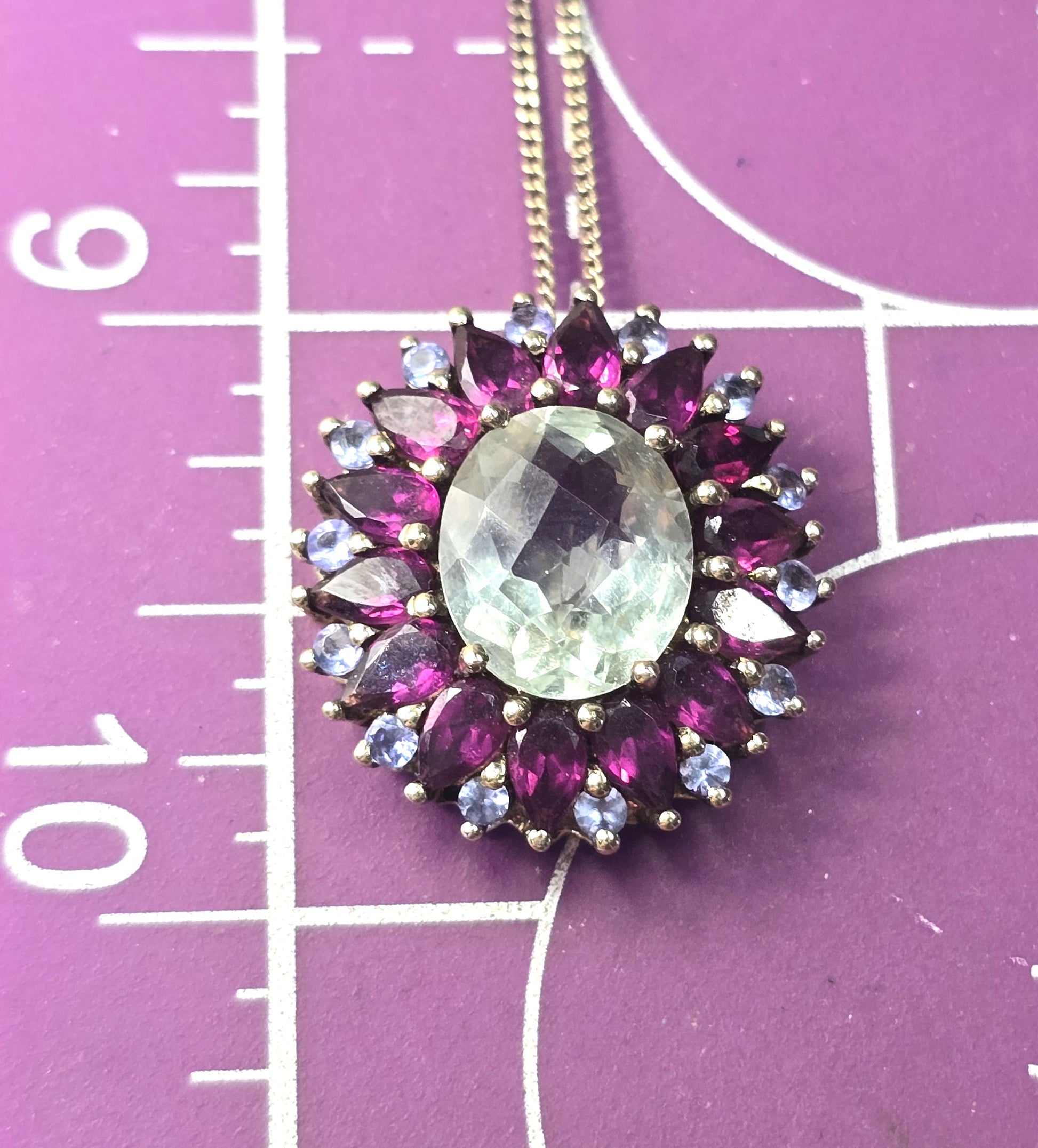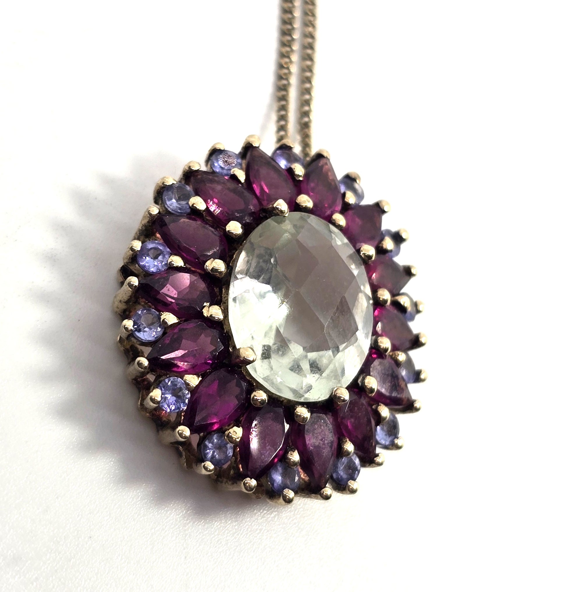 Prasiolite Green Amethyst Rhodolite Garnet tanzanite sterling silver pendant necklace. Good used condition with little to no signs of normal wear. Stamped on the back of the pendant 925 India with an unidentified hallmark. Vermeil gold over sterling silver design. Comes with sterling silver matching box spring. The center is a large faceted Prasiolite surrounded by a halo of marquis cut Rhodolite Garnet with small tanzanite accents.