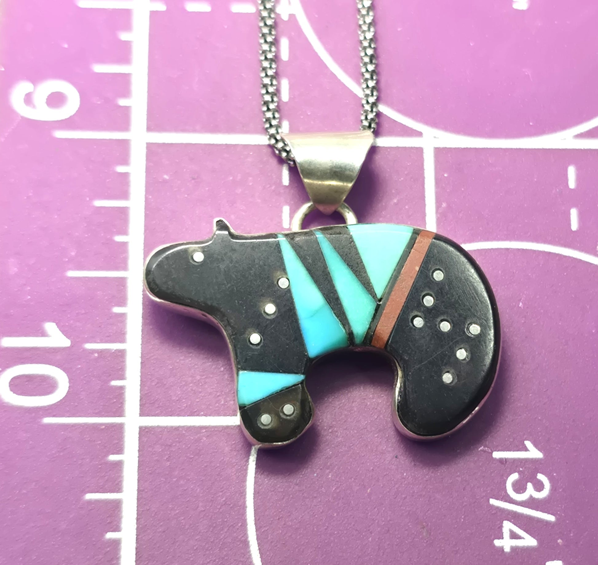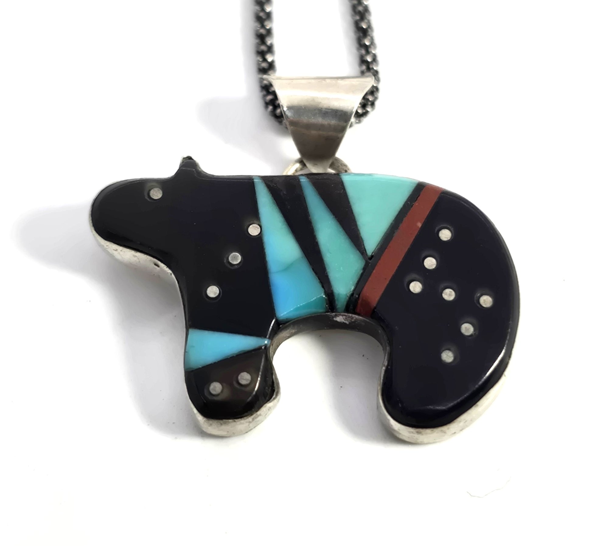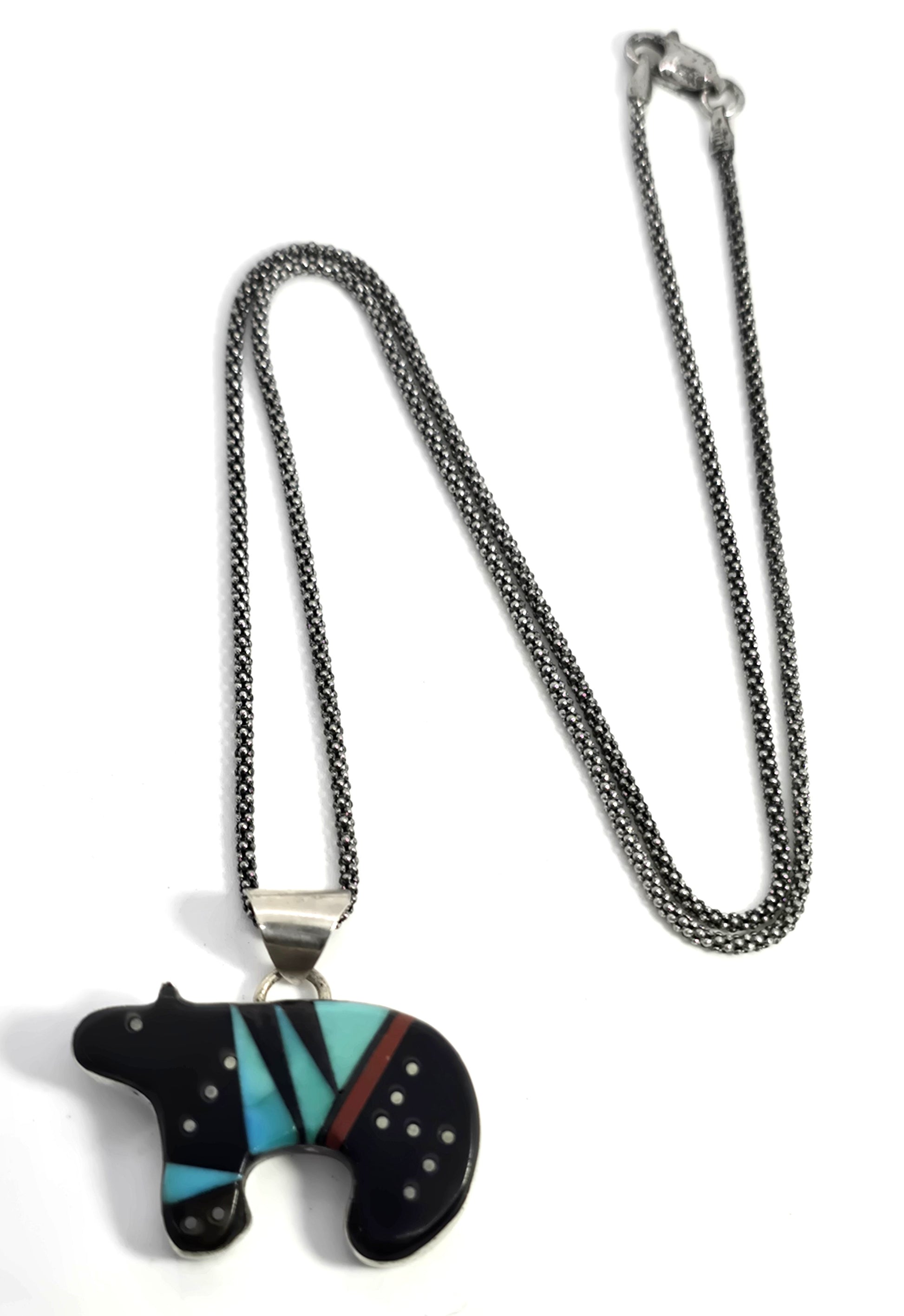 Grace Smith Navajo bear multi gemstone inlay sterling silver vintage pendant necklace