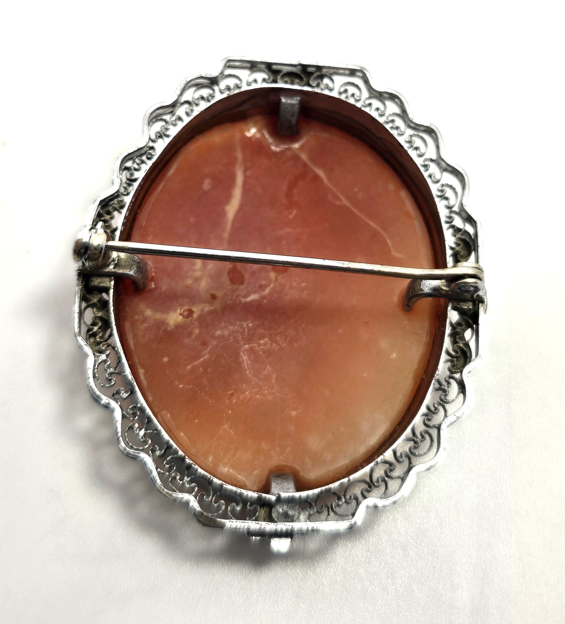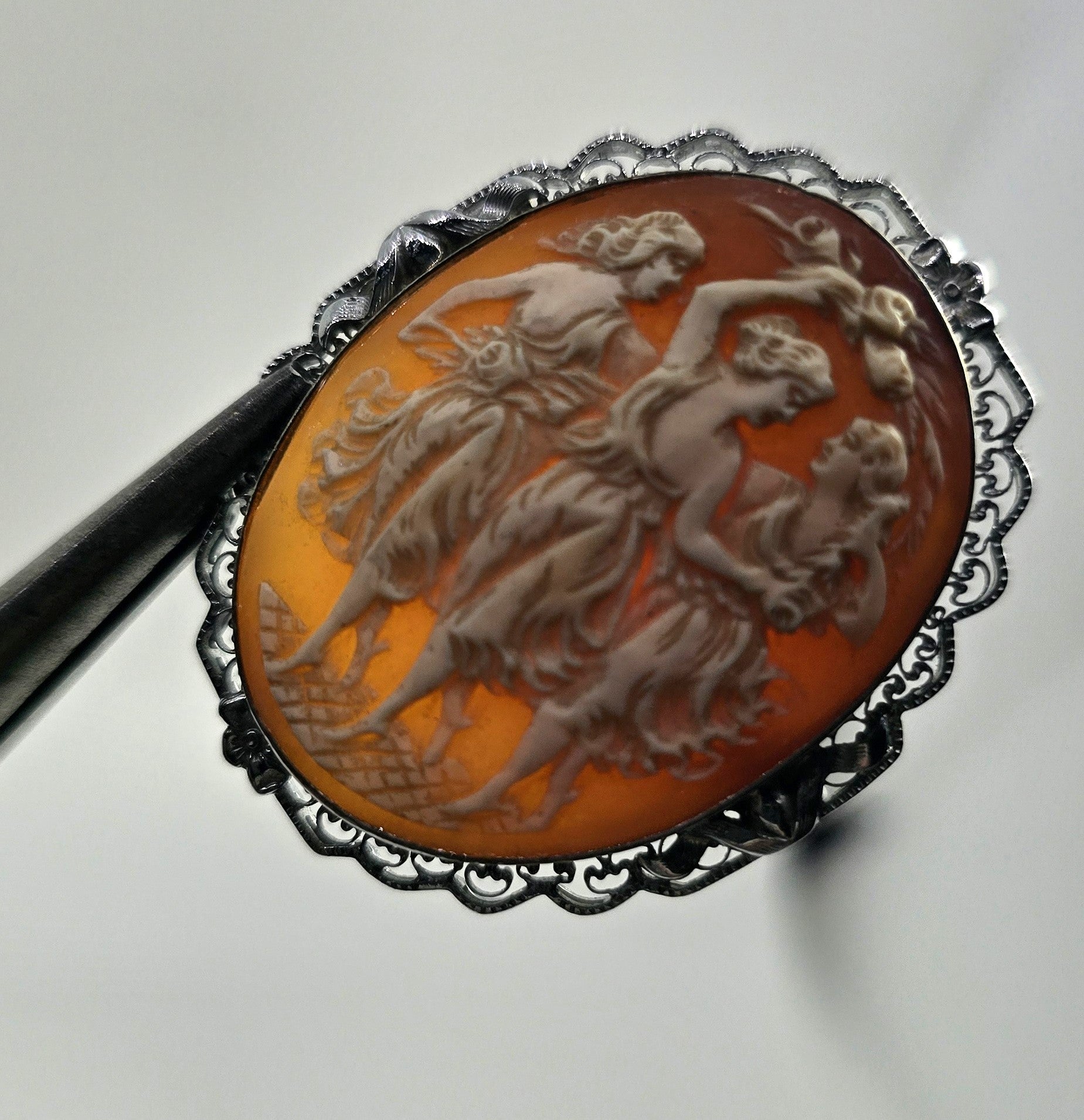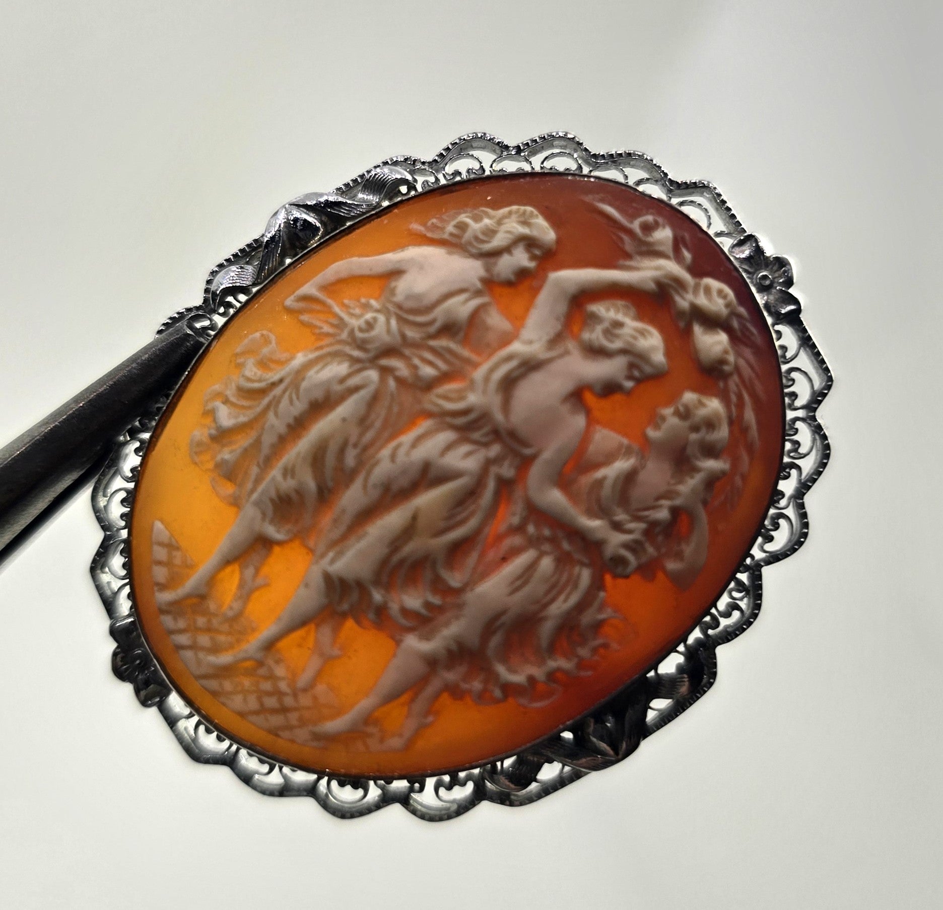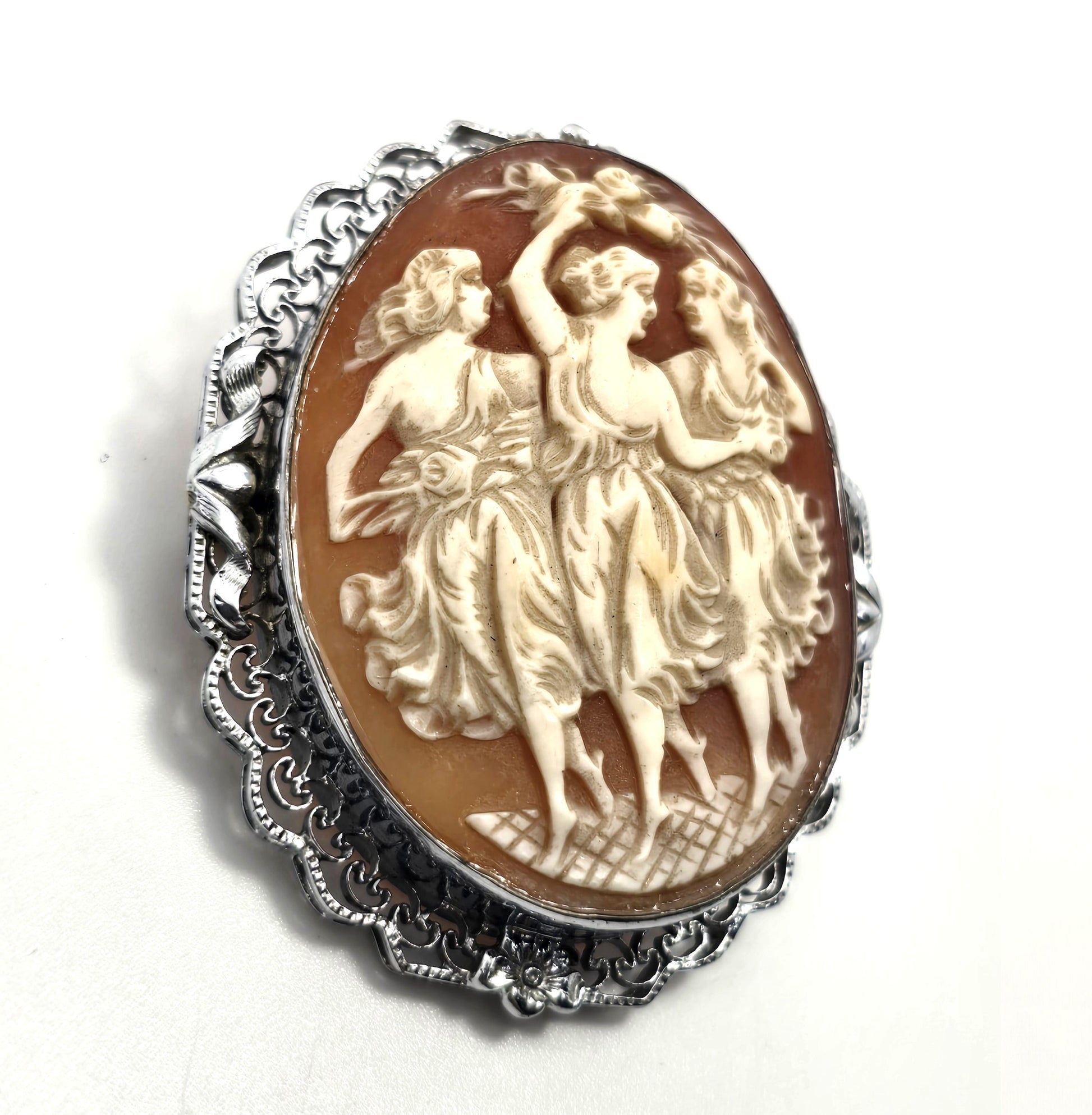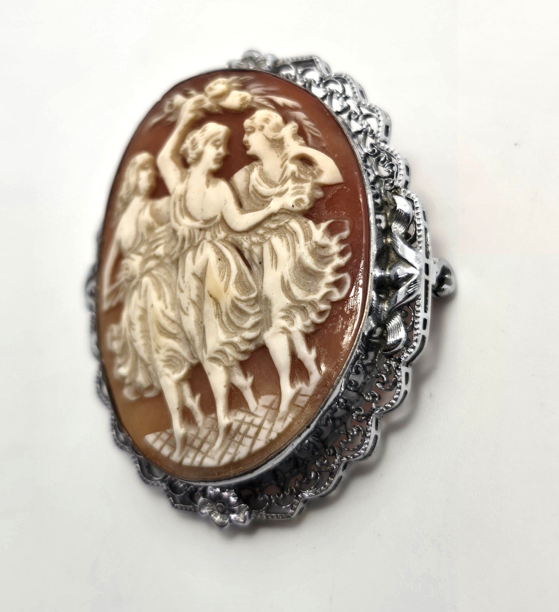 Three Graces vintage carved shell rhodium plated mid century cameo brooch