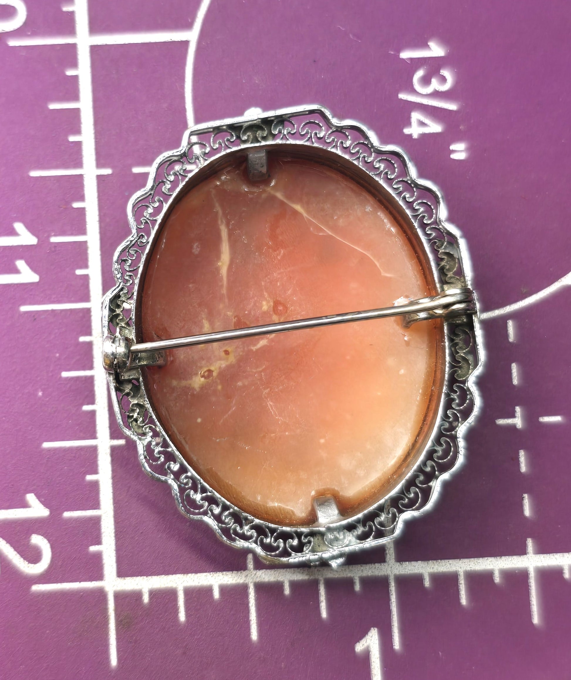 Brooch measures 1 and 5/8ths inches tall and 1 and 3/8ths of an inch wide.